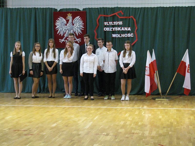 Zebrani złożyli hołd wszystkim, którzy przed laty przelewali krew, byśmy mogli żyć w wolnym, niepodległym kraju. Uczniowie klasy II gimnazjum i chór szkolny zaprezentowali program artystyczny, w którym przypomnieli najważniejsze, zwrotne momenty w dziejach narodu polskiego kroczącego ku wolności i niepodległości. Pieśni i teksty skłaniały słuchaczy  do zadumy nad minionymi wydarzeniami i refleksji na temat tego, co dziś znaczy dla Polaka słowo wolność, niepodległość.