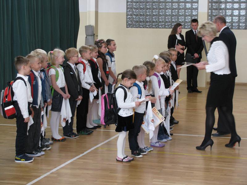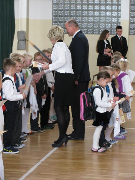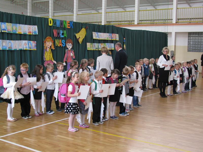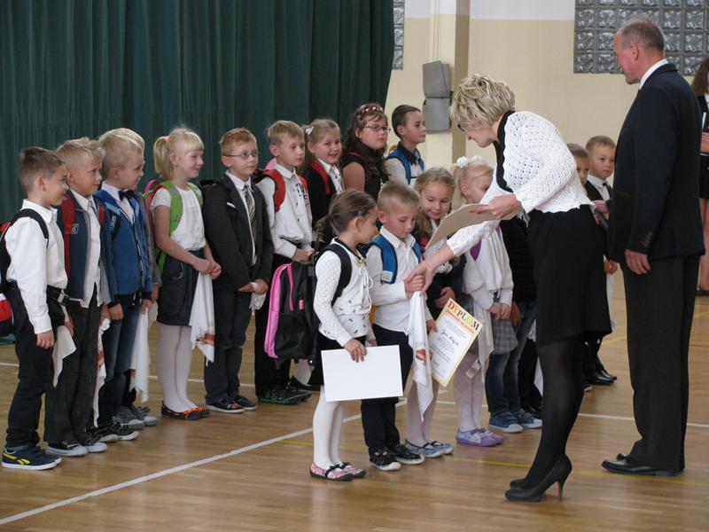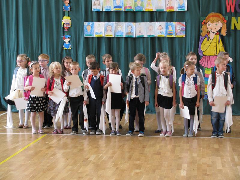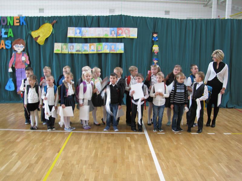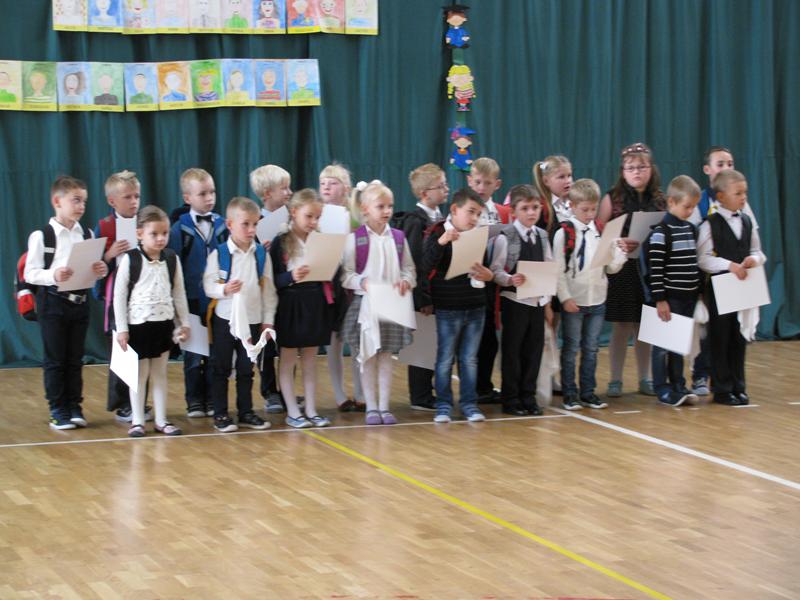 Zanim to jednak nastąpiło nasi dzielni pierwszoklasiści pokazali to, czego zdążyli się już nauczyć pod opieką swoich wychowawczyń – Sylwii Mieńkowskiej (klasa I a) oraz Anny Fatek ( klasa I b). W krótkim wystąpieniu artystycznym z wypiekami na policzkach, uśmiechem na ustach recytowali wiersze i śpiewali piosenki. Po ślubowaniu i pasowaniu ogromnym ołówkiem przez dyrektora szkoły, uczniom zostały wręczone pamiątkowe dyplomy.