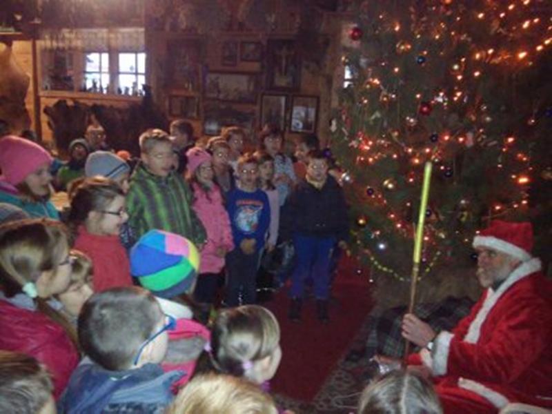Pod koniec wycieczki dzieci odwiedził długo wyczekiwany gość- Święty Mikołaj. Jak się okazało usłyszał śpiewające w lesie dzieci i postanowił je odwiedzić. Pod piękną, pachnącą choinką ustawioną w rogu chaty Mikołaj rozdawał dzieciom prezenty.