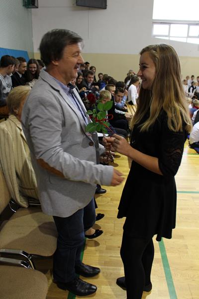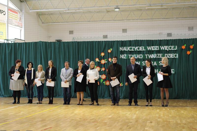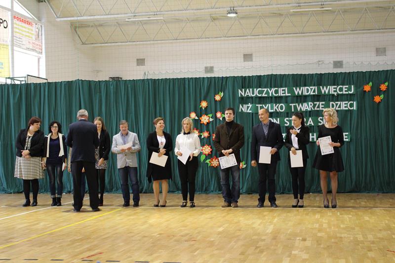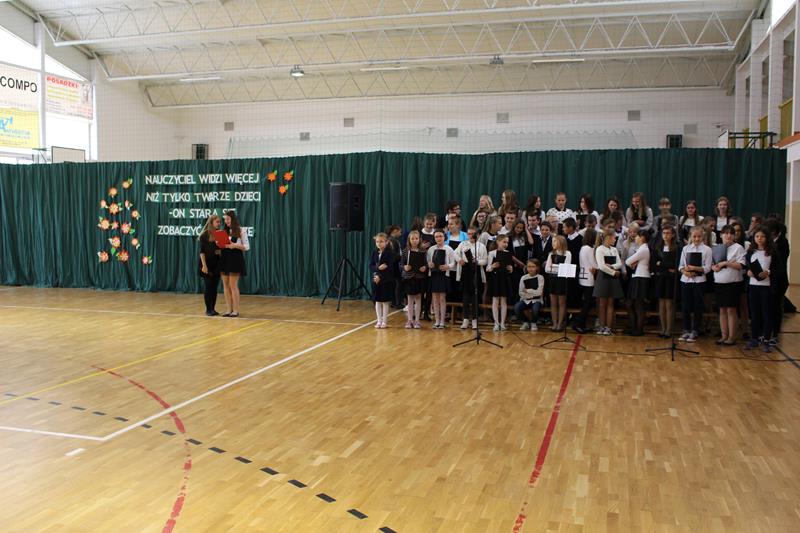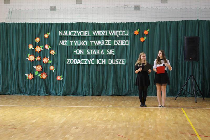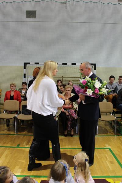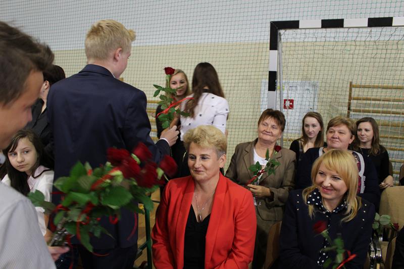 Zaprezentowali oni tło historyczne uroczystości oraz zwięzłą charakterystykę przedmiotów szkolnych. Nie zapomniano o oprawie muzycznej, którą zapewniła p. Monika Stani z chórem szkolnym. Składanym życzeniom towarzyszyły symboliczne czerwone róże. Wręczone były wszystkim pracownikom szkoły a także zaproszonym gościom przez Samorząd Uczniowski. Do życzeń dołączyli przedstawiciele Rady Rodziców. Uroczystość przebiegła w bardzo sympatycznej atmosferze.
