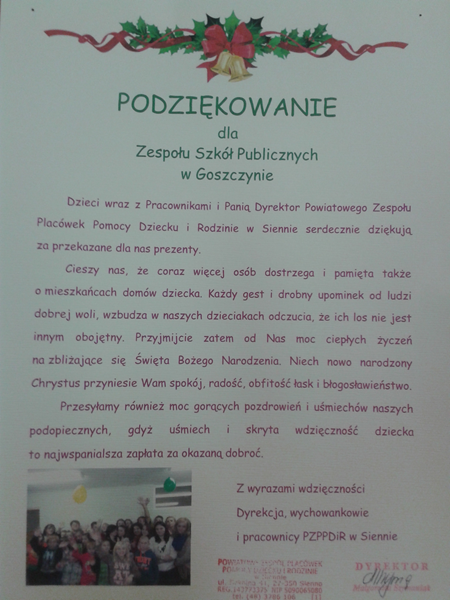 W imieniu własnym oraz podopiecznych i pracowników Domu Dziecka w Siennie składamy serdeczne podziękowania dla rodziców, nauczycieli oraz uczniów naszej szkoły za zaangażowanie i okazaną pomoc.