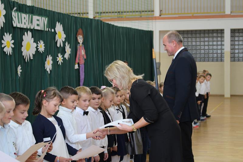 Pierwszoklasiści pod okiem swoich wychowawczyń p. Iwony Janoty i p. Małgorzaty Siedleckiej zaprezentowali krótki program artystyczny. W części oficjalnej, uczniowie złożyli uroczystą przysięgę, a następnie przez Pana Dyrektora zostali pasowani na uczniów i uczennice ZSP w Goszczynie. Na pamiątkę każdy uczeń otrzymał dyplom. Życzymy zatem wszystkim pierwszakom z okazji ich święta wszystkiego najlepszego, aby ten ich zapał do nauki trwał jak najdłużej i przekładał się na jak najlepsze zadowolenie dla Rodziców i nauczycieli.