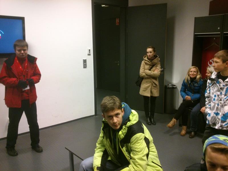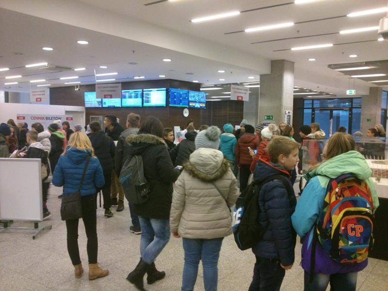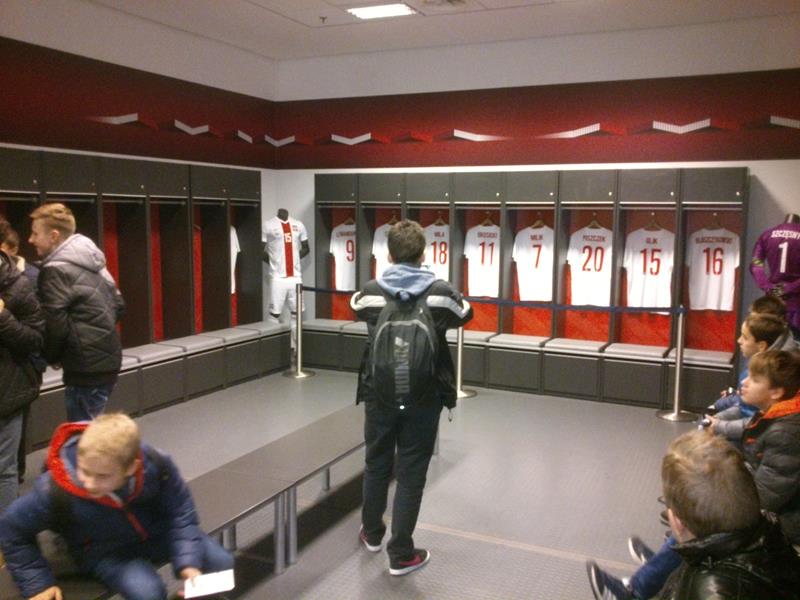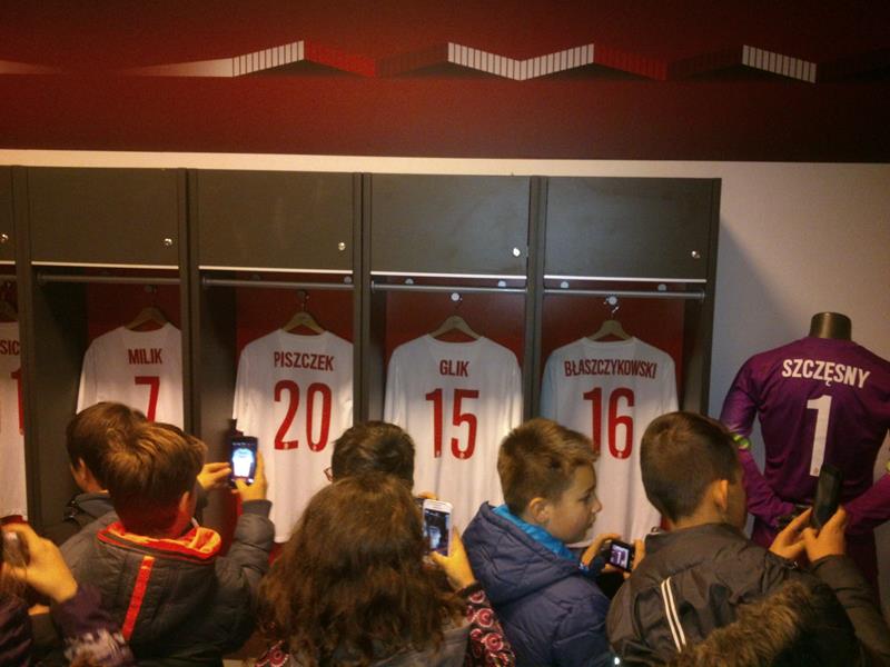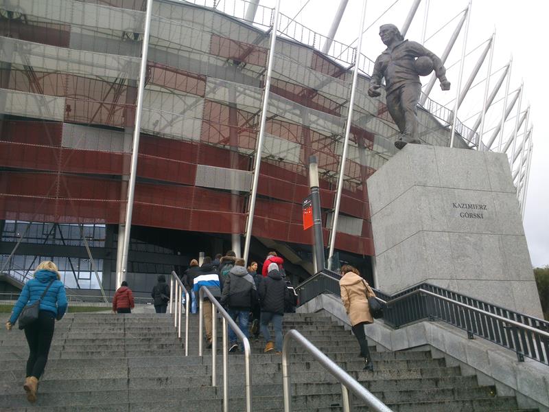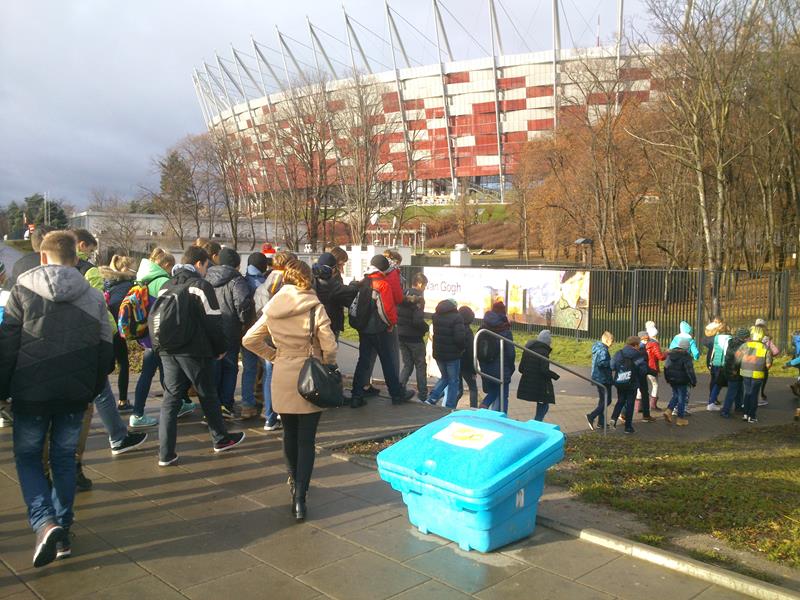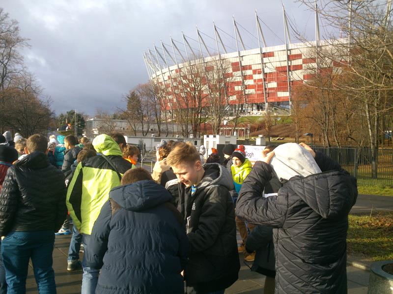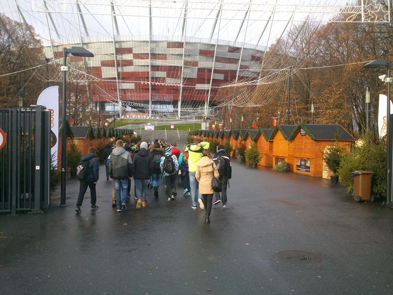 Pierwszym etapem wycieczki był Stadion PGE Narodowy. Uczniowie mieli możliwość obejrzeć zarówno trybuny, jak i pozostałe pomieszczenia stadionu, niedostępne do obejrzenia na co dzień. Przewodnik wycieczki zaznajomił uczniów z podstawowymi informacjami na temat budowy stadionu – genezy jego powstania, przeznaczenia obiektu oraz możliwości objętościowych budowli. Uczniowie zwiedzili nie tylko trybuny, ale również szatnie, salę konferencyjną, salę bankietową czy studio pracy dziennikarzy.