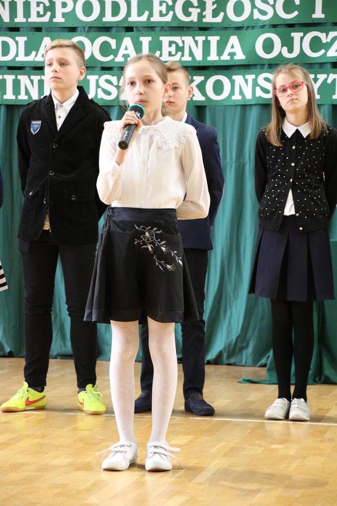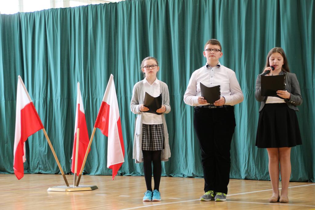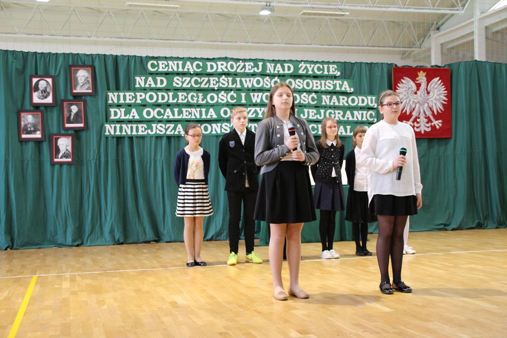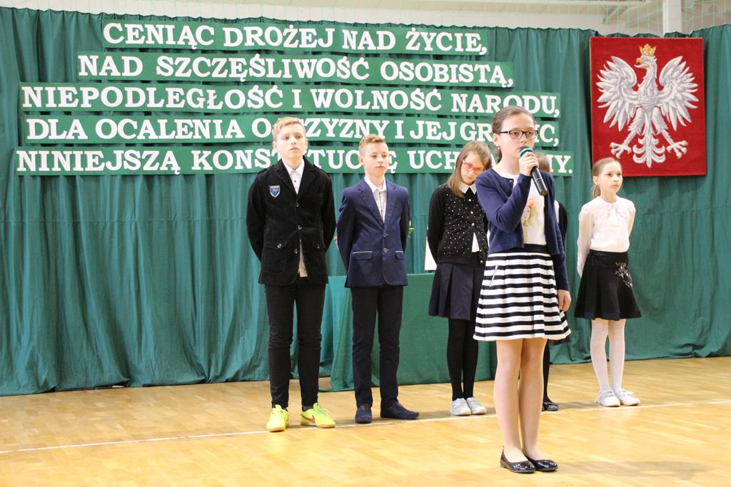 Akademia rozpoczęła się uroczystym wprowadzeniem sztandaru szkoły oraz odśpiewaniem hymnu państwowego. Program artystyczny, przygotowany przez klasę V a, przybliżył uczniom naszej szkoły historię tego jakże ważnego dla kraju wydarzenia. Nie zabrakło również poetyckich reminiscencji Święta Konstytucji 3 Maja oraz patriotycznych pieśni.