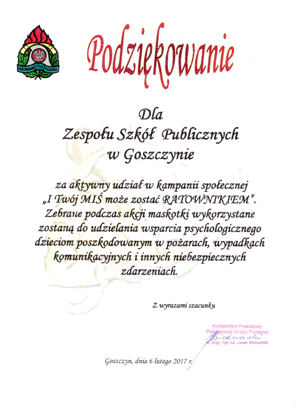 Podziękowanie dla Zespołu Szkół Publicznych w Goszczynie za aktywny udział w kampanii społecznej "I Twój MIŚ może zostać RATOWNIKIEM". Zebrane podczas akcji maskotki wykorzystane zostaną do udzielania wsparcia psychologicznego dzieciom poszkodowanym w pożarach, wypadkach komunikacyjnych i innych niebezpiecznych zdarzeniach.