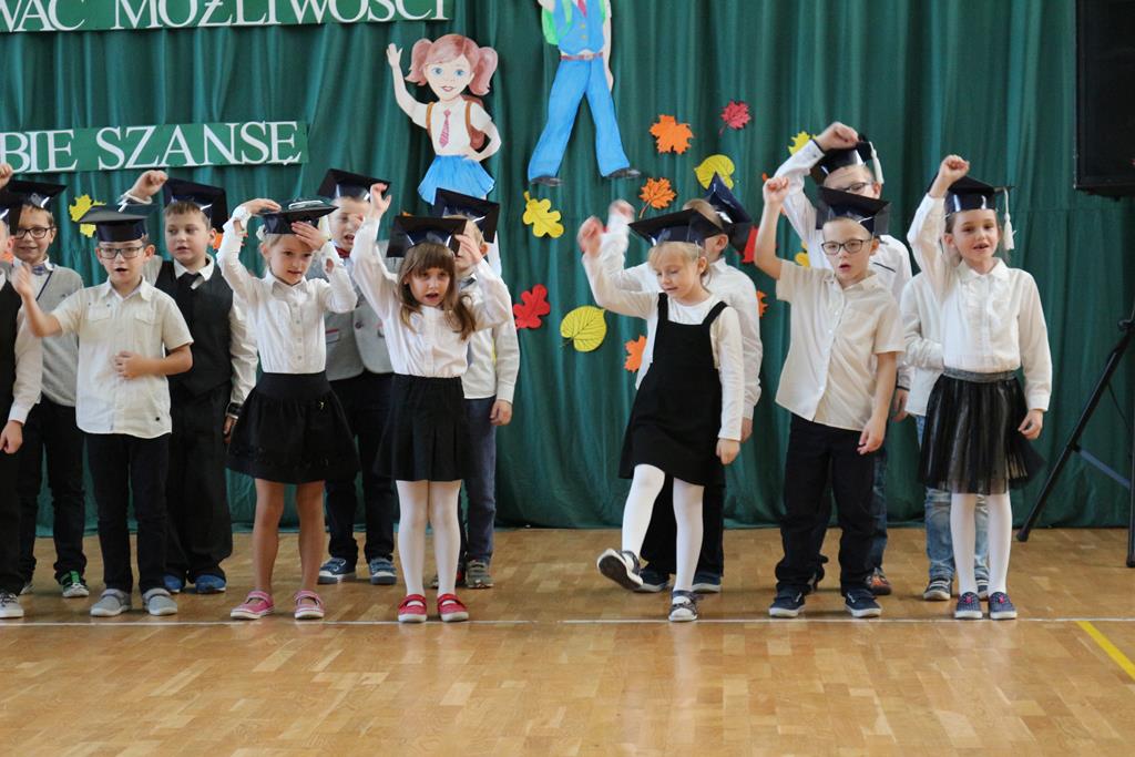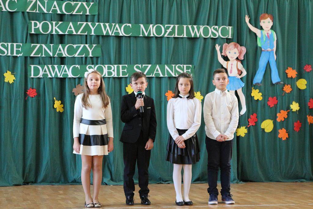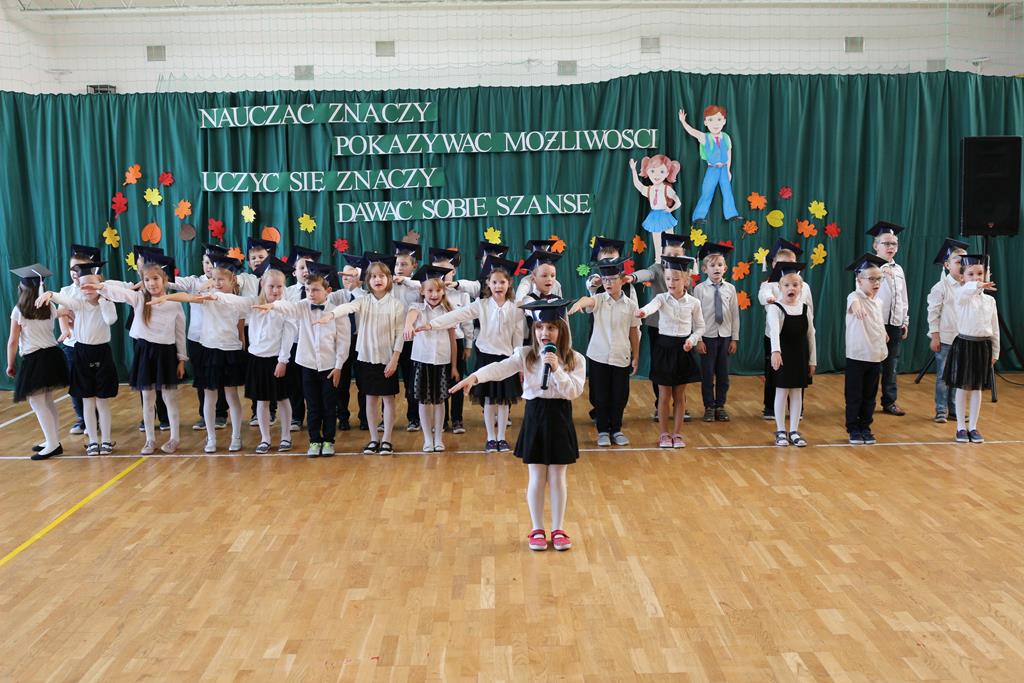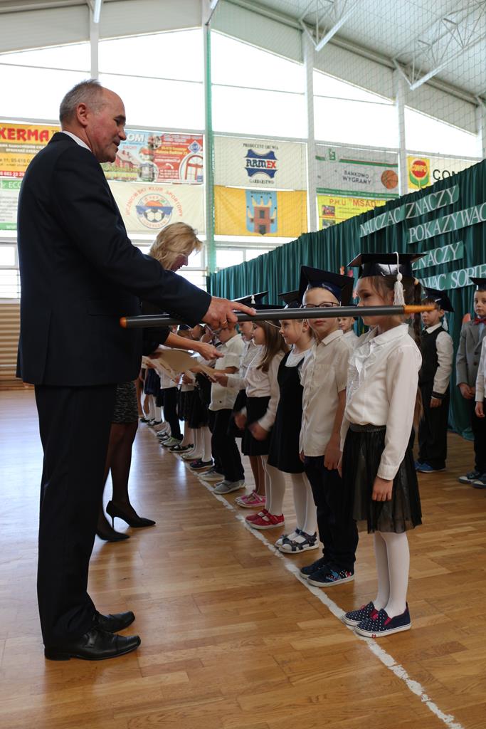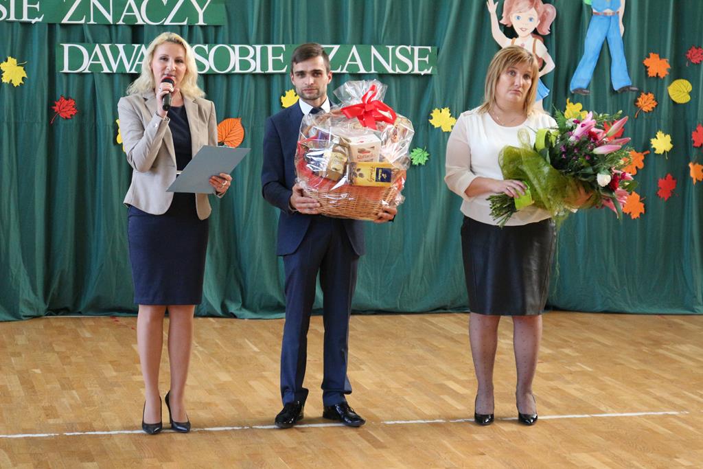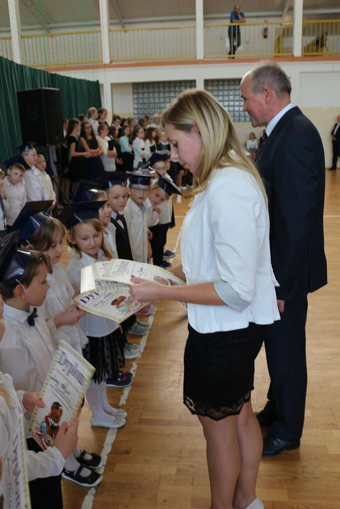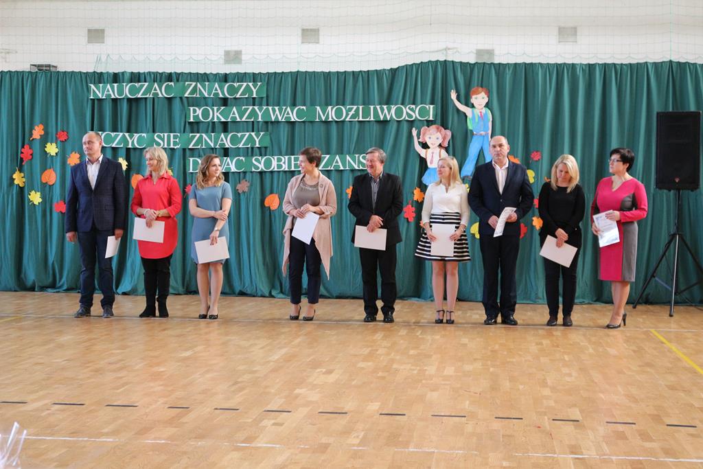 Część artystyczną zakończyły życzenia i podziękowania kierowane do nauczycieli. Głos zabrał Pan Wójt Sławomir Słabuszewski, przewodnicząca Rady Rodziców Pani Żaneta Wrzesień oraz Dyrektor PSP Pan Mariusz Wangryn, który wręczył wybranym nauczycielom dyplomy uznania oraz Nagrody Dyrektora.