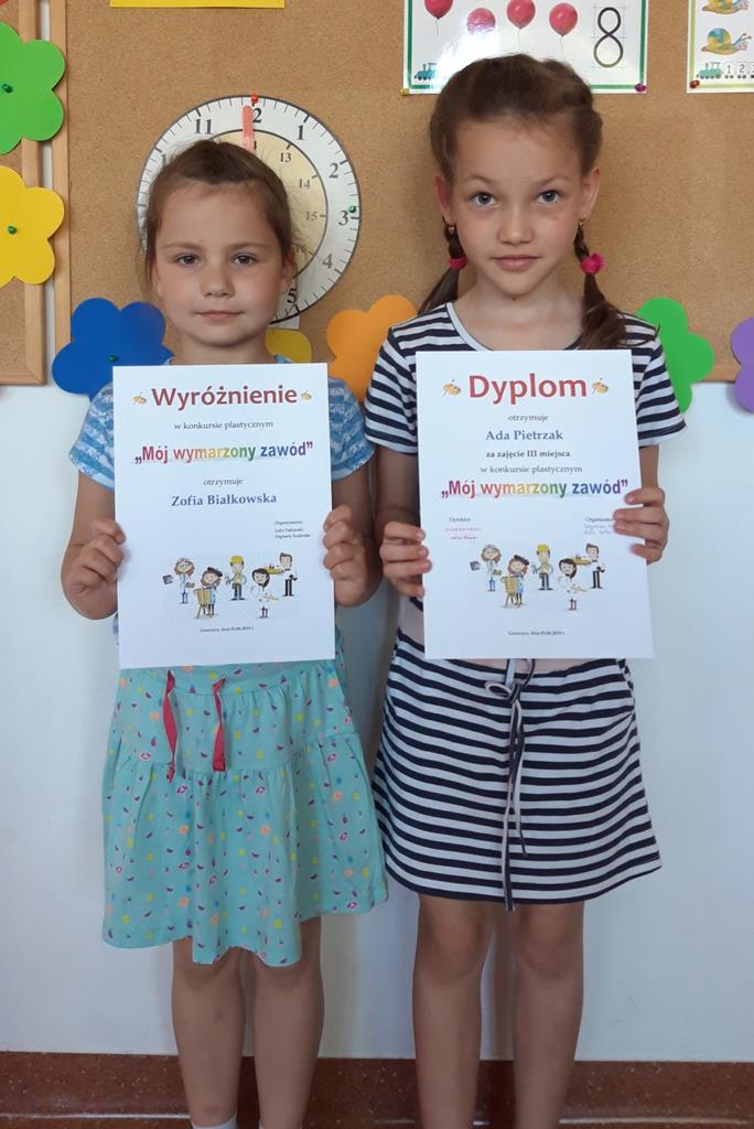Jest nam niezmiernie miło ogłosić wyniki konkursu plastycznego zorganizowanego w ostatnich dniach maja w zakresie doradztwa zawodowego pt. "Mój wymarzony zawód". Zadaniem uczestnika konkursu (przedszkolaków oraz uczniów klas I-III) było plastyczne przedstawienie własnych wyobrażeń na temat wybranego przez siebie zawodu i zaprezentowanie pracy, jaką autor chciałby wykonywać w przyszłości lub która obecnie budzi jego szczególne zainteresowanie.