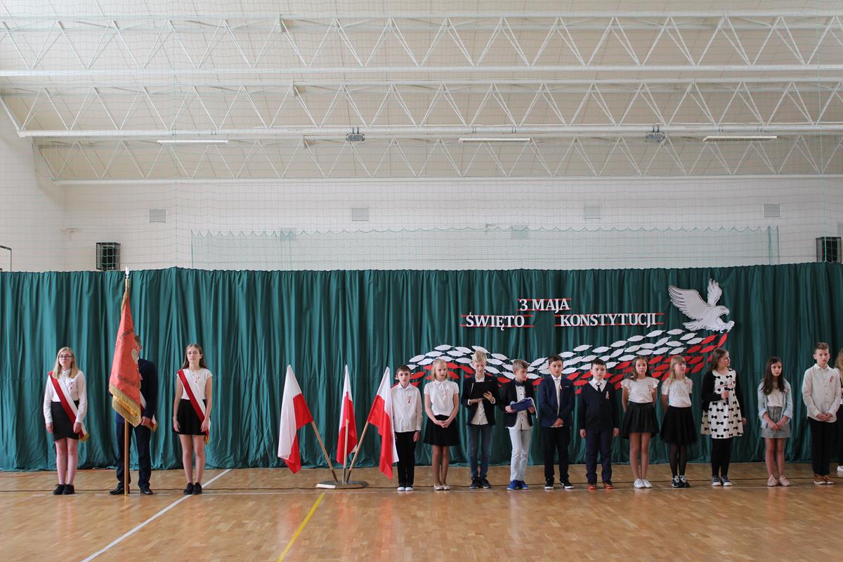 Dnia 6 maja 2019 roku społeczność Publicznej Szkoły Podstawowej w Goszczynie świętowała kolejną rocznicę uchwalenia Konstytucji 3 Maja. By podkreślić patriotyczny charakter uroczystości, wszyscy zebrani przybyli na halę z przypiętymi do piersi biało-czerwonymi kotylionami. Wspólne świętowanie rozpoczęliśmy od uroczystego wprowadzenia sztandaru szkoły i odśpiewania hymnu narodowego. Następnie uczniowie klasy 5 b i chór szkolny zaprezentowali część artystyczną. W wierszach i piosenkach opowiedzieli zebranym o doniosłym i ważnym dla Polski wydarzeniu uchwalenia Konstytucji 3 Maja. Odwołując się do przeszłości zachęcali, by pielęgnować jej zdobycze i poprzez pamięć, poszanowanie i dumę celebrować swoją polskość na co dzień. Mamy nadzieję, że ta krótka lekcja historii na długo pozostanie w pamięci społeczności szkolnej.