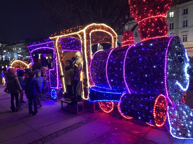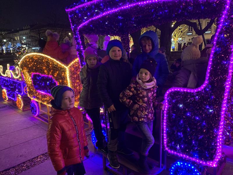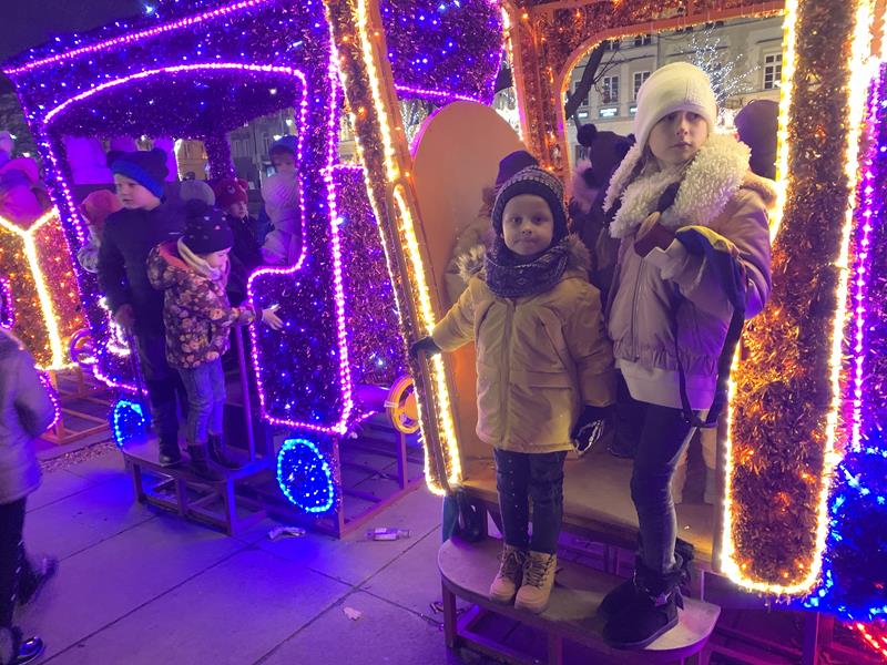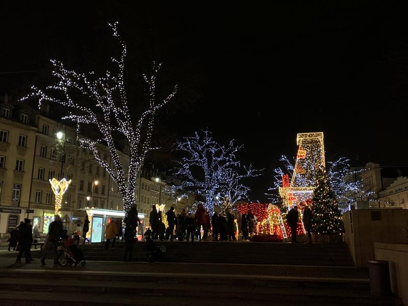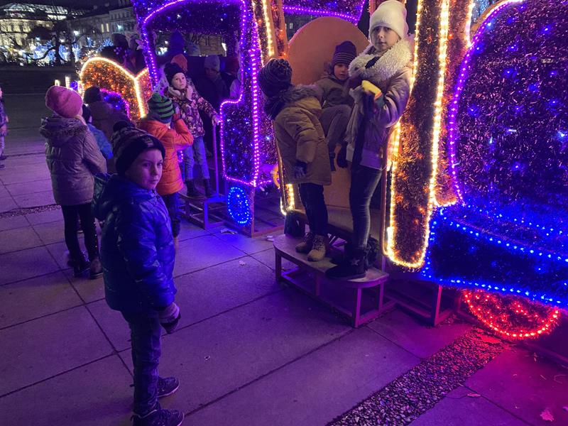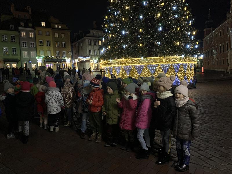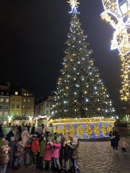 Ostatnim punktem wyjazdu był spacer po Nowym Świecie, Krakowskim Przedmieściu i Placu Zamkowym. Dzieci z zachwytem oglądały wspaniałe iluminacje świetlne, gwiazdy, choinki a nawet miały okazję zrobić sobie zdjęcie ze świętym Mikołajem w wspaniałej świątecznej scenerii. W trakcie spaceru odwiedziliśmy Grób Nieznanego Żołnierza a także byliśmy pod Pałacem Prezydenckim. Nasz spacer zakończył się na Placu Zamkowym gdzie podziwialiśmy przepięknie oświetlony Zamek Królewski i wspaniałą choinkę. Wszystkie dzieci stwierdziły że Warszawa w świątecznej scenerii wygląda przepięknie.