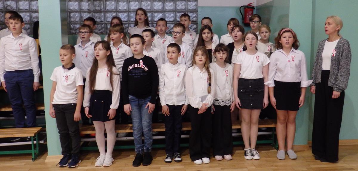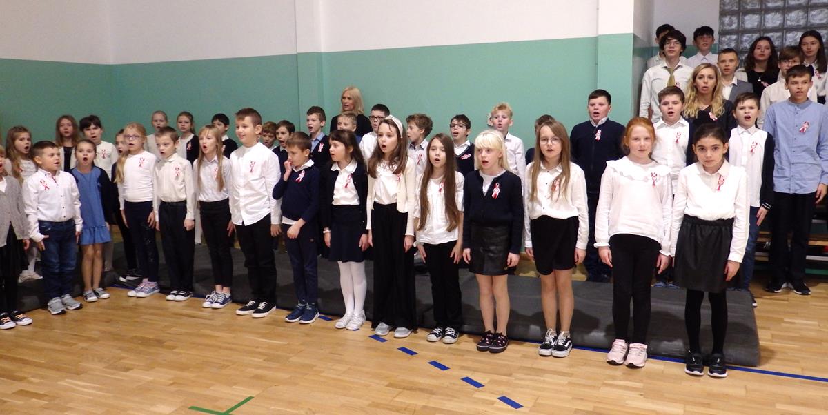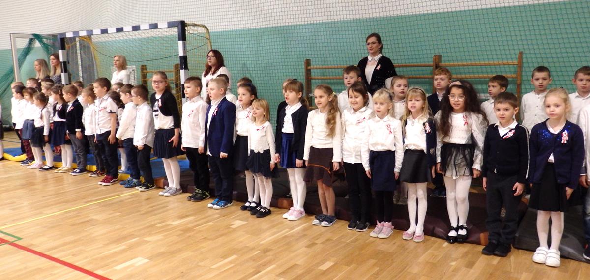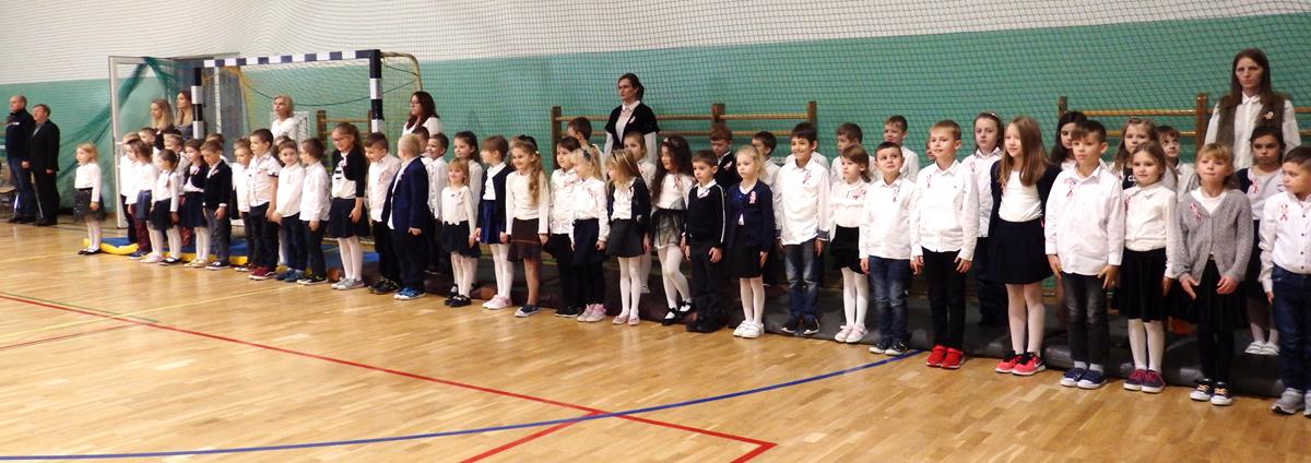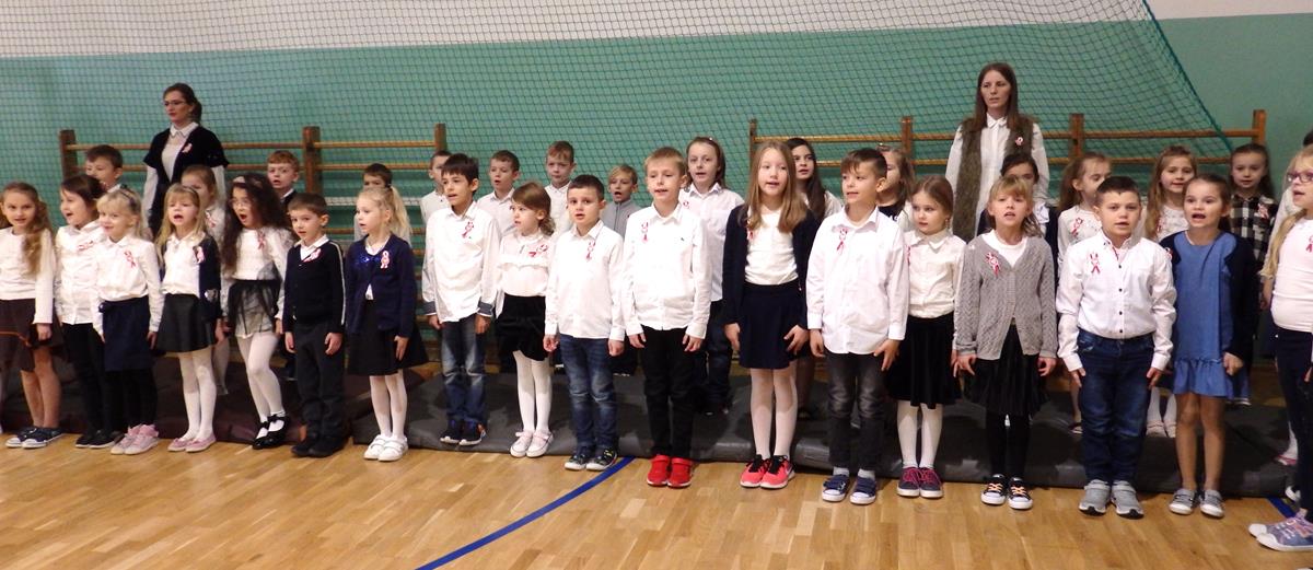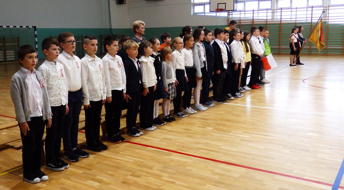 Wszyscy uczniowie i nauczyciele wzięli udział w uroczystym apelu. Główny ciężar przygotowania i prowadzenia uroczystości wzięli na siebie uczniowie z klasy 5B pod kierunkiem nauczycieli: p. Moniki Piekarskiej, p. Karoliny Grzechnik i p. Agaty Gajewskiej.