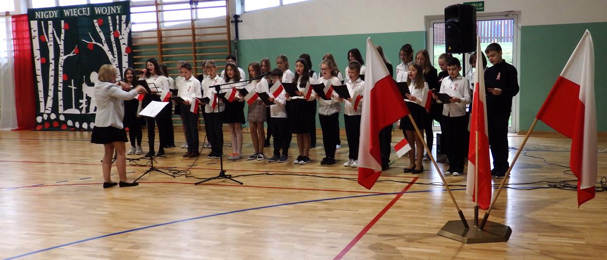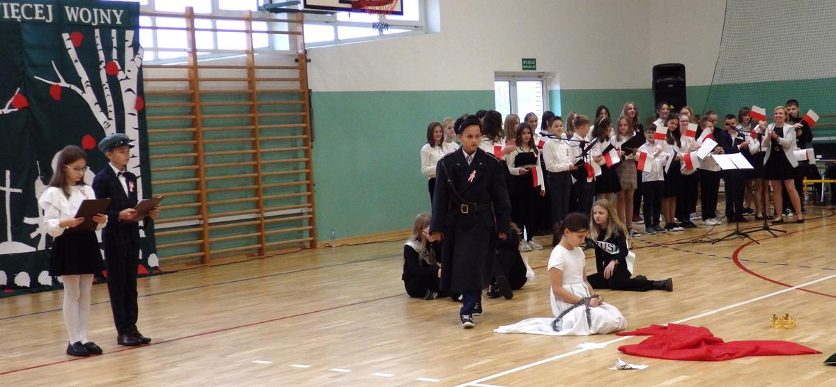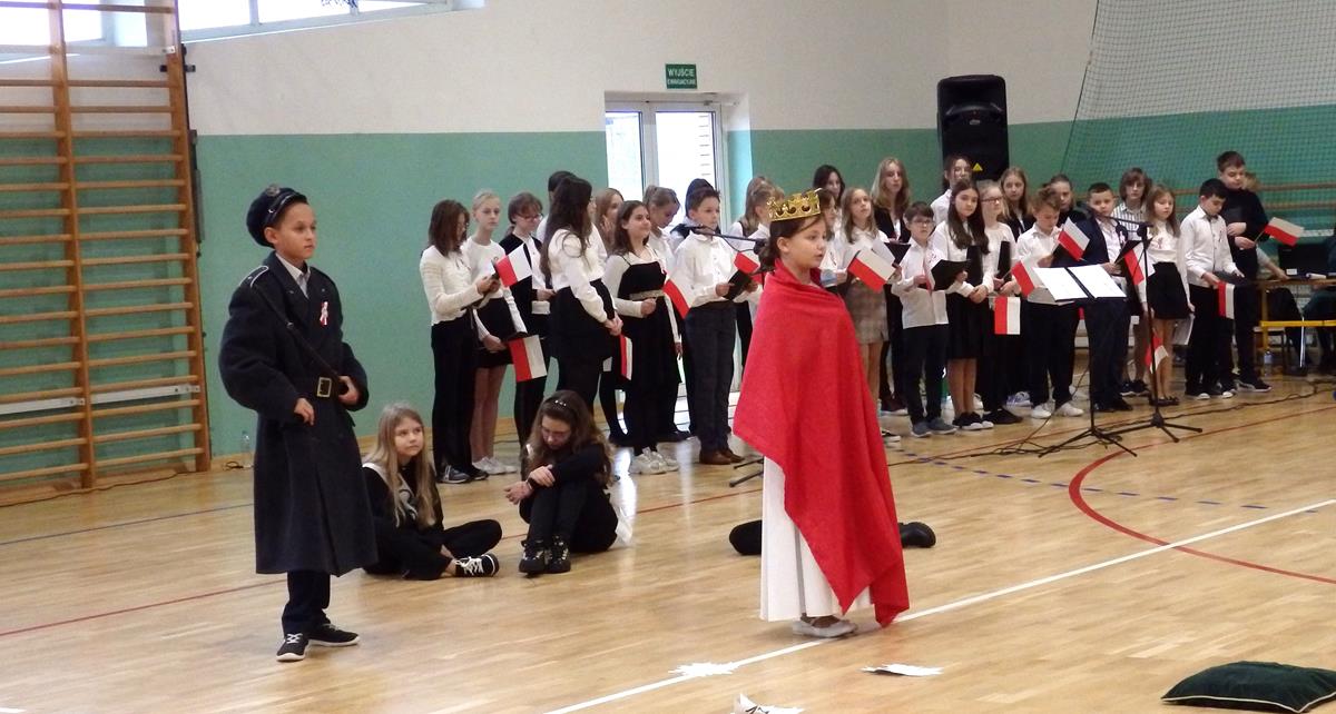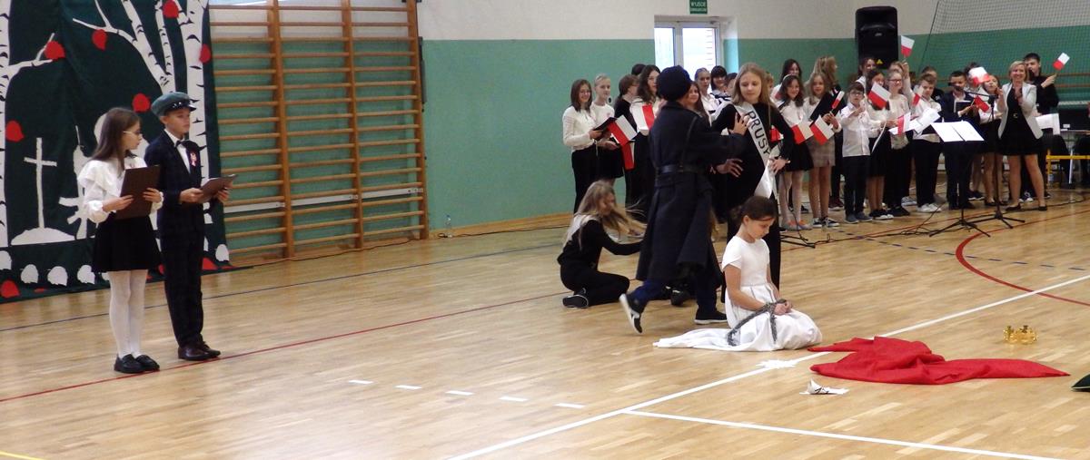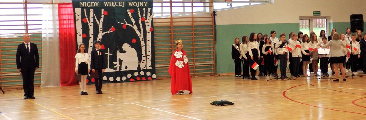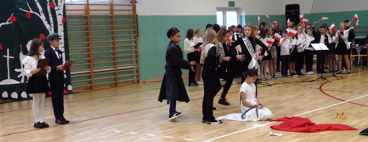 Prowadzący przedstawili krótką historię Polski. Przypomnieli czasy świetności Rzeczypospolitej, upadek naszego państwa - rozbiory, polskie powstania narodowe w XIX wieku i okoliczności odzyskania niepodległości przez Polskę w dniu 11 listopada 1918 roku. Słowa prowadzących przeplatane były scenkami obrazującymi utratę i odzyskanie niepodległości, pieśniami i piosenkami („Ojczyzno ma” księdza Karola Dąbrowskiego, „Pytasz mnie” Andrzeja Rosiewicza, „Mury” Jacka Kaczmarskiego, „Sen o Warszawie” Czesława Niemena i „Rotę” Marii Konopnickiej) wykonanymi przez chór szkolny oraz wierszami (m.in. „Moja piosnka” Cypriana Kamila Norwida).
