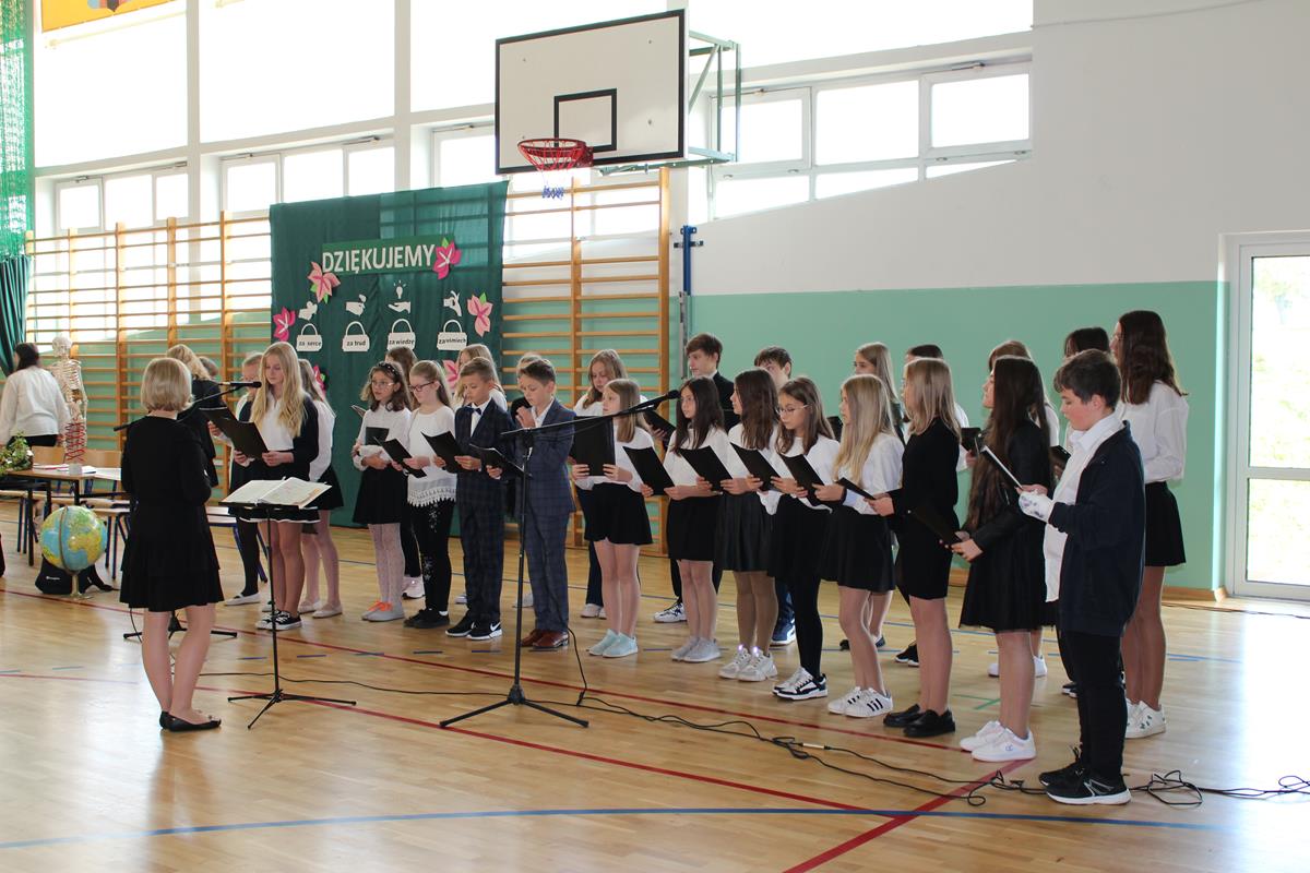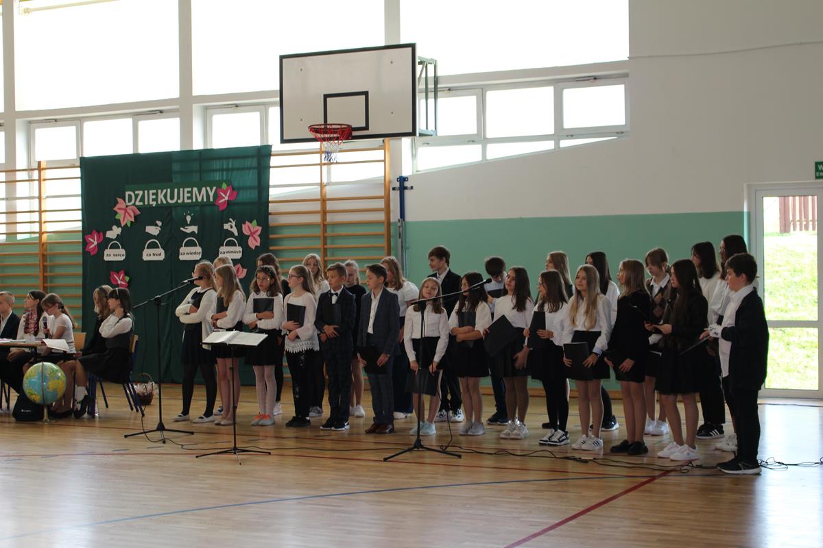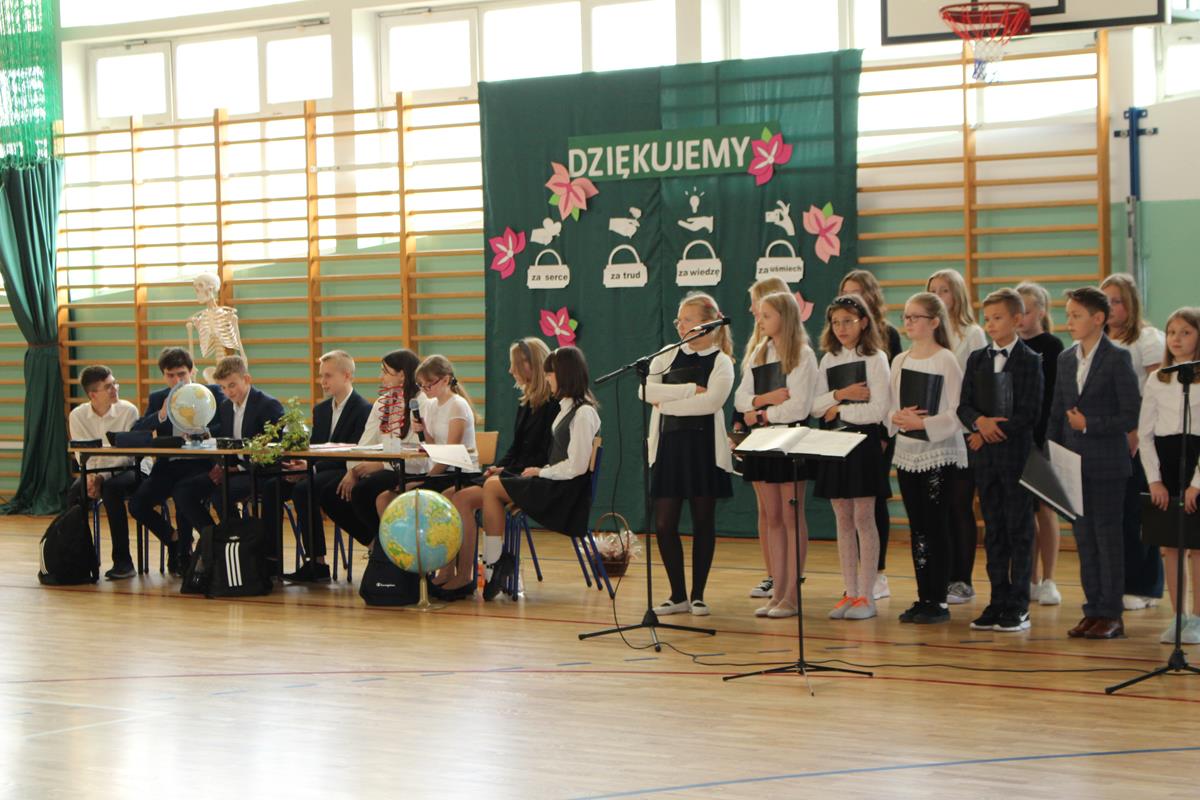 17 października społeczność naszej szkoły uczestniczyła w uroczystym apelu z okazji Dnia Edukacji Narodowej, zorganizowanym przez Samorząd Szkolny i jego opiekunów. W programie artystycznym wystąpili uczniowie klas 8A i 8B, oraz chór szkolny, wśród którego wspaniale zaprezentowały się trzy solistki. Ósmoklasiści włożyli wiele trudu w to, aby uczynić ten dzień wyjątkowo uroczystym. Nie zabrakło wierszy wyrażających wdzięczność za trud włożony przez nauczycieli w swoją pracę, jak i zabawnych żartów o szkole, które wywołały uśmiech na twarzach zgromadzonej publiczności. Po części artystycznej głos zabrał Pan Dyrektor – złożył życzenia wszystkim pracownikom szkoły, oraz nagrodził nauczycieli za wyróżniającą pracę w poprzednim roku szkolnym. Następnie życzenia popłynęły od Rady Rodziców. Samorząd Szkolny przygotował dla wszystkich pracowników naszej szkoły drobne upominki w postaci aromatycznych herbatek, które z pewnością umilą jesienne dni.