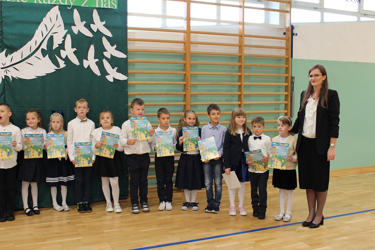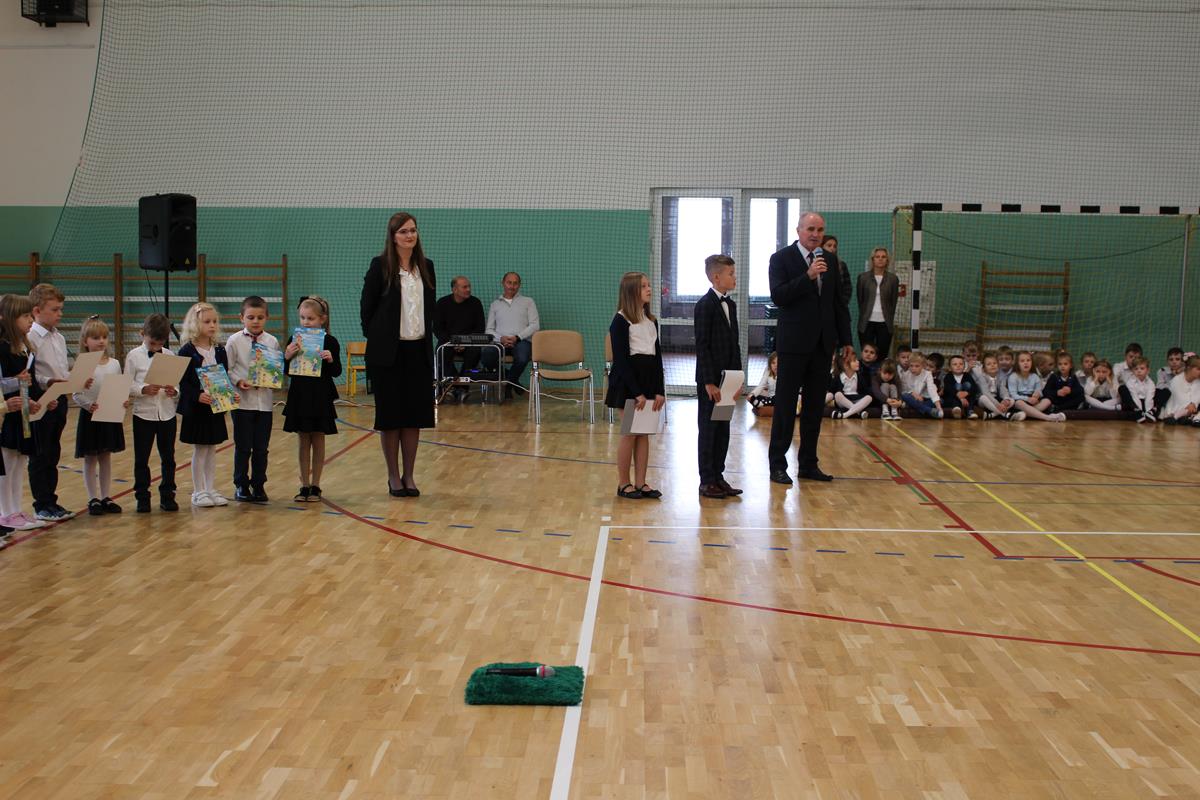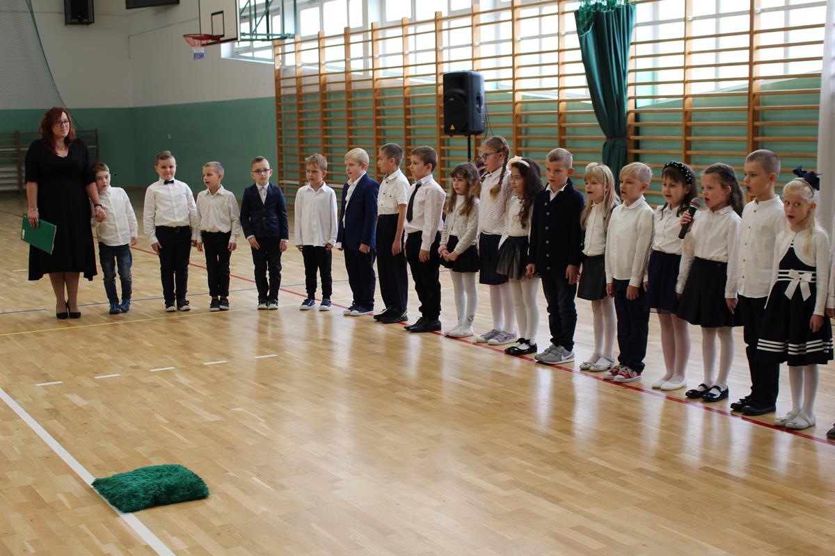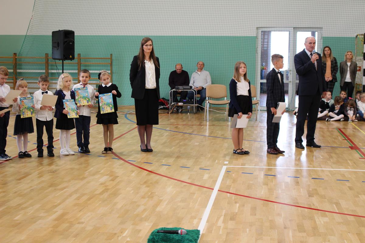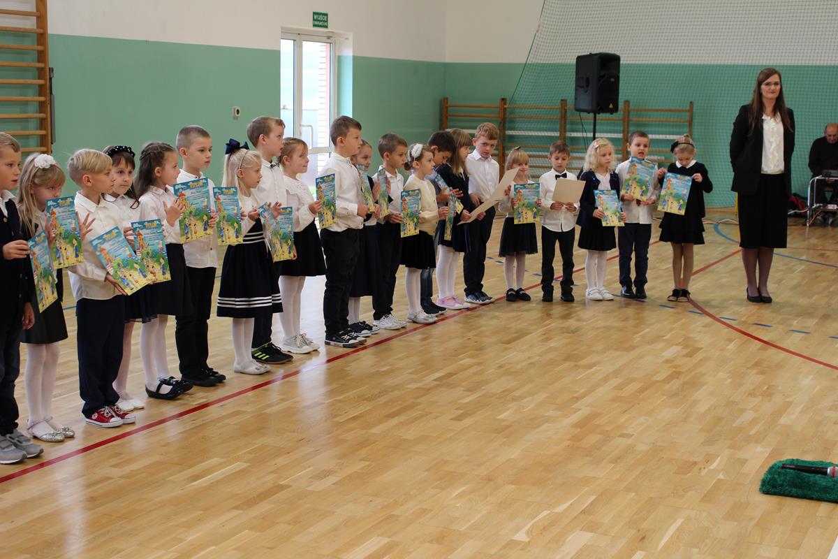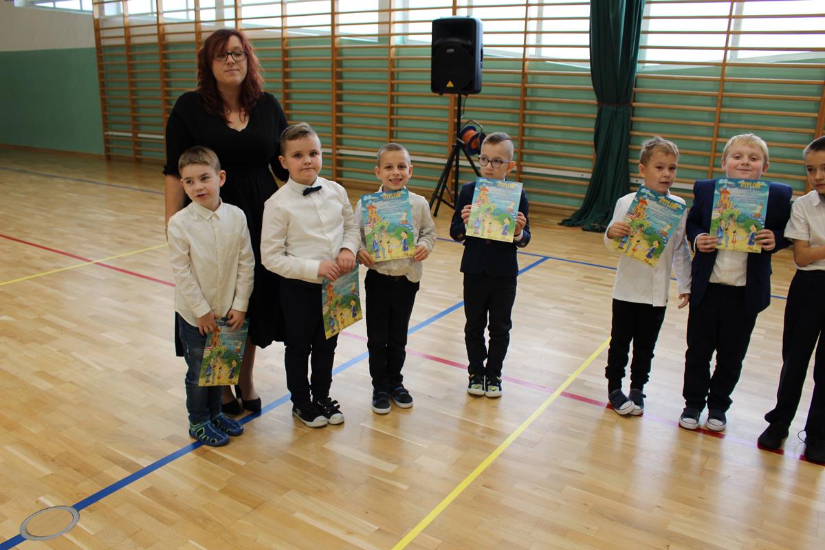Następnie pierwszacy wykonali krótki program artystyczny, podczas którego zaprezentowali swoje talenty recytatorskie i wokalne, wzbudzając aplauz wśród zgromadzonej publiczności. Po części artystycznej wychowawczynie wręczyły wszystkim uczniom pamiątkowe dyplomy. Na koniec głos zabrał Pan Dyrektor – życząc pierwszakom wielu sukcesów w nauce.