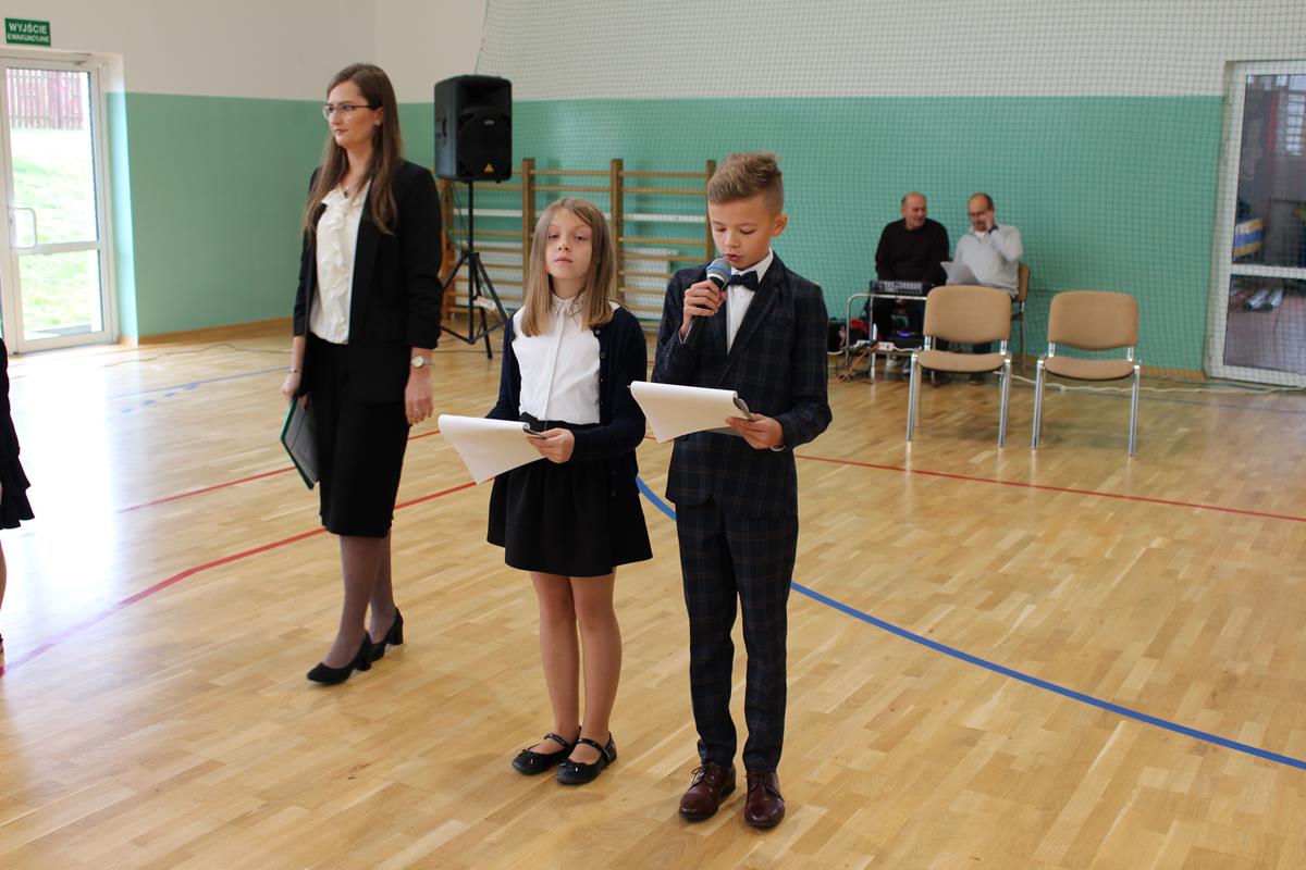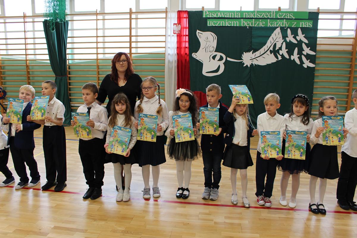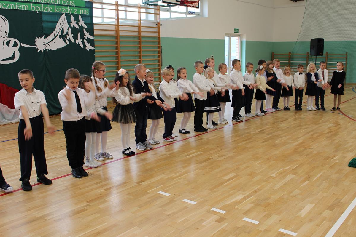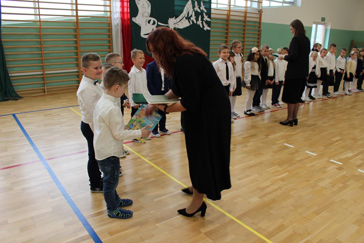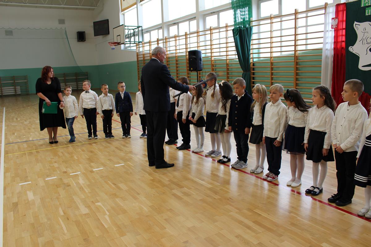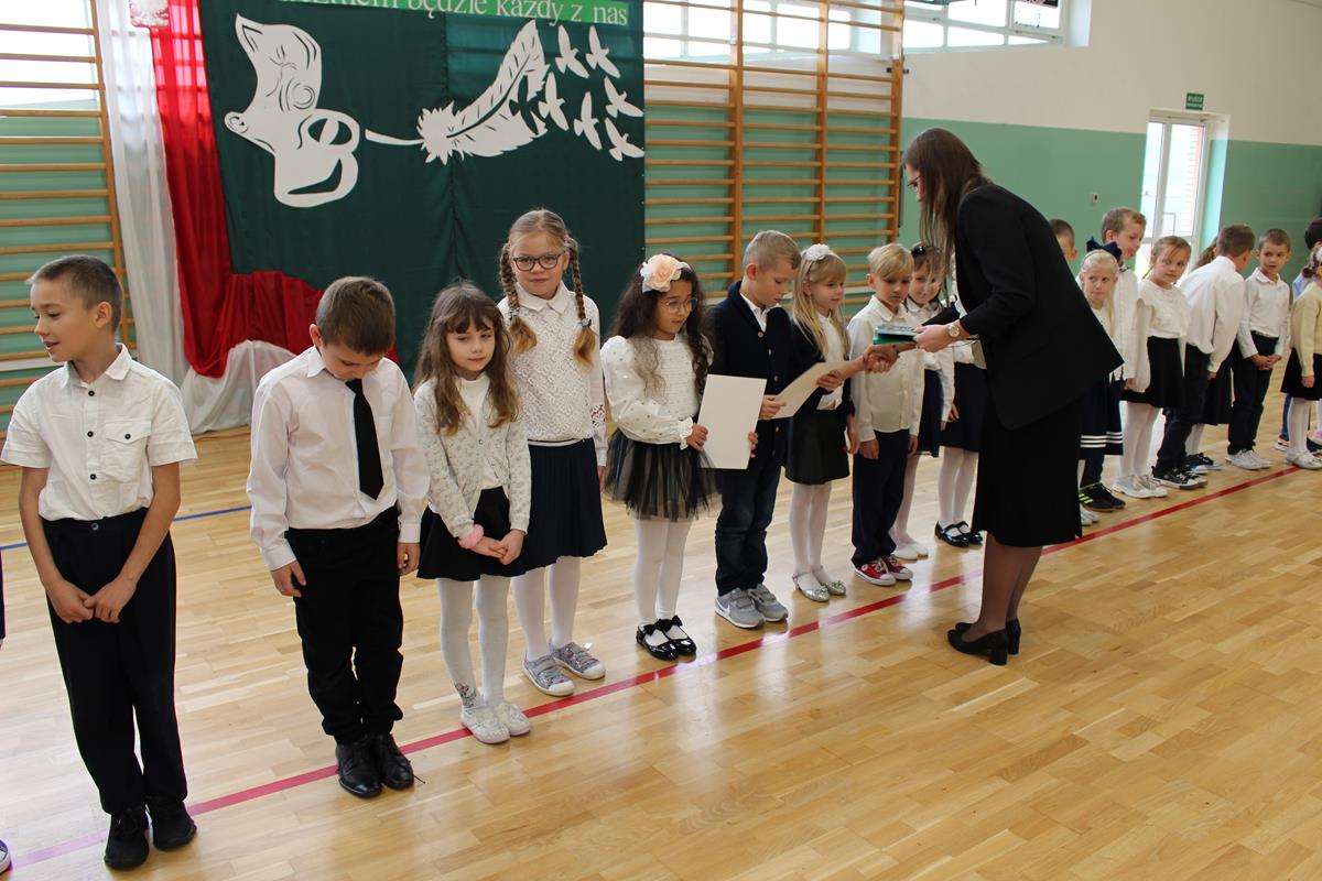 Następnie pierwszacy wykonali krótki program artystyczny, podczas którego zaprezentowali swoje talenty recytatorskie i wokalne, wzbudzając aplauz wśród zgromadzonej publiczności. Po części artystycznej wychowawczynie wręczyły wszystkim uczniom pamiątkowe dyplomy. Na koniec głos zabrał Pan Dyrektor – życząc pierwszakom wielu sukcesów w nauce.