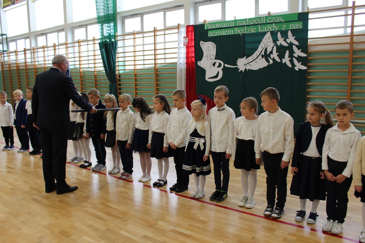 Ślubowanie uczniów klas pierwszych to od lat niezwykłe wydarzenie w naszej szkole. W tym roku odbyło się ono 3 października. Był to dzień długo wyczekiwany przez dzieci. Podczas tej uroczystości, w niezwykle podniosłej atmosferze, przed Dyrekcją Szkoły, nauczycielami, wychowawcami i rodzicami uczniowie klasy 1a i 1b złożyli uroczystą przysięgę uczniowską, podczas której ślubowali być dobrymi Polakami, godnie reprezentować swoją szkołę oraz swym zachowaniem i nauką sprawiać radość rodzicom i nauczycielom. Po złożeniu ślubowania Dyrektor Szkoły dokonał symbolicznego pasowania na ucznia. Od tej chwili stali się oni nowymi członkami naszej wielkiej szkolnej rodziny!