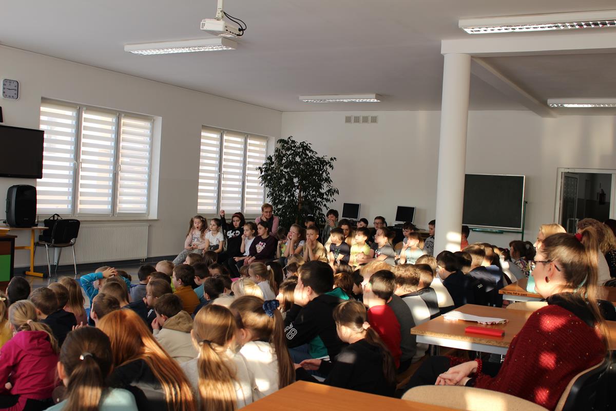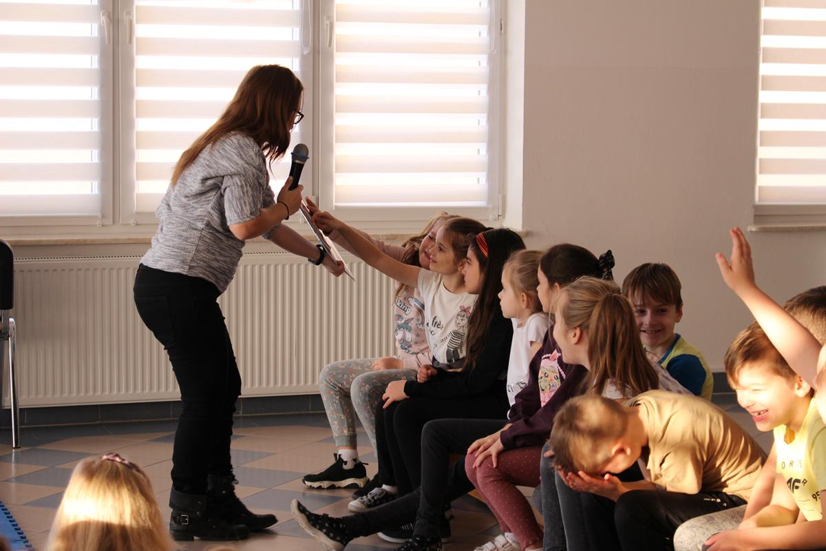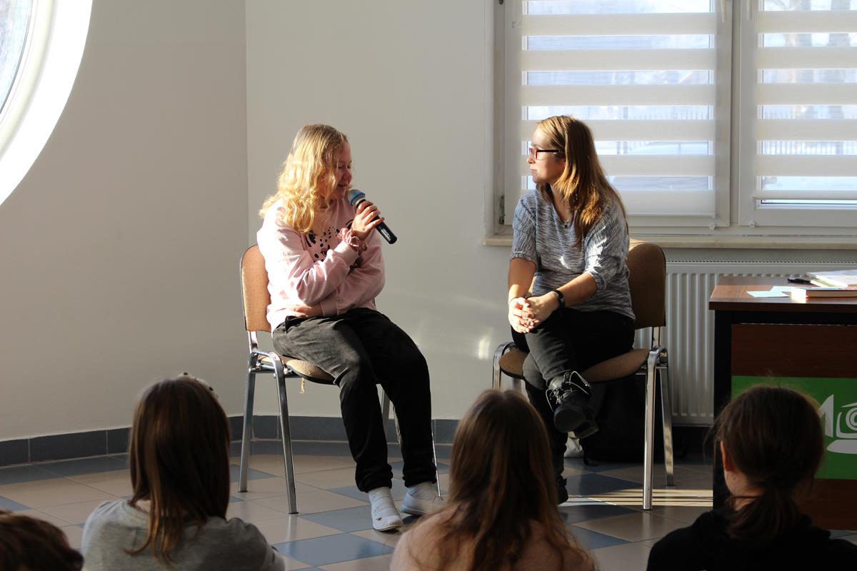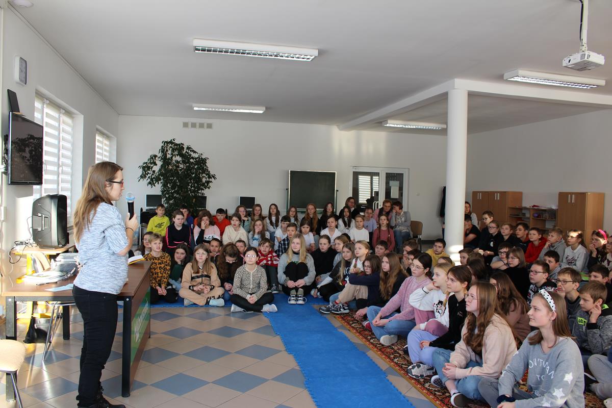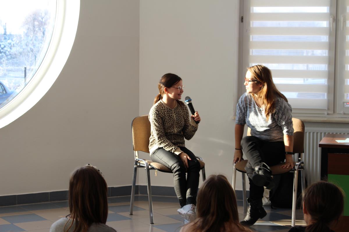 O godzinie 9:00 odbyło się spotkanie dla klas 0-3, o 10:00 zaś dla klas 4-7. Zarówno młodsi, jak i starsi uczniowie brali czynny udział w spotkaniu - odpowiadali na pytania, rozwiązywali quiz czy wykonywali różne zadania wymyślone przez gościa. Pani Monika opowiadała o wydanych książkach, o swoich pasjach, o tym, jak żyje się na co dzień we Francji, podpisała także książki zakupione przez uczniów.