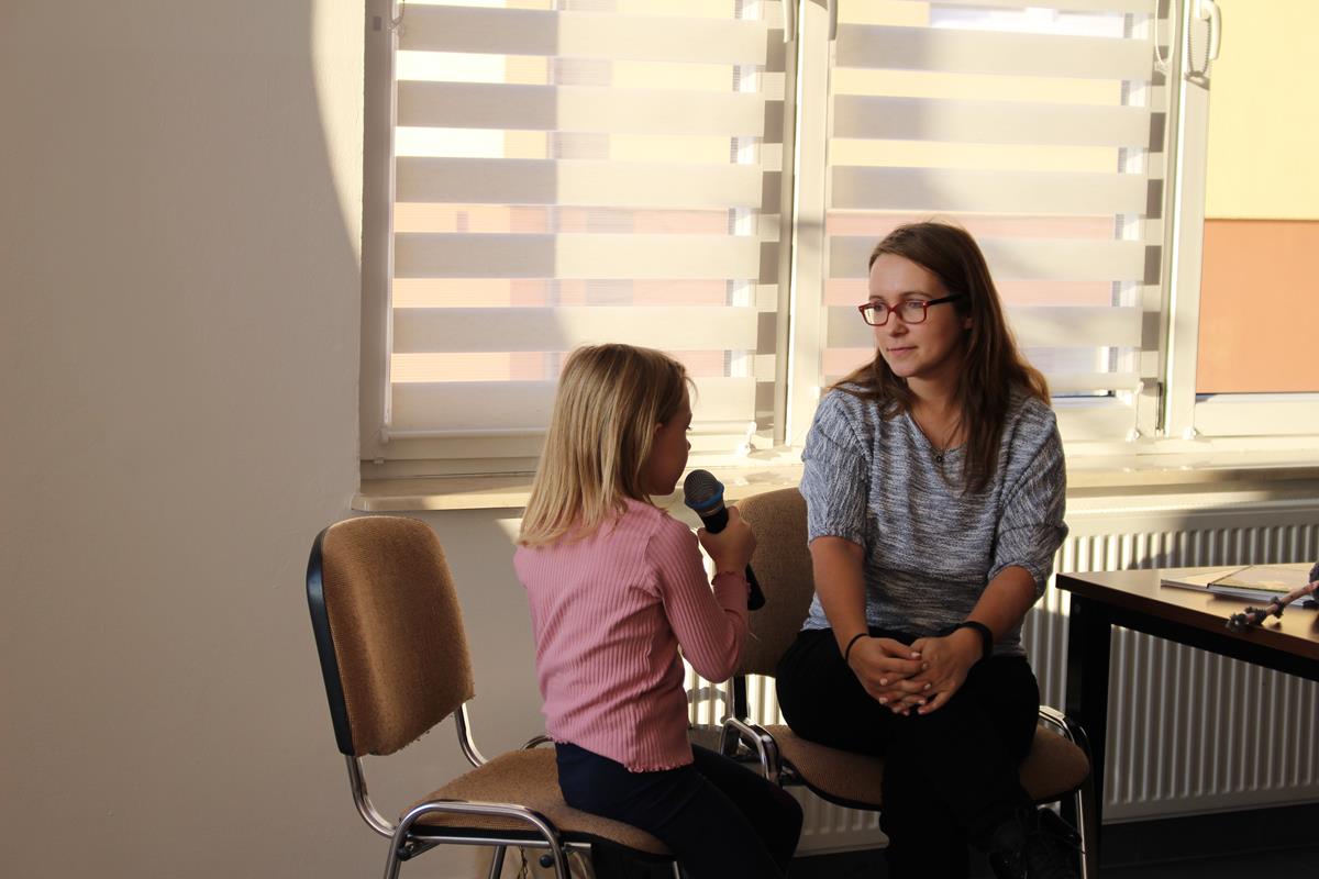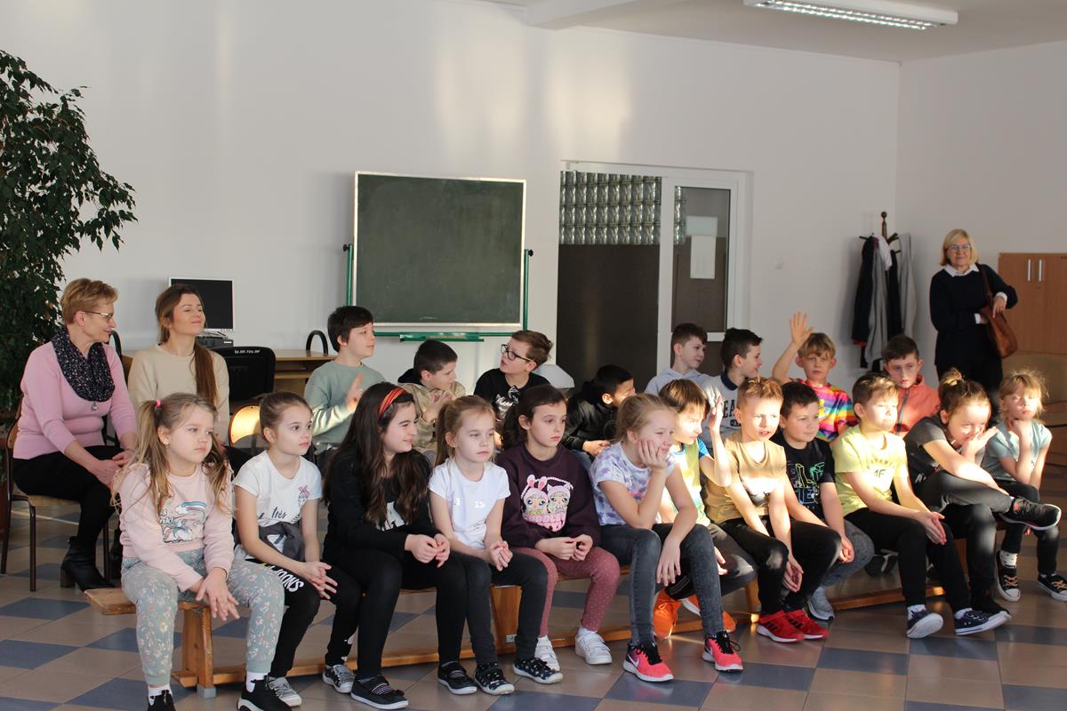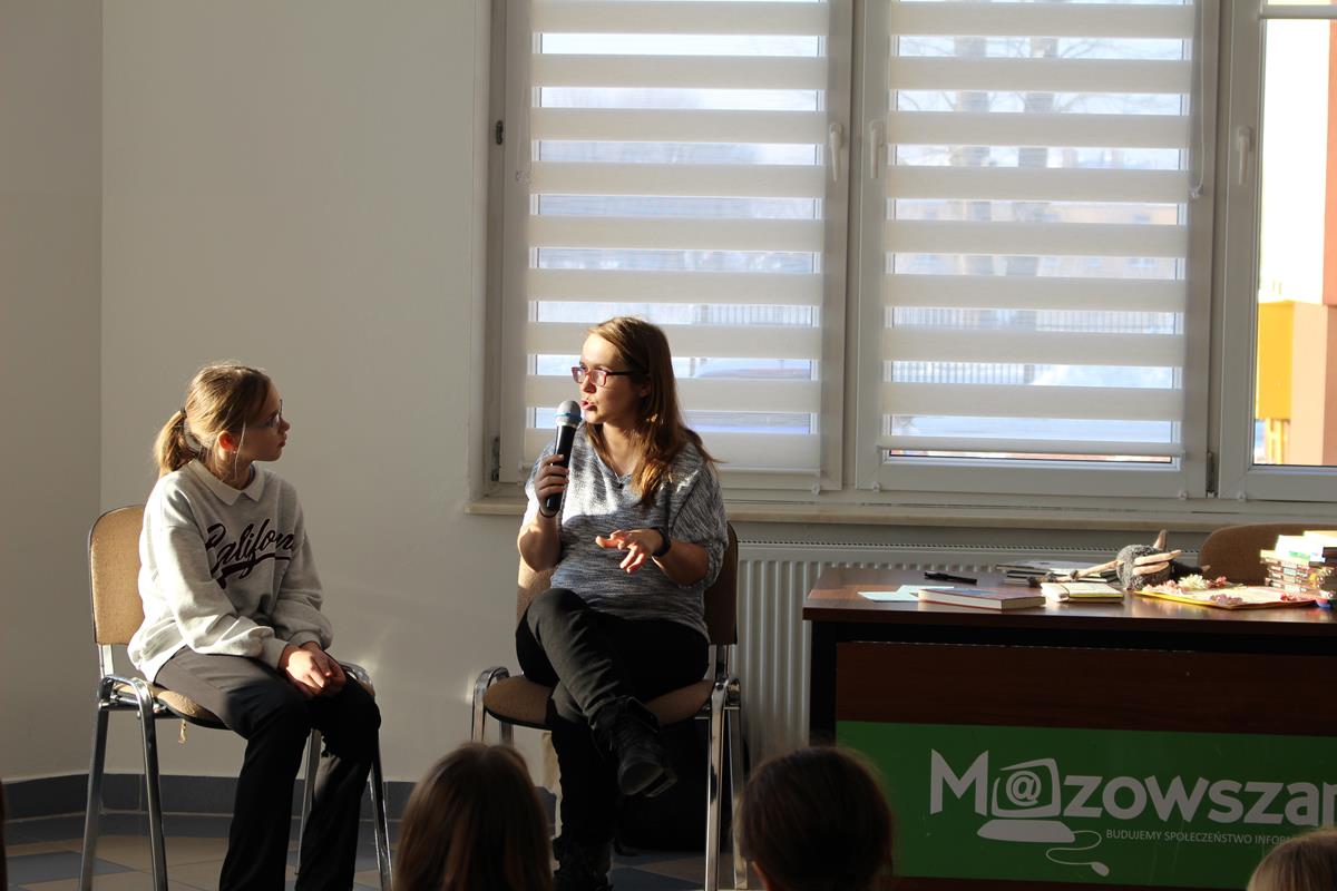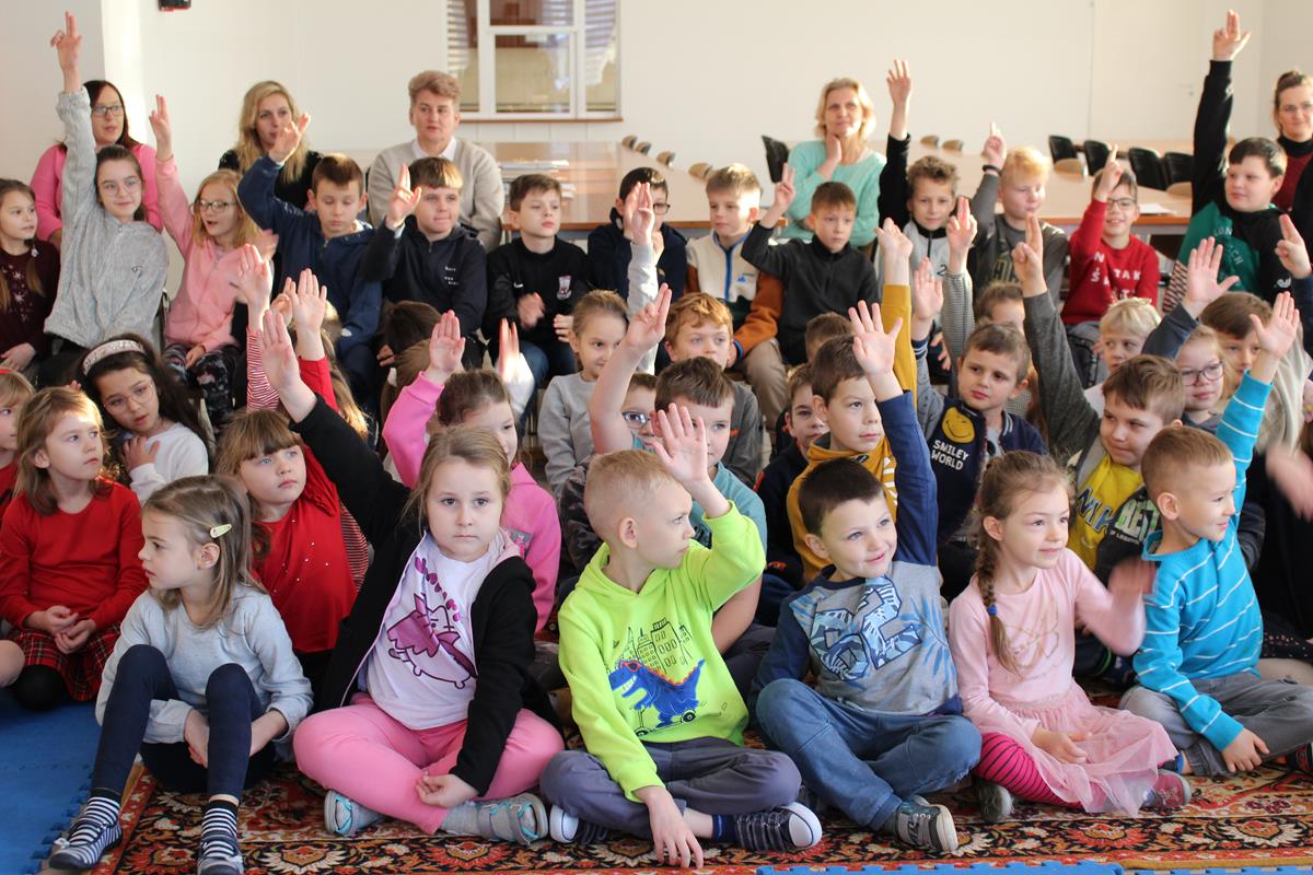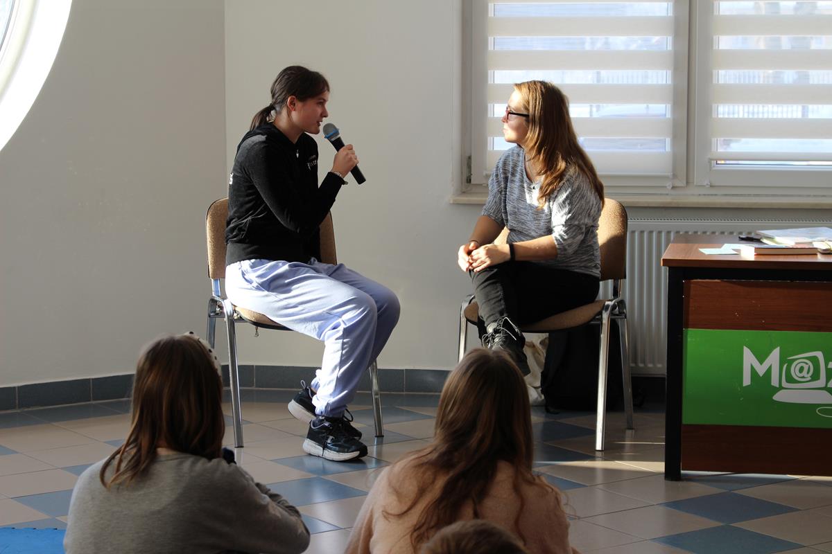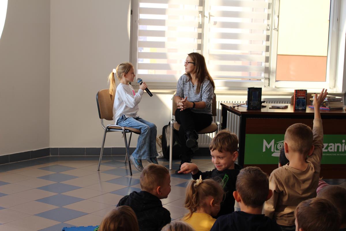 O godzinie 9:00 odbyło się spotkanie dla klas 0-3, o 10:00 zaś dla klas 4-7. Zarówno młodsi, jak i starsi uczniowie brali czynny udział w spotkaniu - odpowiadali na pytania, rozwiązywali quiz czy wykonywali różne zadania wymyślone przez gościa. Pani Monika opowiadała o wydanych książkach, o swoich pasjach, o tym, jak żyje się na co dzień we Francji, podpisała także książki zakupione przez uczniów.