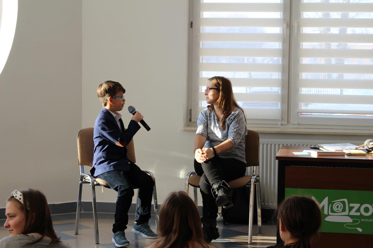 O godzinie 9:00 odbyło się spotkanie dla klas 0-3, o 10:00 zaś dla klas 4-7. Zarówno młodsi, jak i starsi uczniowie brali czynny udział w spotkaniu - odpowiadali na pytania, rozwiązywali quiz czy wykonywali różne zadania wymyślone przez gościa. Pani Monika opowiadała o wydanych książkach, o swoich pasjach, o tym, jak żyje się na co dzień we Francji, podpisała także książki zakupione przez uczniów.
