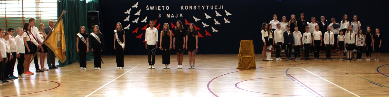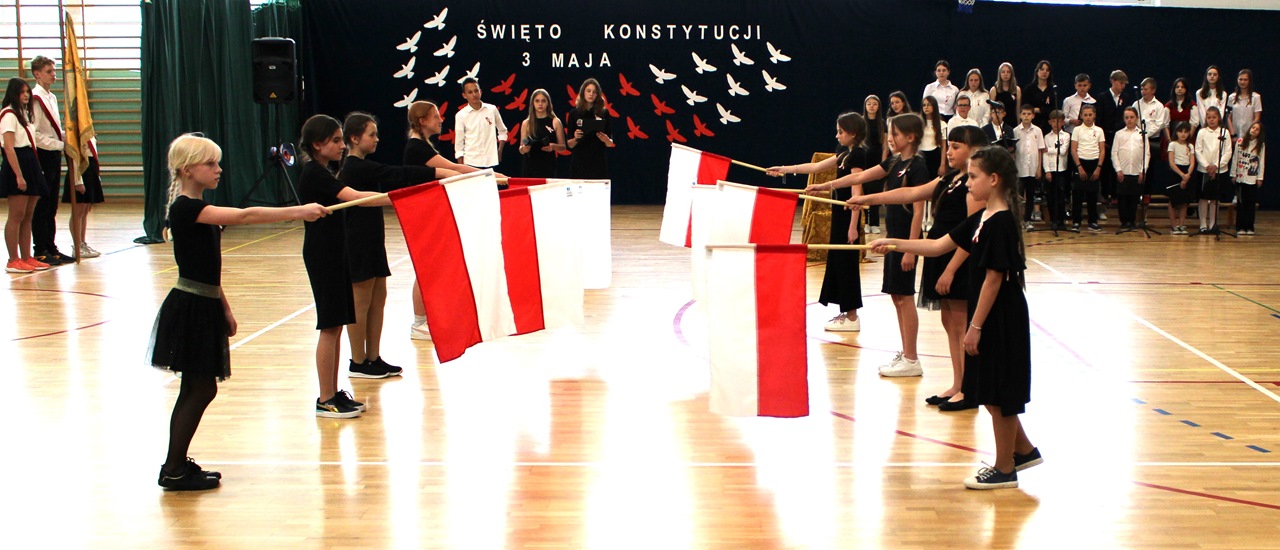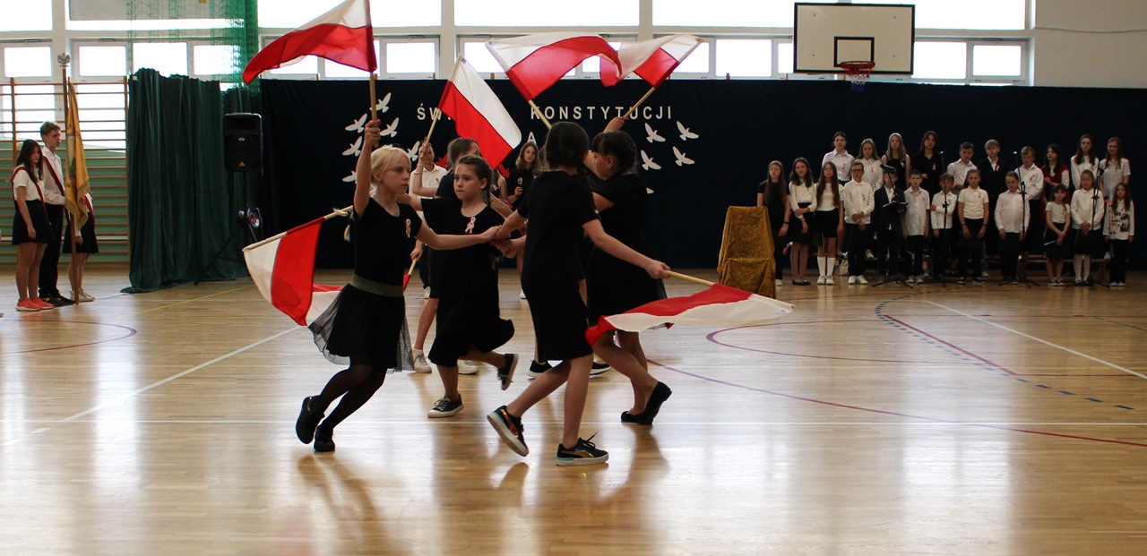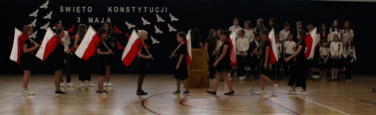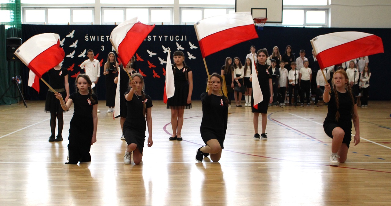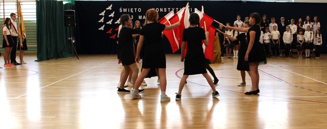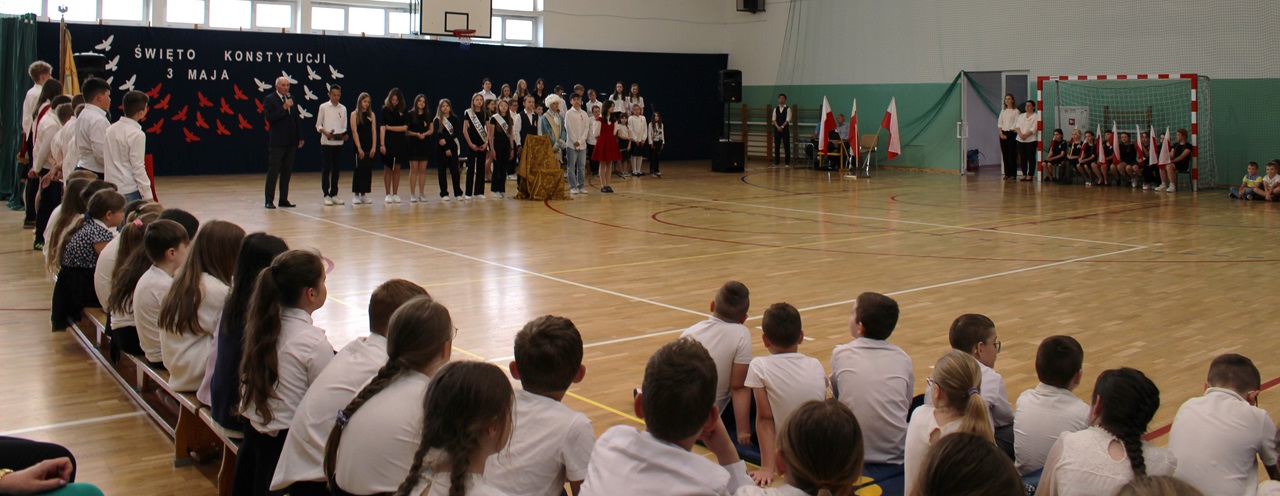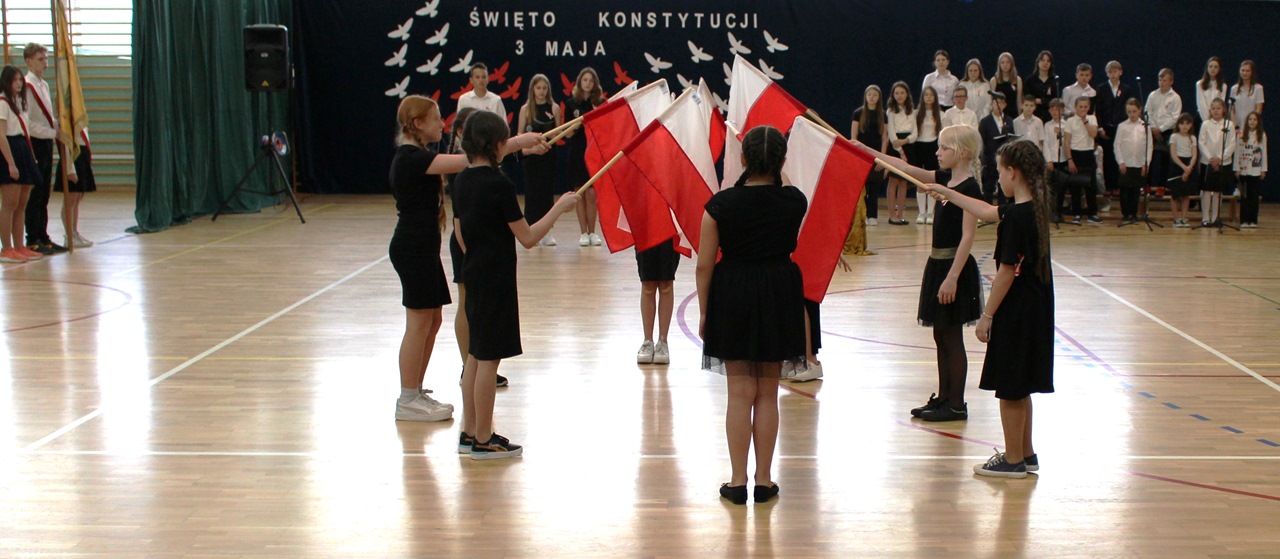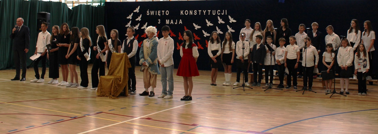W poniedziałek, 6 maja 2024 roku w naszej szkole obchodziliśmy 233. rocznicę uchwalenia Konstytucji 3 Maja. Była to wspaniała okazja, by uzmysłowić wszystkim, jak ważną rolę i znaczenie mają słowa: Wolność, Naród i Ojczyzna. W celu podkreślenia patriotycznego charakteru uroczystości, wszyscy zebrani przybyli do hali sportowej w strojach galowych, z przypiętymi do piersi biało-czerwonymi kotylionami. Po uroczystym wprowadzeniu pocztu sztandarowego, cała społeczność Publicznej Szkoły Podstawowej w Goszczynie odśpiewała hymn państwowy. Następnie uczniowie z klas IV a i VI b oraz chór szkolny zaprezentowali część artystyczną. W wystąpieniach, wierszach i pieśniach patriotycznych opowiedzieli zebranym o doniosłym i jakże ważnym dla Polski wydarzeniu, jakim było uchwalenie Konstytucji 3 Maja. Całość uświetnił występ uczennic z klasy IV a, które wykonały przepiękny taniec z biało-czerwonymi flagami. Na zakończenie głos zabrał Dyrektor Szkoły - Pan Mariusz Wangryn, który w swoim wystąpieniu podkreślił znaczenie tej rocznicy oraz zachęcił wszystkich do pielęgnowania polskich tradycji i wartości oraz podziękował nauczycielom odpowiedzialnym za przygotowanie uroczystości.