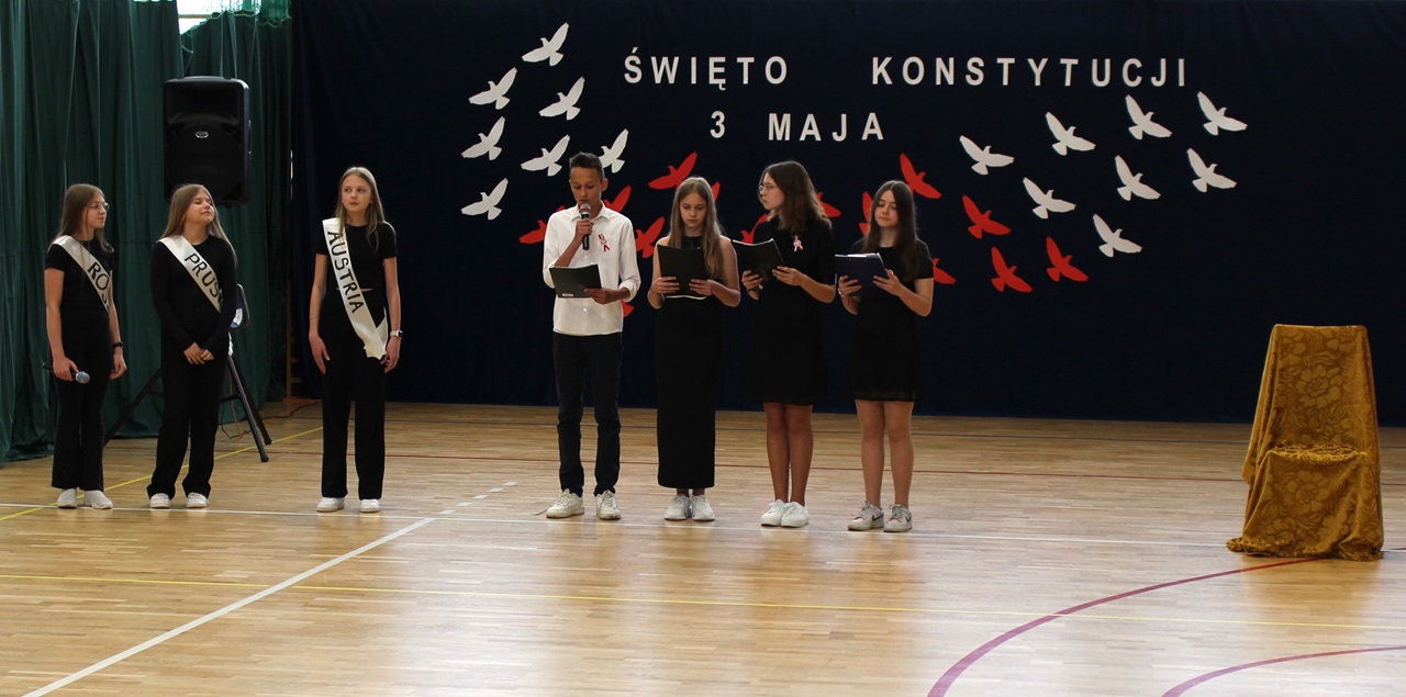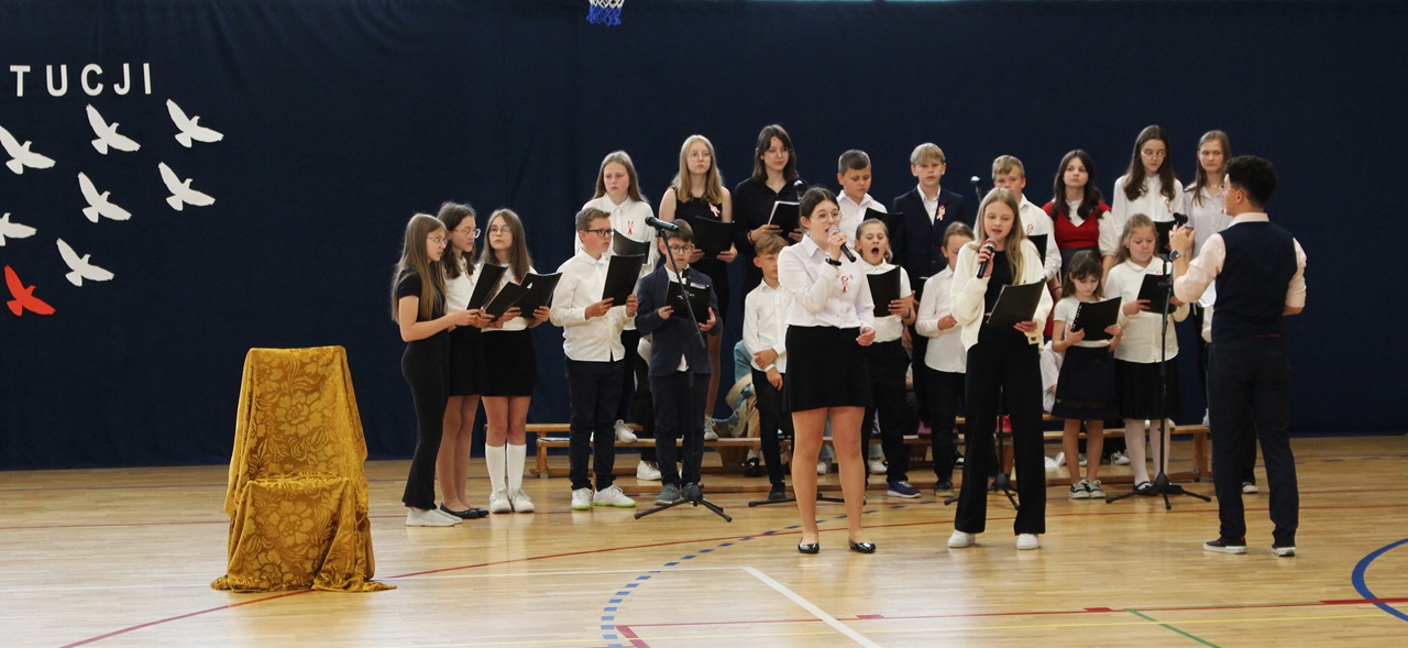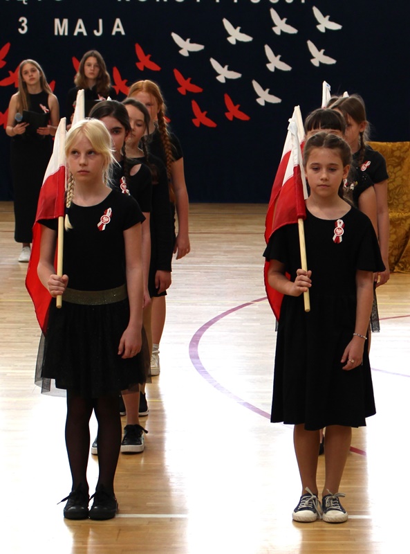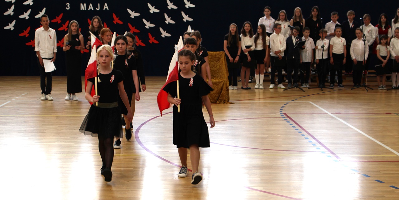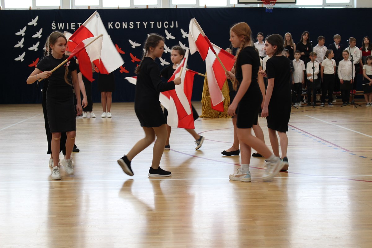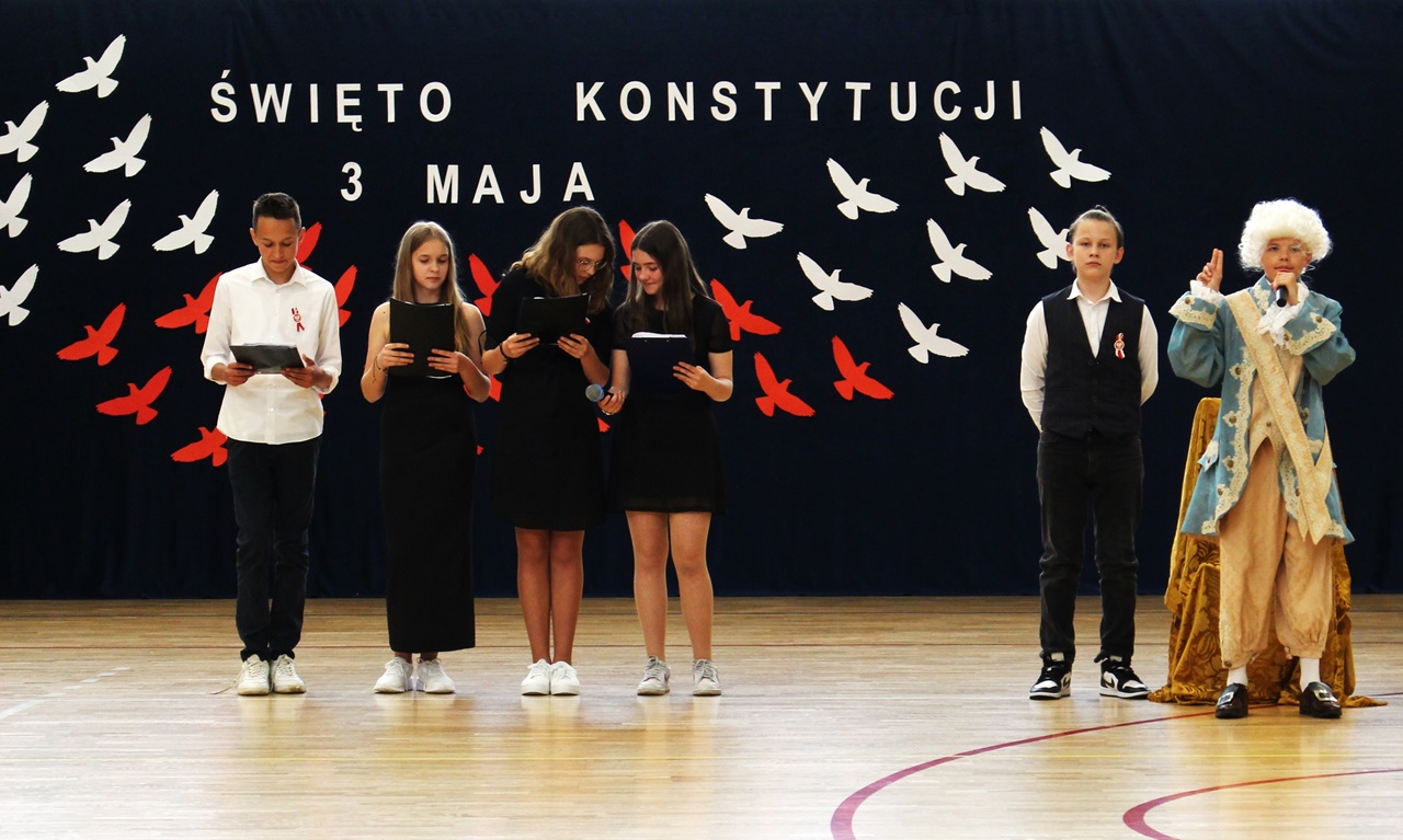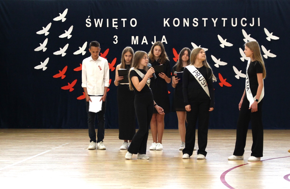 W poniedziałek, 6 maja 2024 roku w naszej szkole obchodziliśmy 233. rocznicę uchwalenia Konstytucji 3 Maja. Była to wspaniała okazja, by uzmysłowić wszystkim, jak ważną rolę i znaczenie mają słowa: Wolność, Naród i Ojczyzna. W celu podkreślenia patriotycznego charakteru uroczystości, wszyscy zebrani przybyli do hali sportowej w strojach galowych, z przypiętymi do piersi biało-czerwonymi kotylionami. Po uroczystym wprowadzeniu pocztu sztandarowego, cała społeczność Publicznej Szkoły Podstawowej w Goszczynie odśpiewała hymn państwowy. Następnie uczniowie z klas IV a i VI b oraz chór szkolny zaprezentowali część artystyczną. W wystąpieniach, wierszach i pieśniach patriotycznych opowiedzieli zebranym o doniosłym i jakże ważnym dla Polski wydarzeniu, jakim było uchwalenie Konstytucji 3 Maja. Całość uświetnił występ uczennic z klasy IV a, które wykonały przepiękny taniec z biało-czerwonymi flagami. Na zakończenie głos zabrał Dyrektor Szkoły - Pan Mariusz Wangryn, który w swoim wystąpieniu podkreślił znaczenie tej rocznicy oraz zachęcił wszystkich do pielęgnowania polskich tradycji i wartości oraz podziękował nauczycielom odpowiedzialnym za przygotowanie uroczystości.