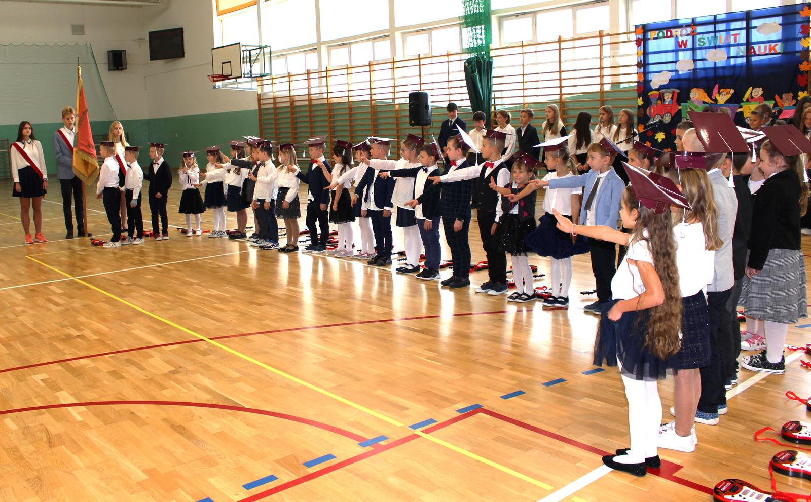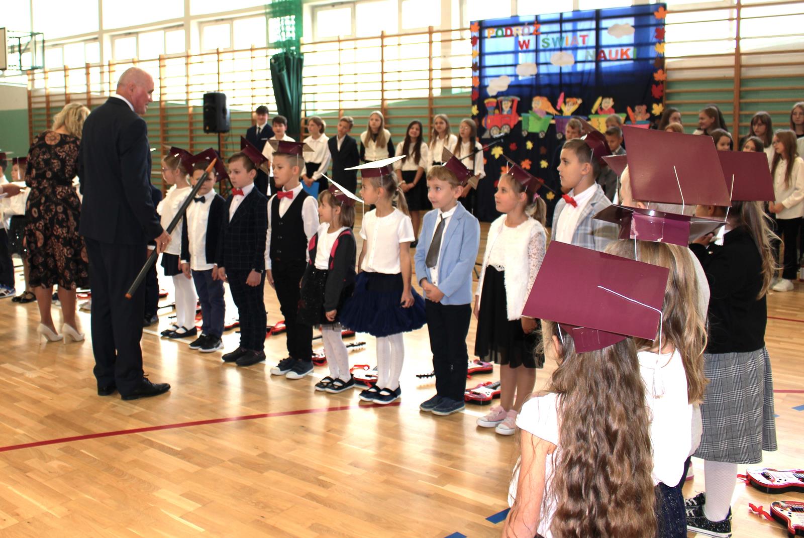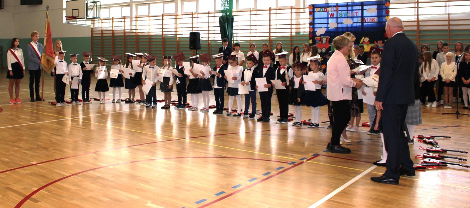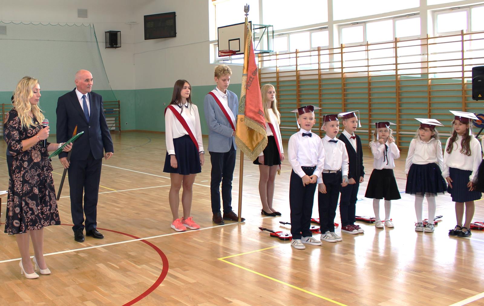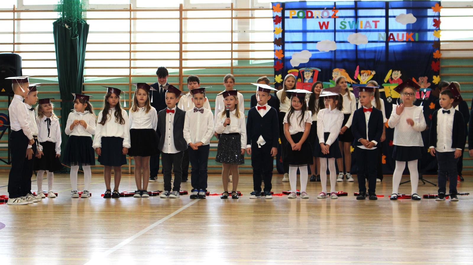 Tego dnia święto obchodzili również uczniowie klasy 1 SP. Rozpoczynając podróż w świat nauki zostali pasowani na ucznia szkoły podstawowej. W ten sposób pierwszoklasiści zostali oficjalnie włączeni do grona uczniów Szkoły Podstawowej w Goszczynie. Pierwszaki głośno i z przekonaniem przyrzekały być dobrymi i pilnymi uczniami oraz rzetelnie wypełniać swoje obowiązki, o czym przypominać im będą otrzymane pamiątkowe dyplomy.