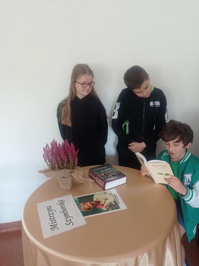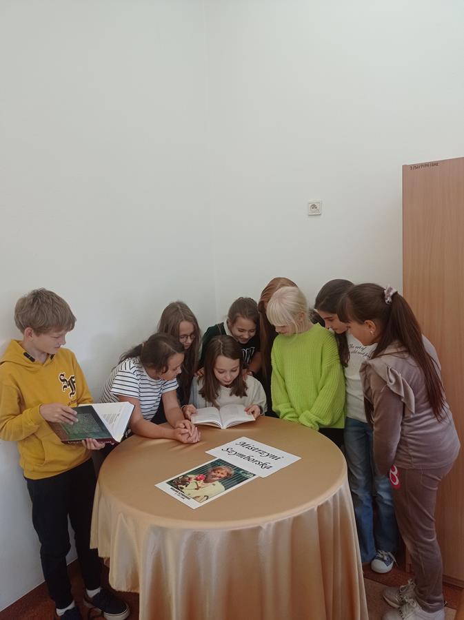 W ramach lekcji języka polskiego omawialiśmy teksty Wisławy Szymborskiej, tworzyliśmy prezentacje multimedialne na temat życia i twórczości noblistki. Przystąpiliśmy również do realizacji Ogólnopolskiego Projektu „Mistrzyni Szymborska”, w ramach którego przygotowaliśmy kącik poetycki w sali 17. Upowszechnialiśmy informacje na temat współczesnych inspiracji twórczością Wisławy Szymborskiej. Uczniowie wybierali ulubione teksty poetki i tworzyli własne karty zatytułowane „Ku pamięci”.
