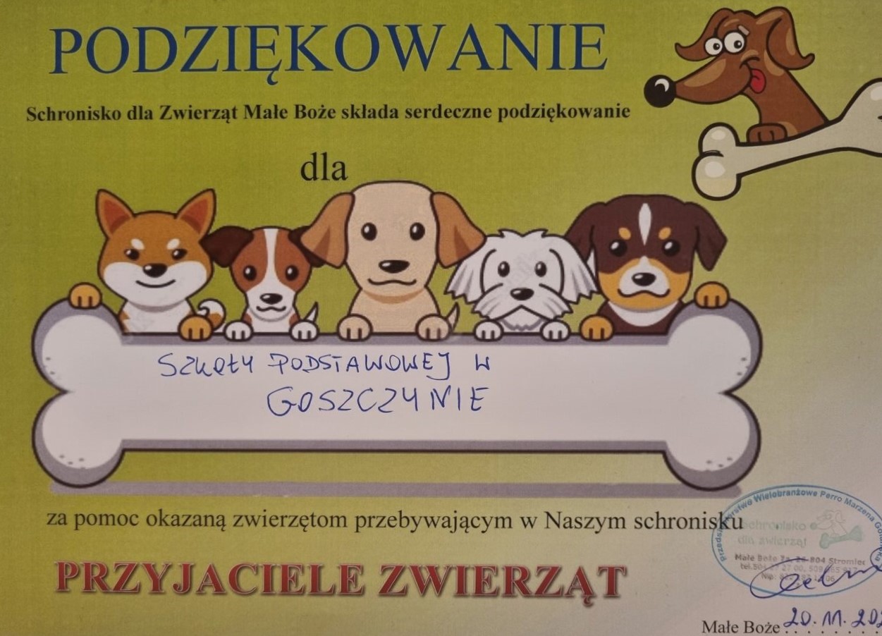 Tej jesieni z okazji przypadającego na 25 października Dnia Kundelka Samorząd Uczniowski po raz kolejny zorganizował zbiórkę karmy, zabawek, ciepłych kocy, legowisk i innych potrzebnych rzeczy dla psów i kotów ze schroniska dla zwierząt w Małym Bożym, w którym obecnie przebywa ponad 200 podopiecznych. Pracownicy bardzo ucieszyli się z przywiezionych przez nas darów i prosili o przekazanie podziękowań dla wszystkich uczniów, którzy wsparli akcję.
