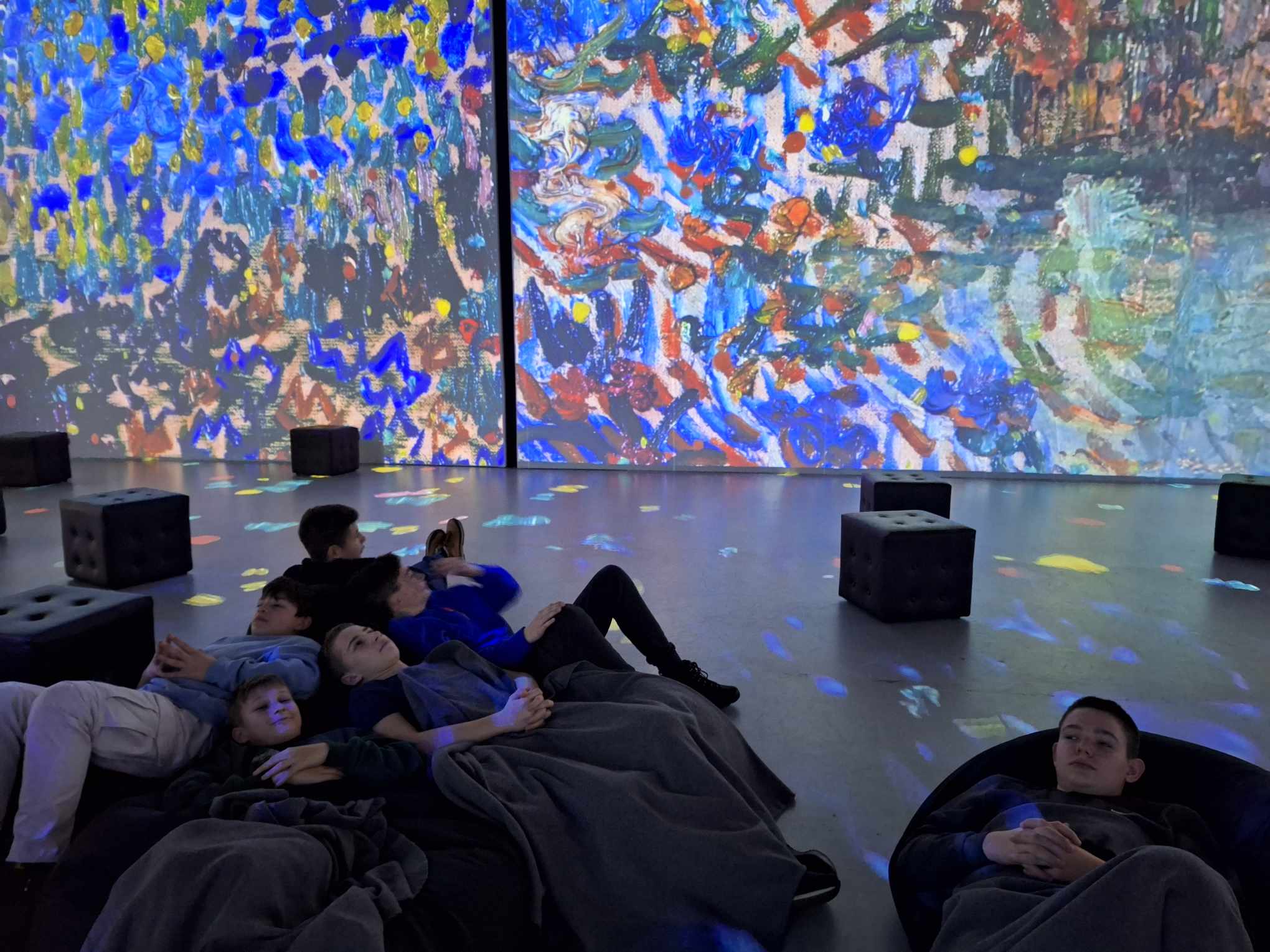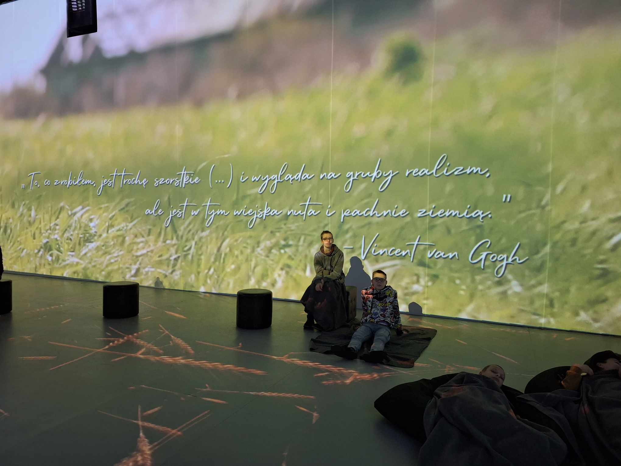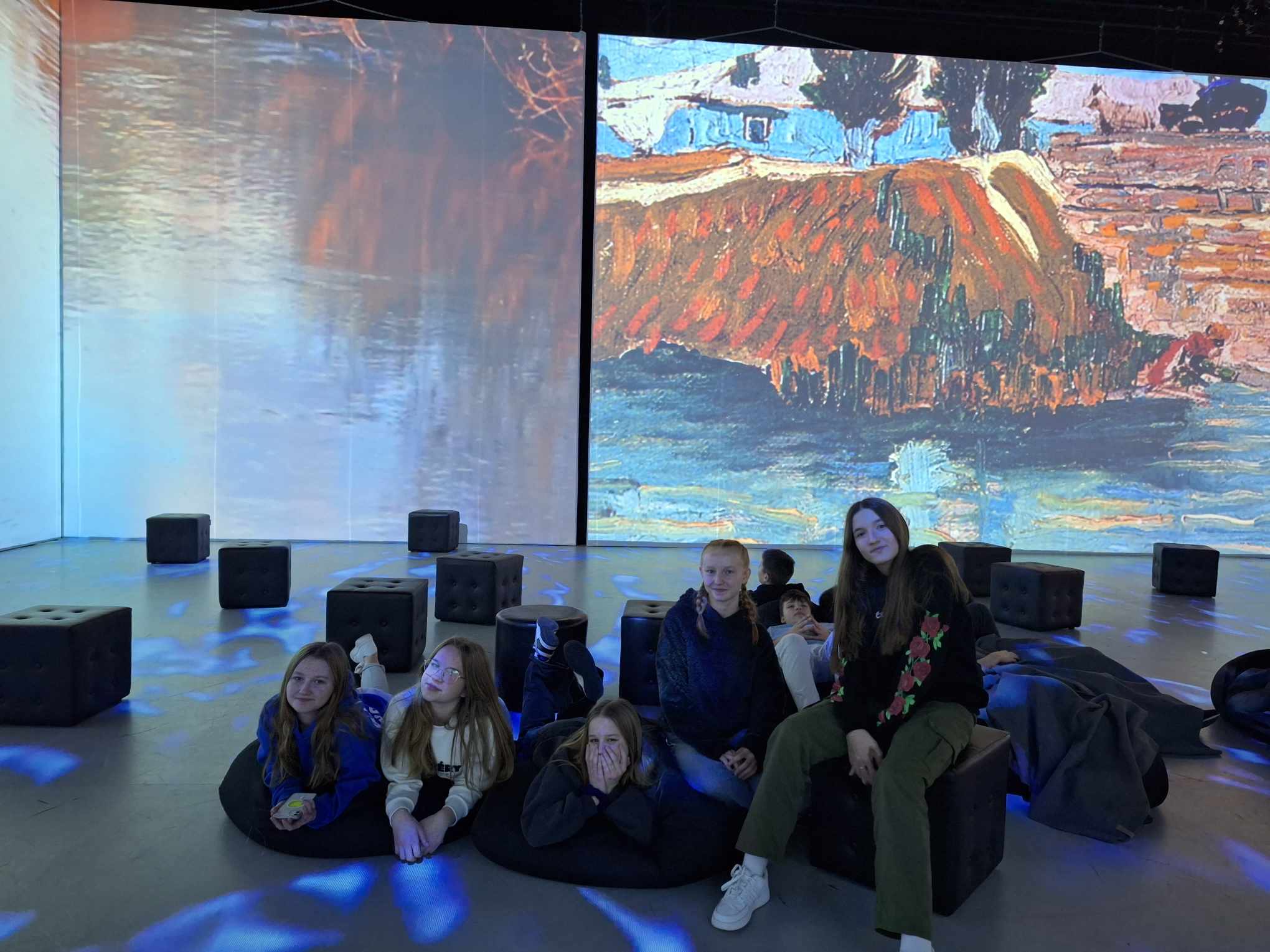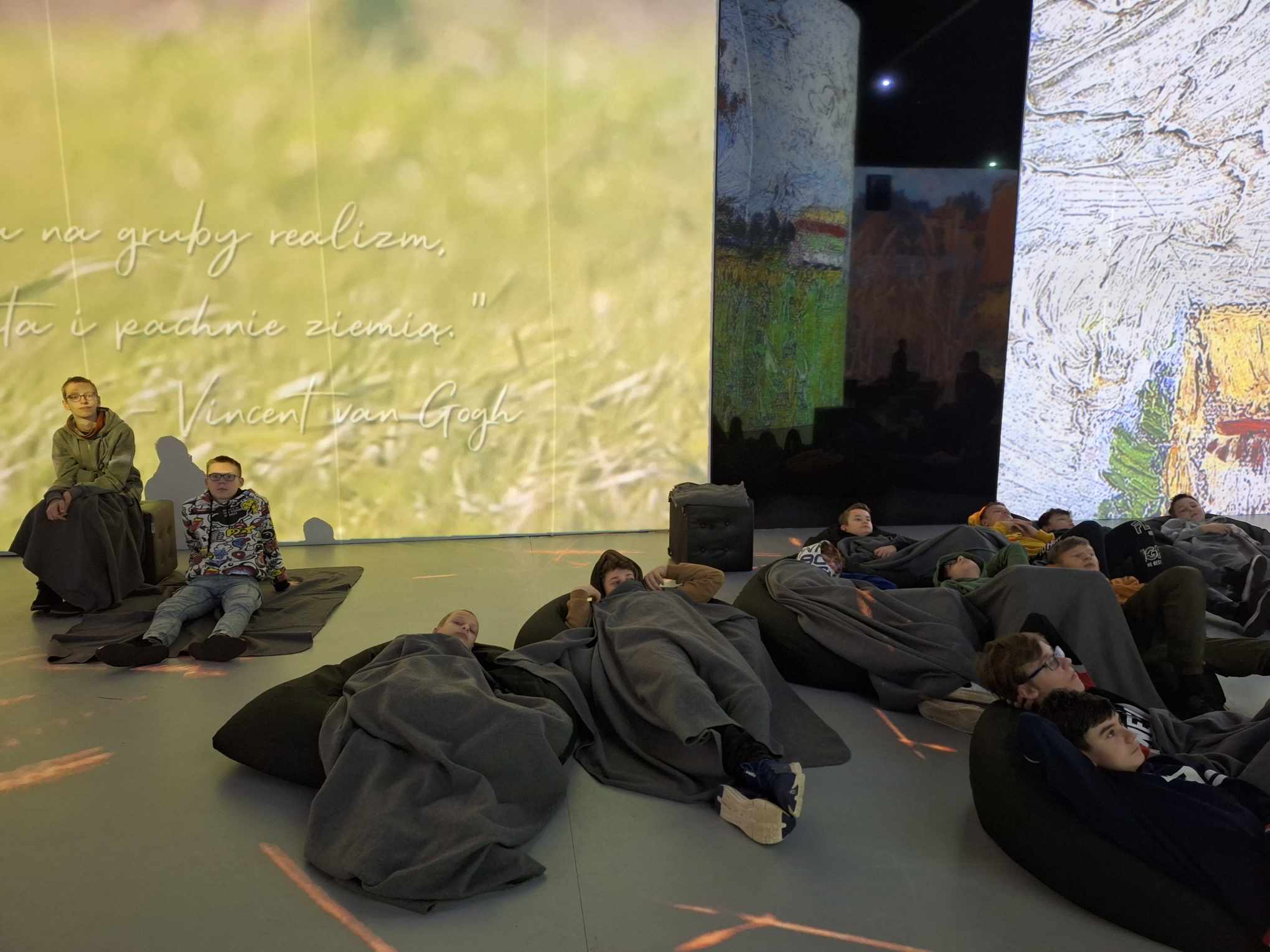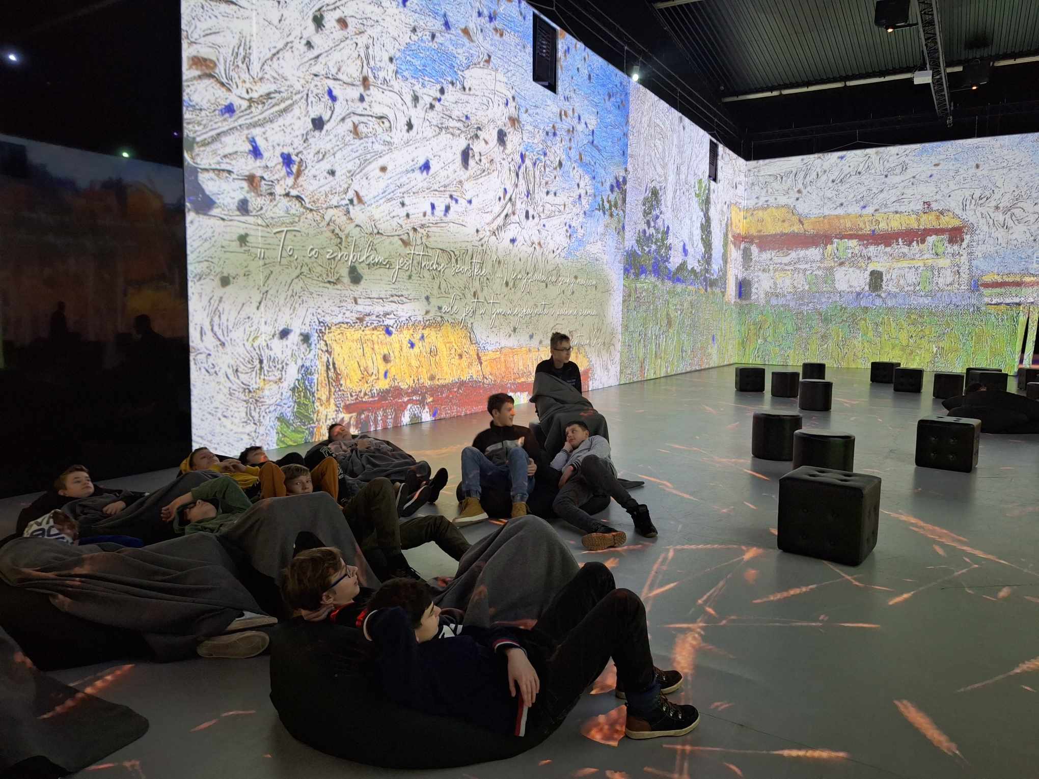 Pierwszym punktem programu była wystawa immersyjna „Van Gogh i przyjaciele” wprowadzająca nas w świat impresjonizmu. Uczniowie wysłuchali wykładu przewodnika na temat Vincenta van Gogha, ale także poznali dzieła osobistości takich jak: Claude Monet, Auguste Renoir, Edouard Manet, Edgar Degas, Paul Cezanne, Camille Pissarro czy Paul Gauguin. Po krótkiej lekcji mieliśmy możliwość „wejść” w świat van Gogha za pomocą okularów VR, a także zatopić się w świecie obrazów dzięki wystawie immersyjnej. Uczniowie, otuleni miękkimi kocykami, oglądali dzieła największych malarzy impresjonistycznych. Obrazom towarzyszyły doskonale wkomponowane największe dzieła muzyki klasycznej.
