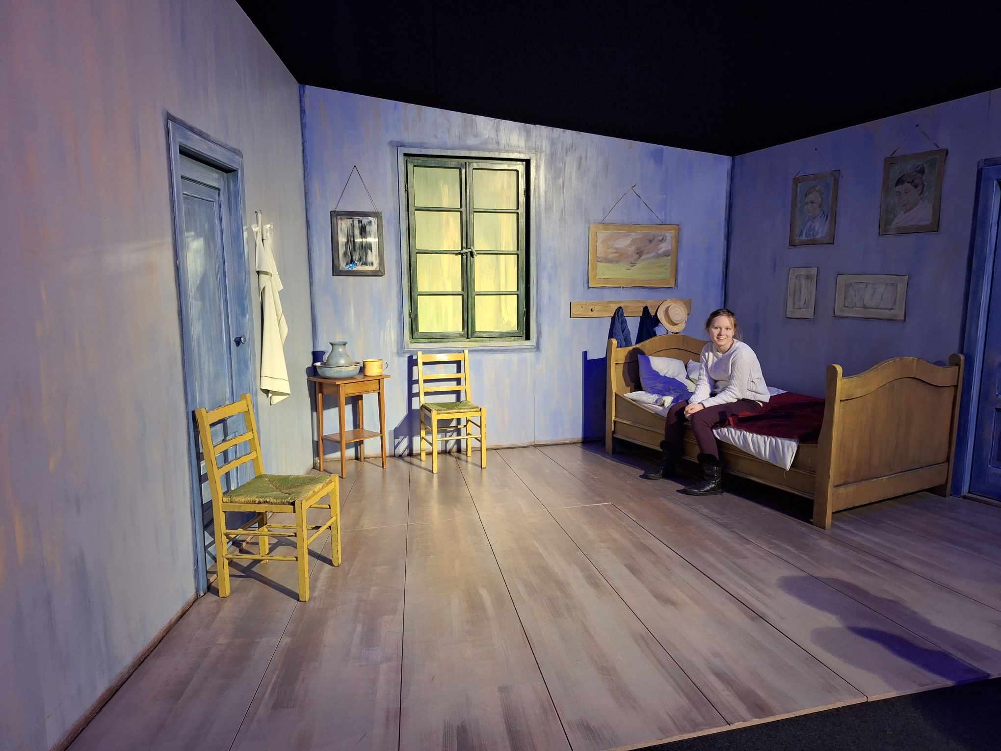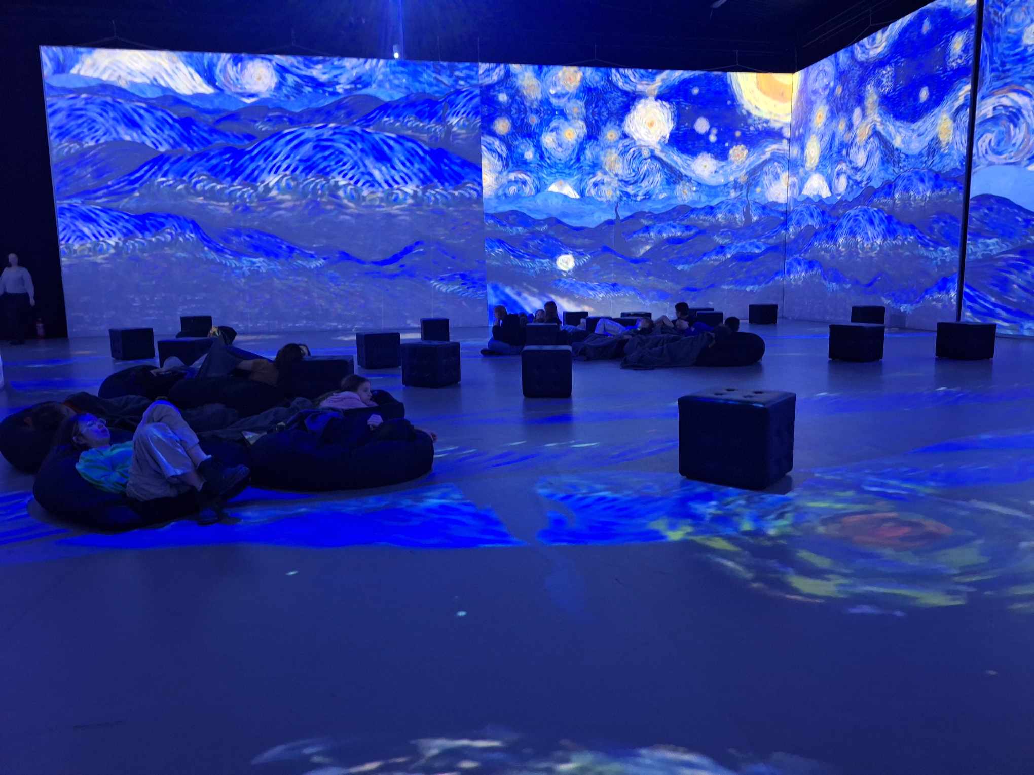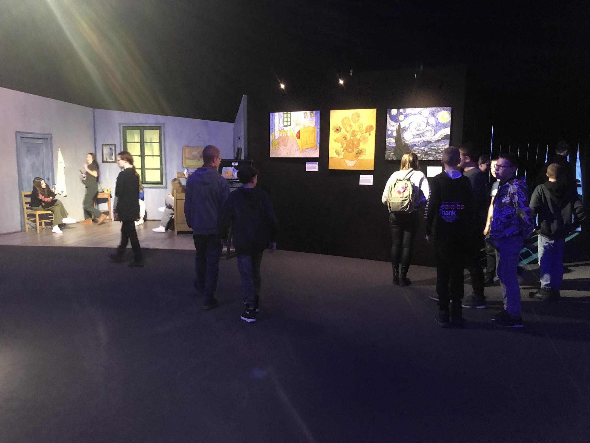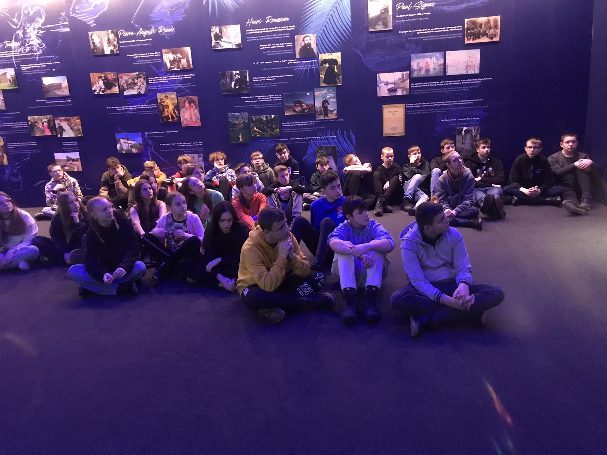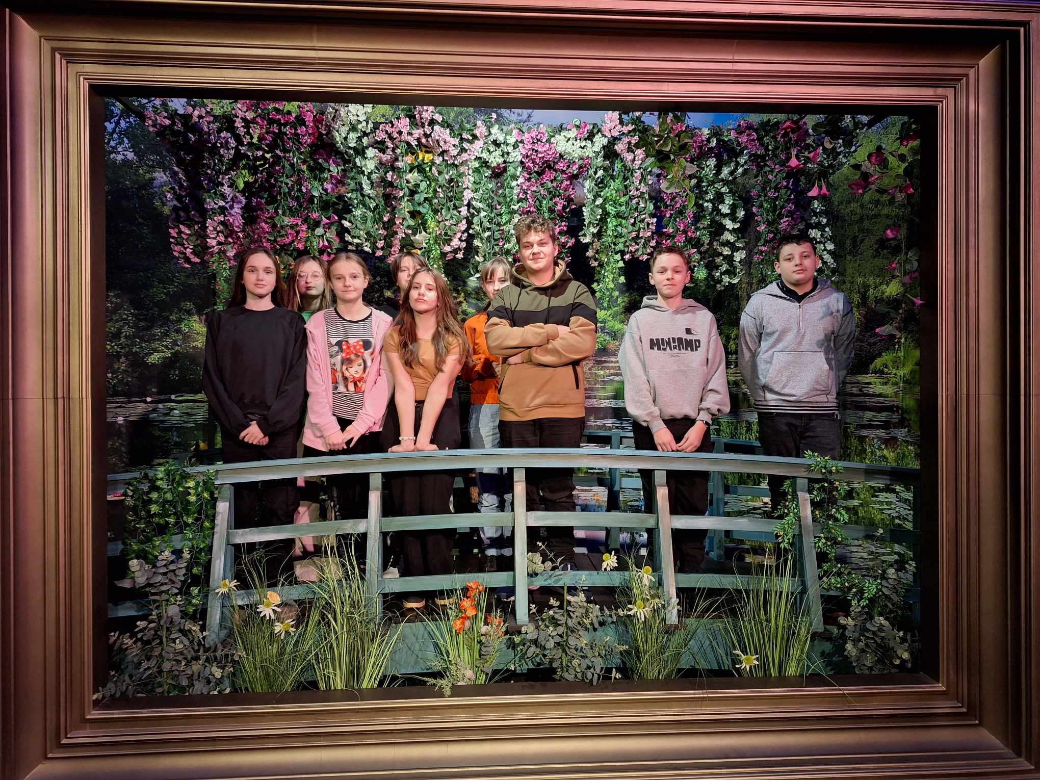 Pierwszym punktem programu była wystawa immersyjna „Van Gogh i przyjaciele” wprowadzająca nas w świat impresjonizmu. Uczniowie wysłuchali wykładu przewodnika na temat Vincenta van Gogha, ale także poznali dzieła osobistości takich jak: Claude Monet, Auguste Renoir, Edouard Manet, Edgar Degas, Paul Cezanne, Camille Pissarro czy Paul Gauguin. Po krótkiej lekcji mieliśmy możliwość „wejść” w świat van Gogha za pomocą okularów VR, a także zatopić się w świecie obrazów dzięki wystawie immersyjnej. Uczniowie, otuleni miękkimi kocykami, oglądali dzieła największych malarzy impresjonistycznych. Obrazom towarzyszyły doskonale wkomponowane największe dzieła muzyki klasycznej.
