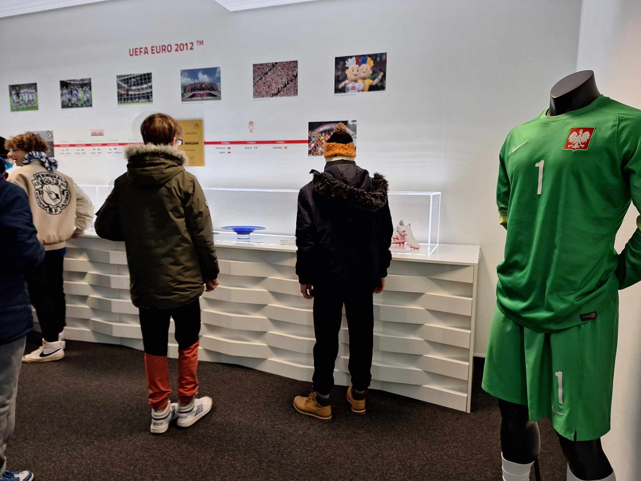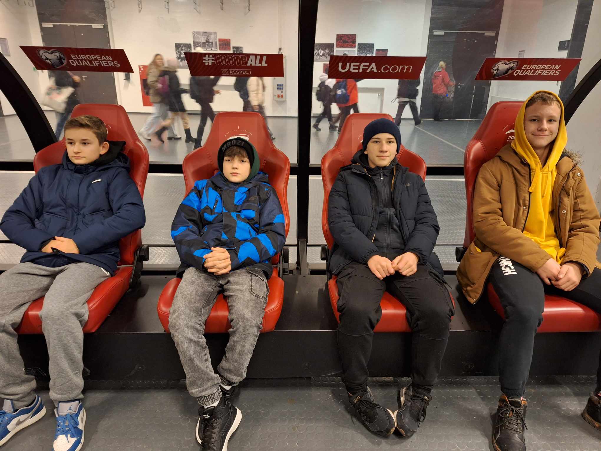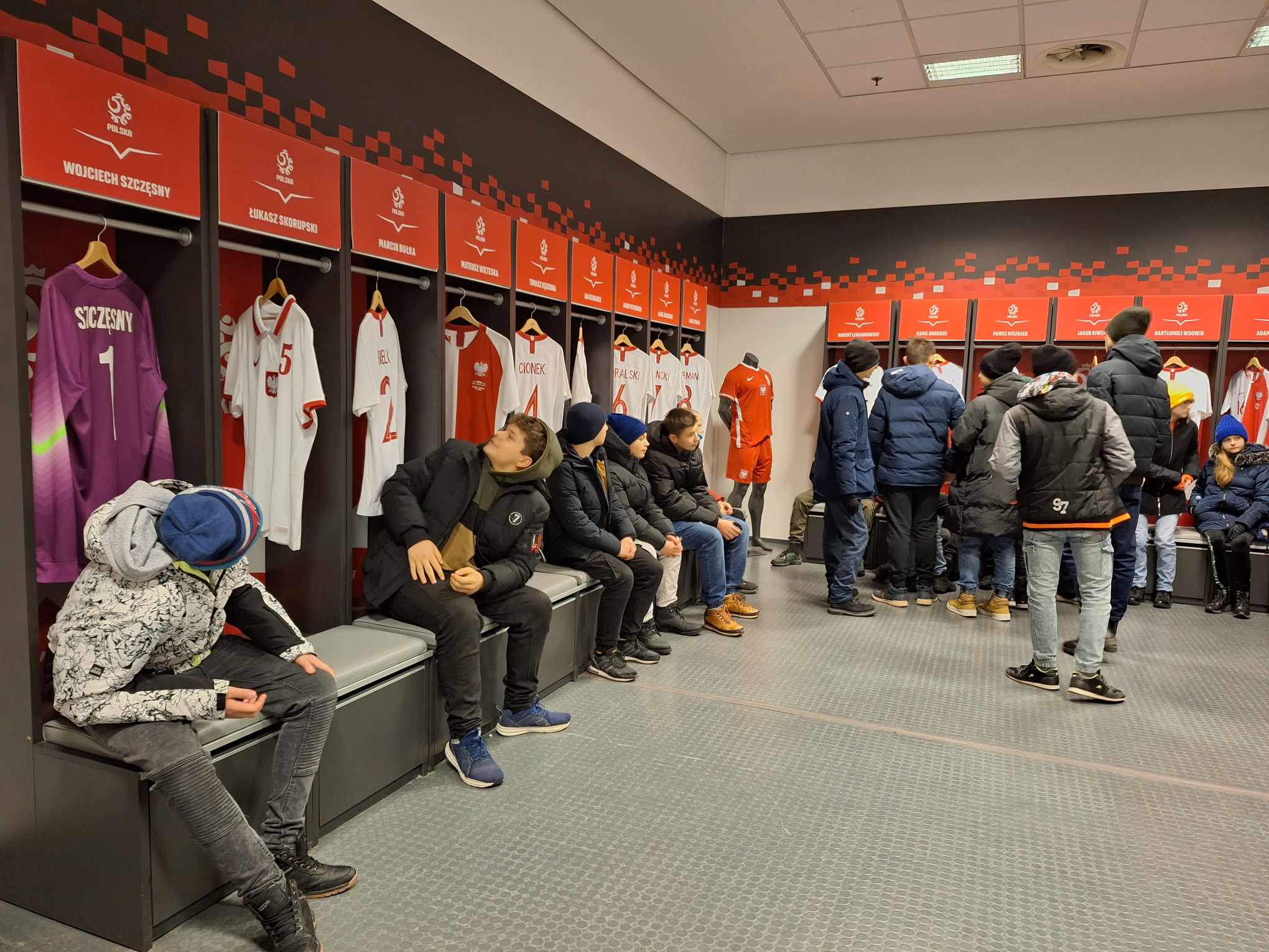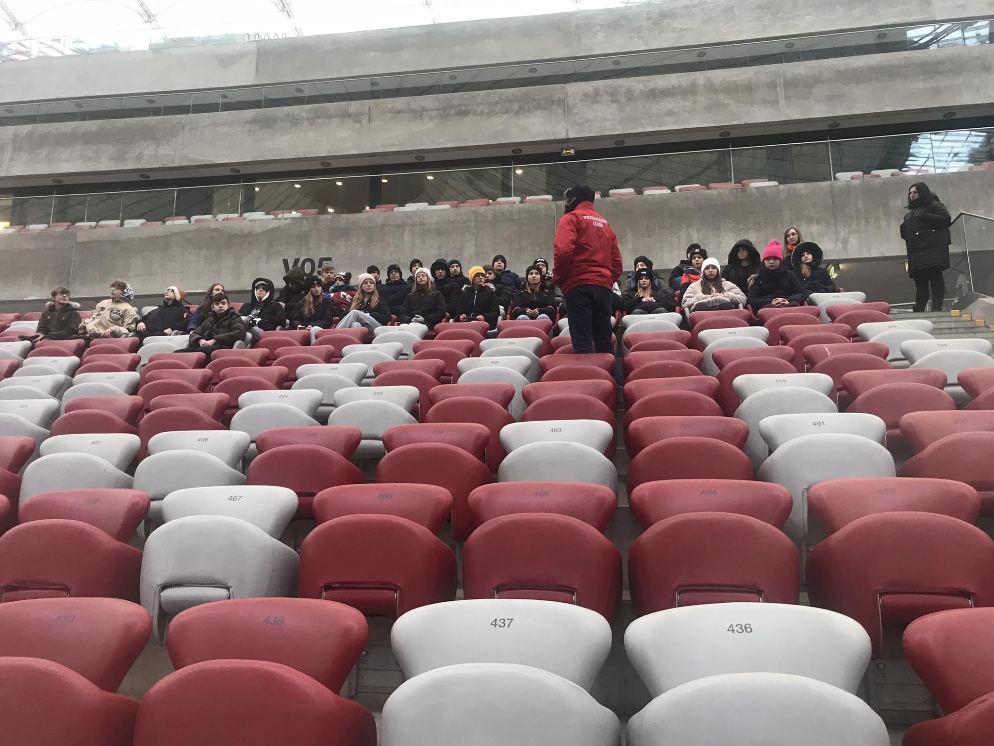 Po „spotkaniu z van Goghiem” udaliśmy się na PGE Narodowy im. Kazimierza Górskiego. Zwiedziliśmy nie tylko arenę stadionu, ale także mieliśmy okazję obejrzeć loże VIP, szatnie oraz prysznice naszych sportowców. Uczniowie dowiedzieli się wielu ciekawych informacji, np. jak długo budowano stadion, jakie funkcje może pełnić płyta (na której tak naprawdę bardzo rzadko leży murawa), ile kosztowało wybudowanie stadionu czy dlaczego piłkarze biorą kąpiel w lodowatej wodzie z kostkami lodu.