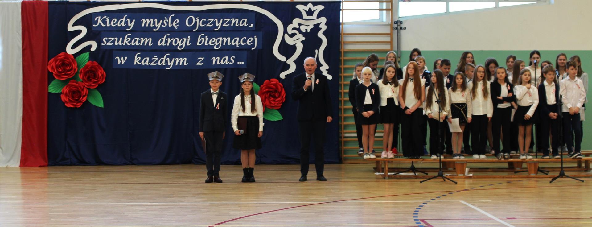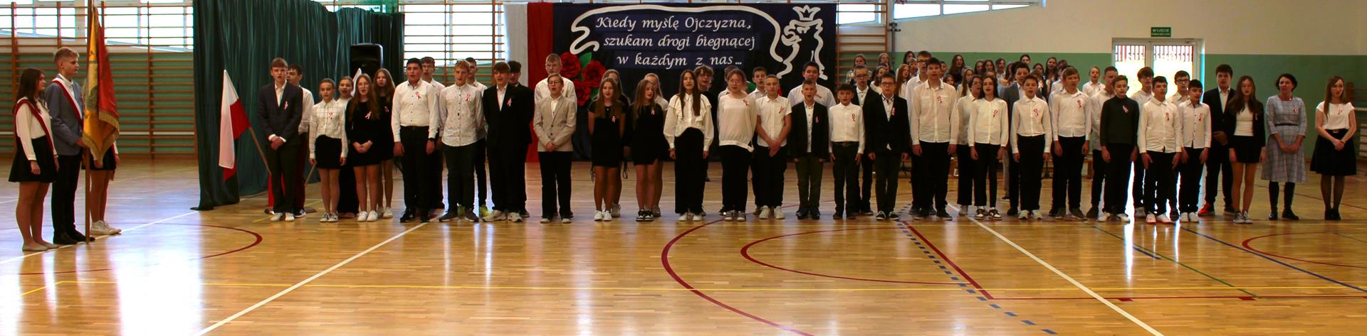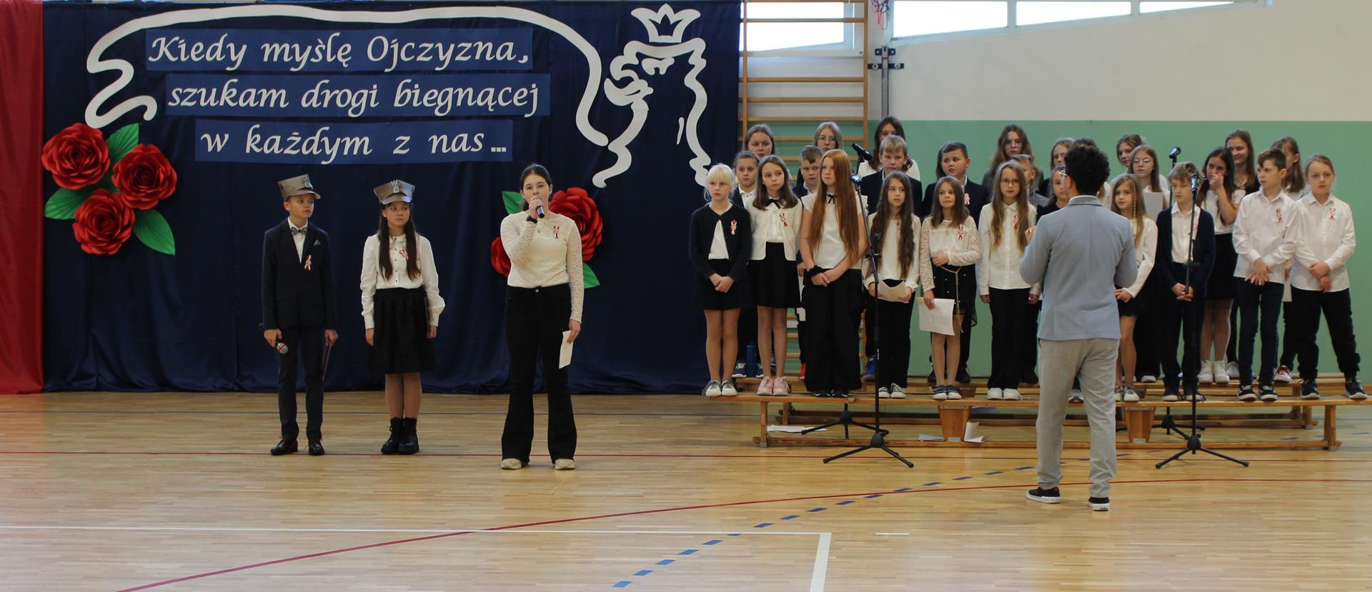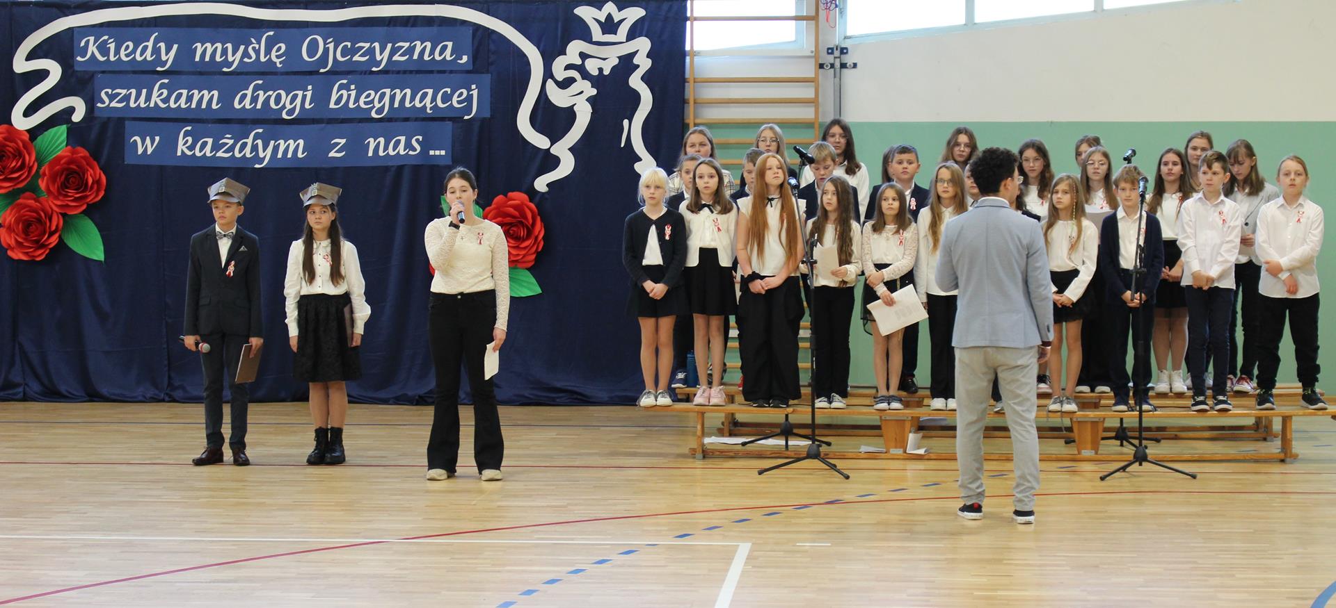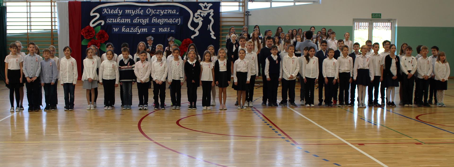 Uroczystość prowadzili uczniowie klasy 6 b, Zofia Białkowska oraz Szymon Pucek, którzy przypomnieli wszystkim zebranym, co znaczy „być Polakiem”. W tym roku apel został przygotowany w formie koncertu. Każda klasa miała okazję zaprezentować swoje umiejętności wokalne. Uczniowie zaśpiewali utwory: wzruszającą pieśń legionisty „O mój rozmarynie” (klasy 0-2), żywy i energiczny „Marsz pierwszej kadrowej” (klasy 3-4), skłaniający do refleksji utwór „Ojczyzno ma” (klasy 5-6) oraz pełną nadziei pieśń „Szara piechota” (klasy 7-8). Występy muzyczne klas były wspierane śpiewem chóru szkolnego. Zwieńczeniem uroczystości było wspólne zaśpiewanie pieśni patriotycznej „Uwierz Polsko”.