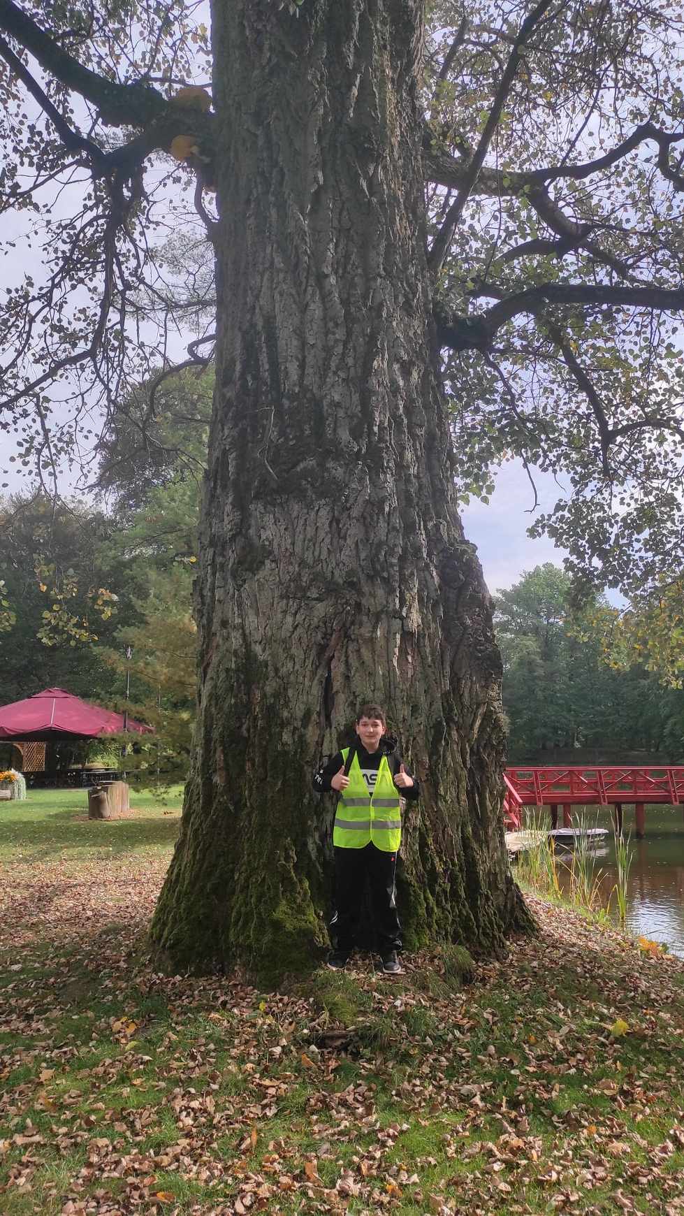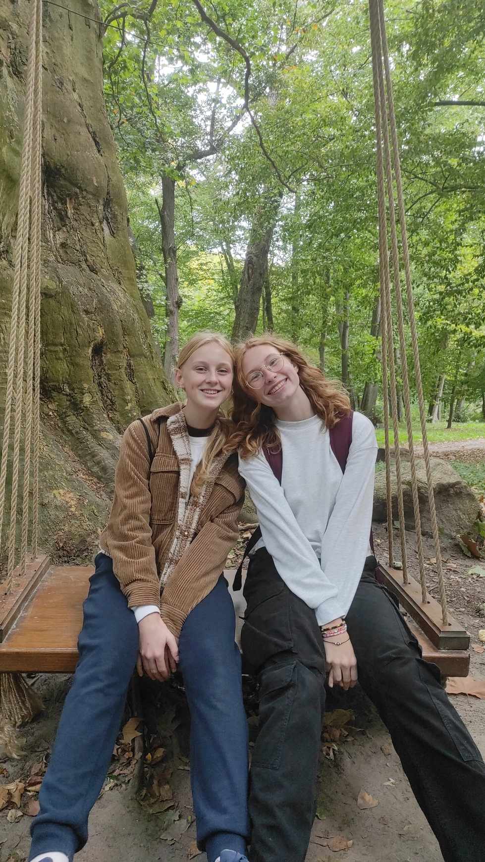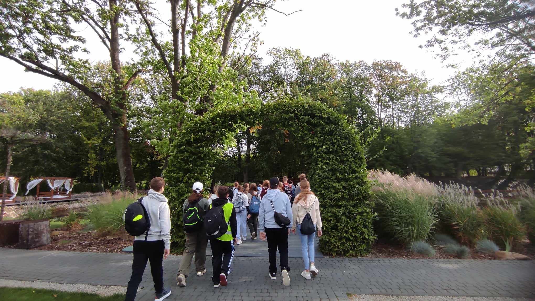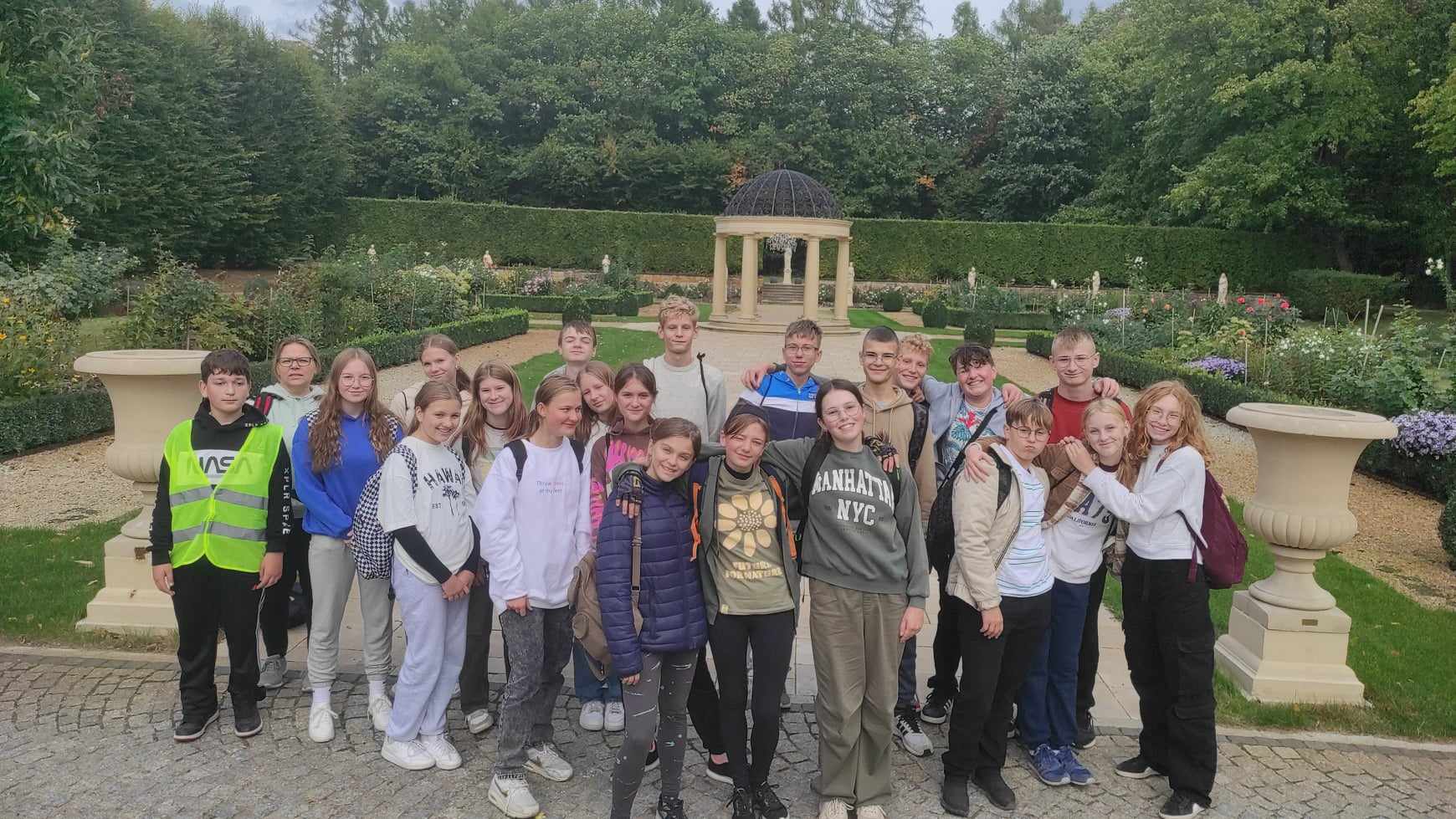 Następnie pojechaliśmy do parku przy Pałacu w Małej Wsi. Na miejscu sprawdzaliśmy, ile osób potrzeba, żeby objąć drzewo, które jest uznane za pomnik przyrody - potrzebne było siedem osób, nie wiedziałem, że drzewo może być tak pokaźnych rozmiarów. W ogrodach spacerowaliśmy pomiędzy stawami, ogromnymi drzewami, zielonymi labiryntami z bukszpanu a  ogrodem różanym. Zrobiliśmy pamiątkowe zdjęcie na ogromnej huśtawce zawieszonej na drzewie. Obeszliśmy Pałac i cały kompleks z zewnątrz.