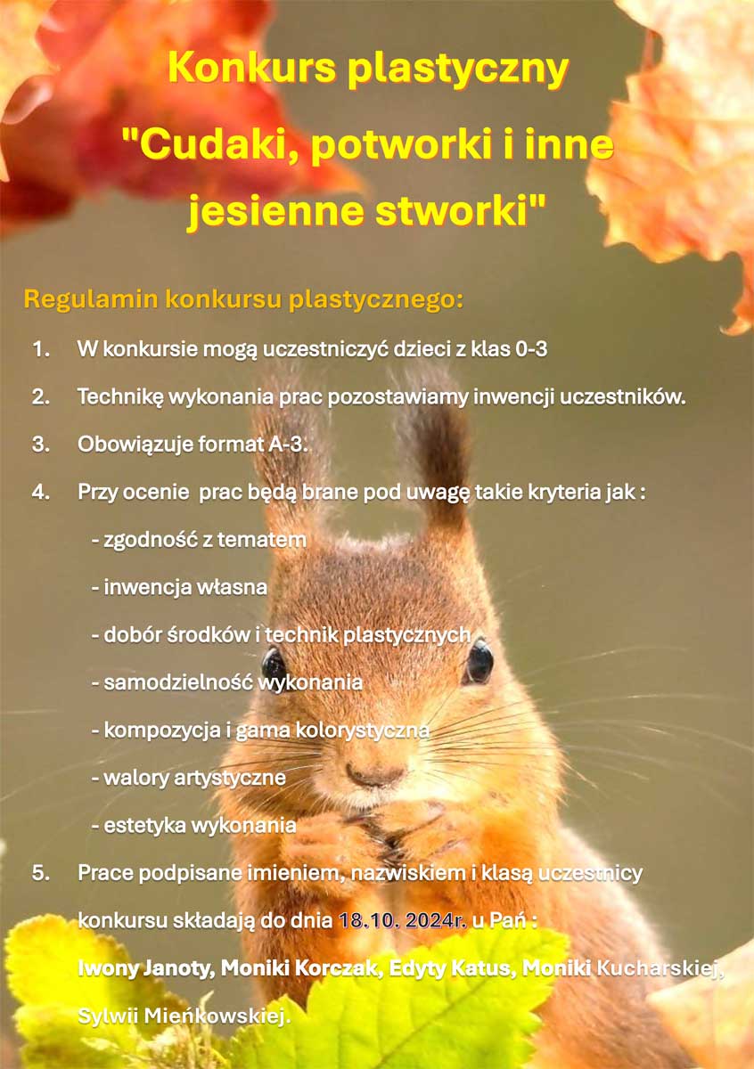 5. Prace podpisane imieniem, nazwiskiem i klasą uczestnicy konkursu składają do dnia 18.10.2024 r. u pań: I. Janoty, M. Korczak, E. Katus, M. Kucharskiej, S. Mieńkowskiej.