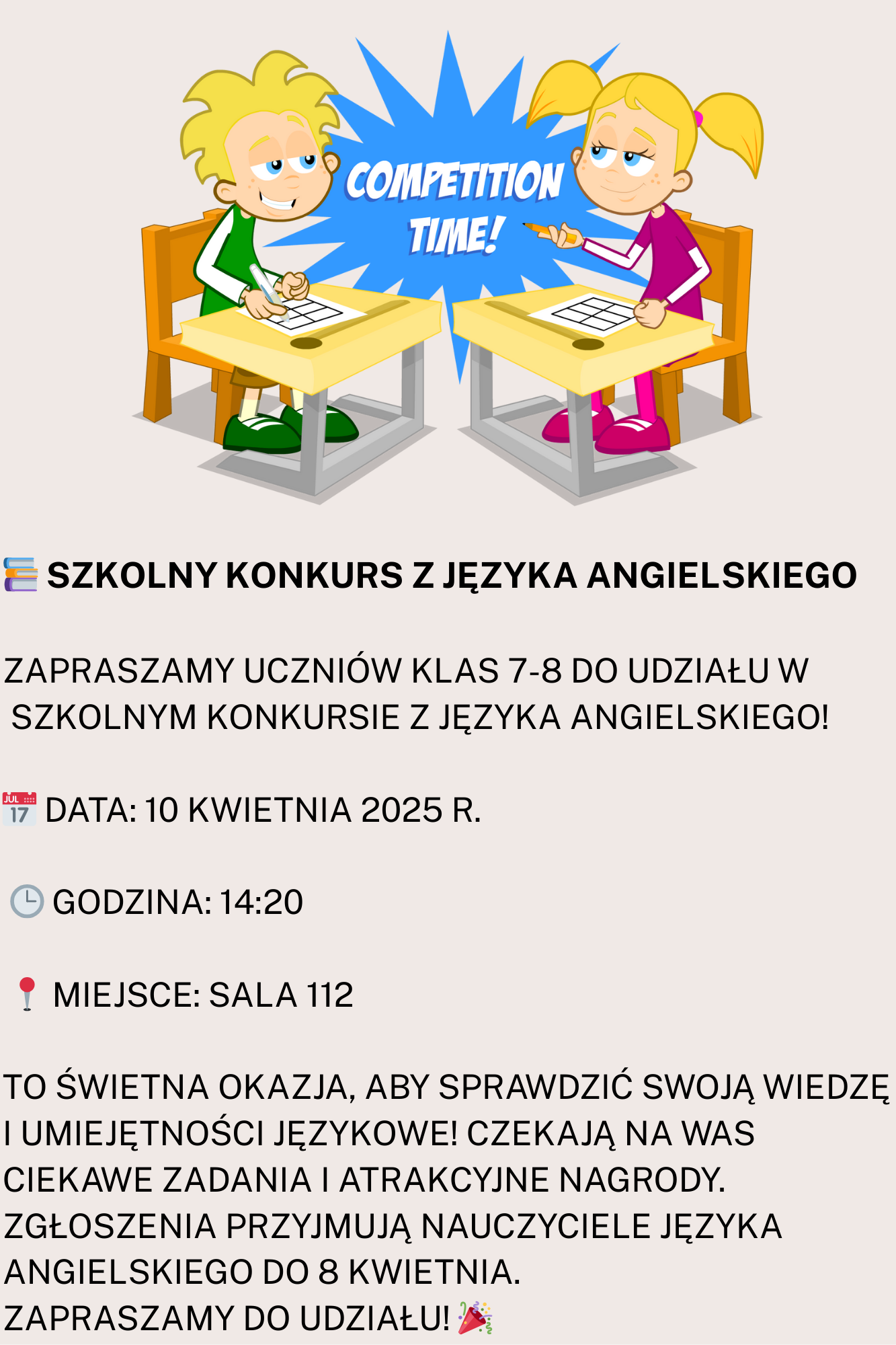 W konkursie mogą wziąć udział uczniowie klas 7-8, którzy zgłoszą swoje uczestnictwo do 8 kwietnia 2025 r. u nauczycieli języka angielskiego.