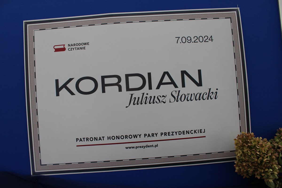 Tegoroczną lekturą Narodowego Czytania jest "Kordian” Juliusza Słowackiego – „[…] arcydzieło polskiego romantyzmu, utwór mądry i poruszający, pełen artystycznych walorów i rozważań o najistotniejszych sprawach narodu. To dramat, który zagłębia się w polską duszę i polskość, odkrywając zarazem uniwersalną prawdę o świecie. Poeta nakreślił w nim sugestywną wizję historii, w której dobro walczy ze złem, a prawda z kłamstwem, ale na pierwszym planie umieścił polskiego patriotę – z jego tęsknotą za wolną i suwerenną ojczyzną, wyzwoloną spod rosyjskiego jarzma. Dziś trudno w pełni zrozumieć nastroje Polaków pod zaborami bez znajomości tego utworu” – napisał w liście Prezydent RP Andrzej Duda.