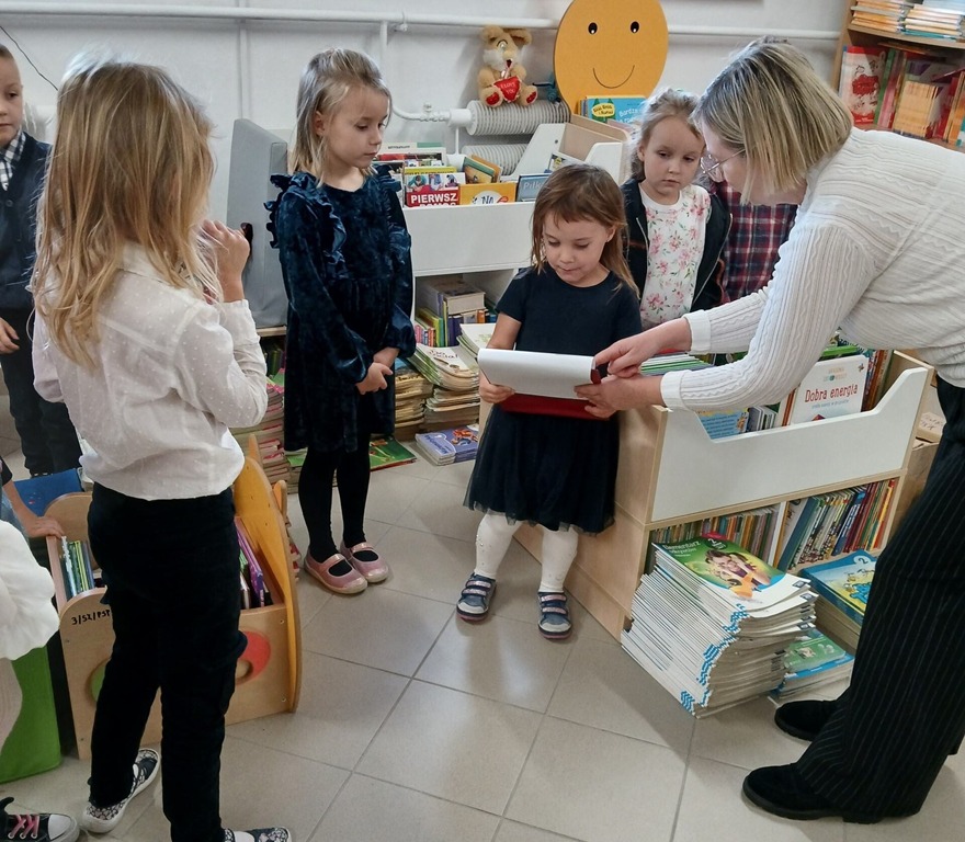 Dzieci z oddziału zerowego naszej szkoły odwiedziły 28.10.2024 r. szkolną Bibliotekę, aby zapoznać się z miejscem pełnym kolorowych książek i złożyć uroczyste ślubowanie, po którym stały się pełnoprawnymi czytelnikami. W trakcie spotkania z bibliotekarką najmłodsi wykazali się znajomością wielu baśni oraz zdobyli wiedzę na temat zasad zachowania się w Bibliotece. Po pasowaniu wszyscy otrzymali pamiątkowe dyplomy.