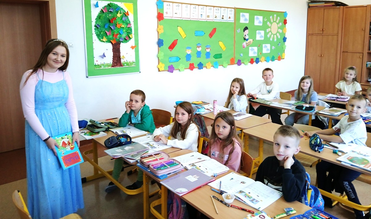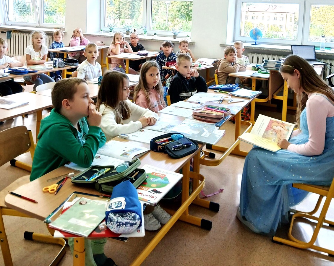 Uczennice kl. 8 b – Natalia Kamińska i Wiktoria Dudek 11.10.2024 r. wzięły udział w wydarzeniu Dzień Głośnego Czytania. Jako księżniczki czytały dzieciom z oddziału zerowego i klas młodszych ulubione baśnie.