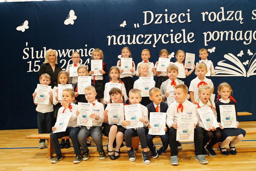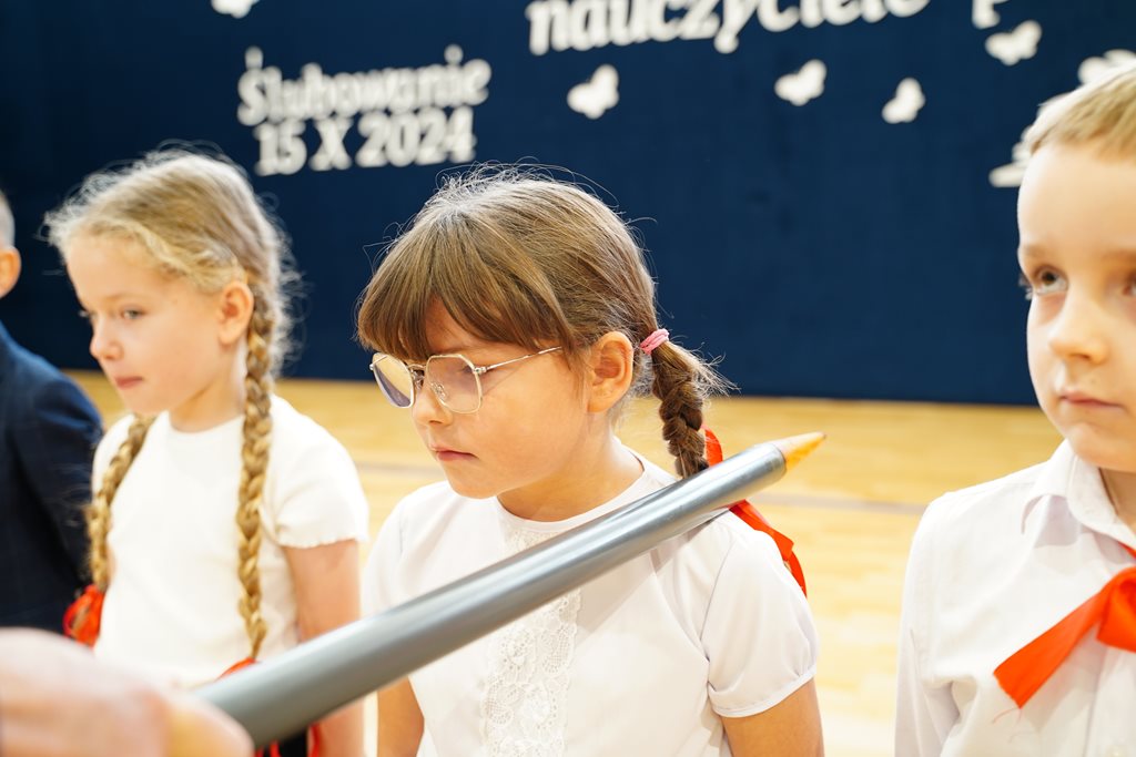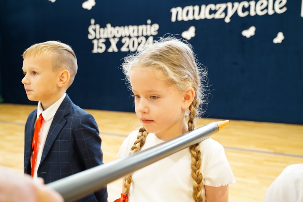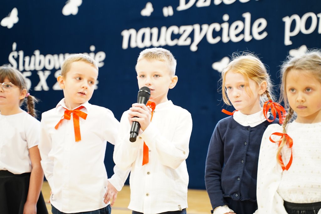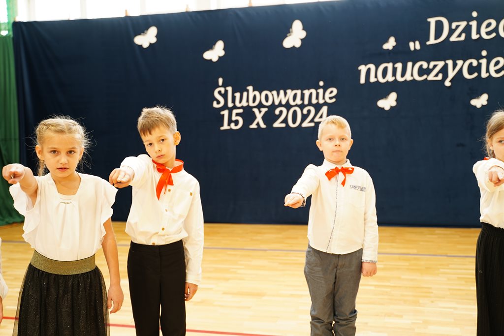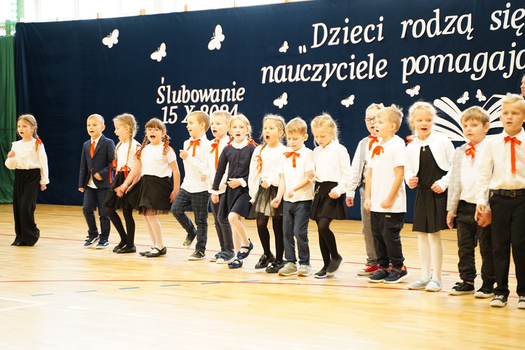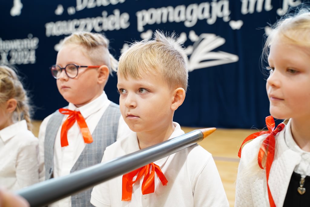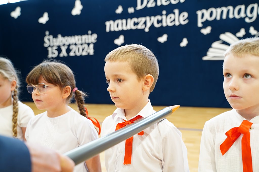 W dniu 15 października 2024 r. w naszej szkole odbyła się uroczystość ślubowania uczniów klas pierwszych połączona z uroczystym apelem z okazji Dnia Edukacji Narodowej. W wydarzeniu uczestniczyli uczniowie, nauczyciele oraz rodzice. Uroczystość rozpoczęła się od wprowadzenia sztandaru szkoły i odśpiewania hymnu państwowego. Nowi uczniowie złożyli uroczyste ślubowanie, w którym zobowiązali się być pilnymi i sumiennymi uczniami, szanować swoich nauczycieli oraz godnie reprezentować szkołę. Po ślubowaniu nastąpił moment pasowania na uczniów, które przeprowadził pan dyrektor, dotykając symbolicznie każde dziecko dużym ołówkiem. Część artystyczna była niezwykle barwna i radosna. Dzieci śpiewały piosenki, recytowały wiersze oraz zaprezentowały taniec, który wzbudził entuzjazm wśród zgromadzonej publiczności. Wychowawcy wręczyli uczniom pamiątkowe dyplomy.