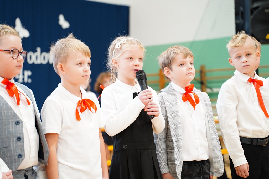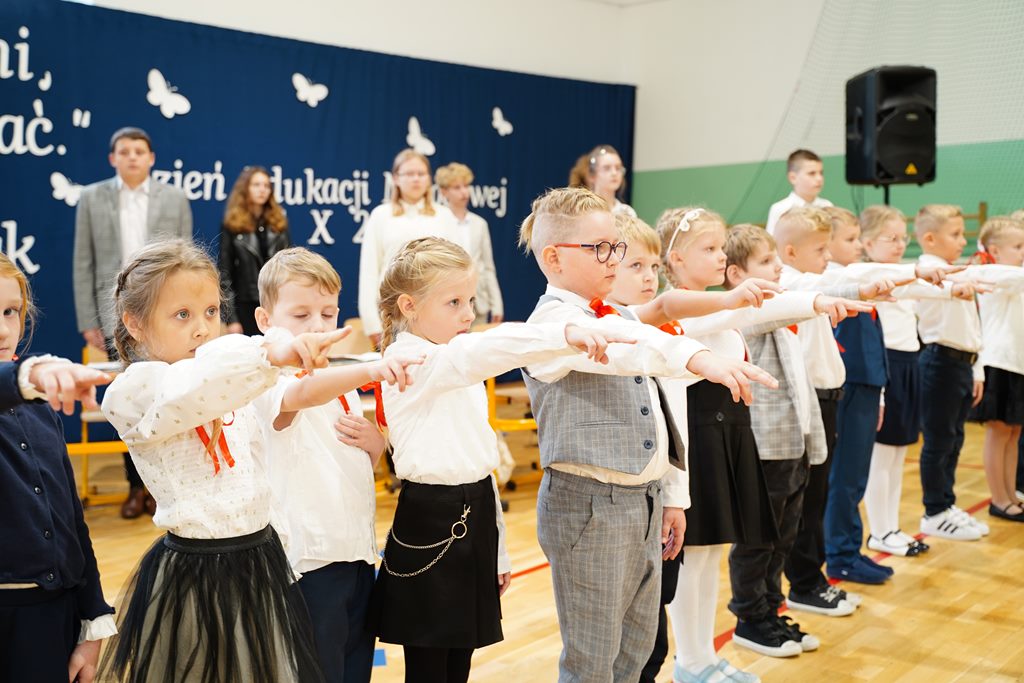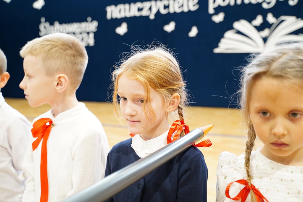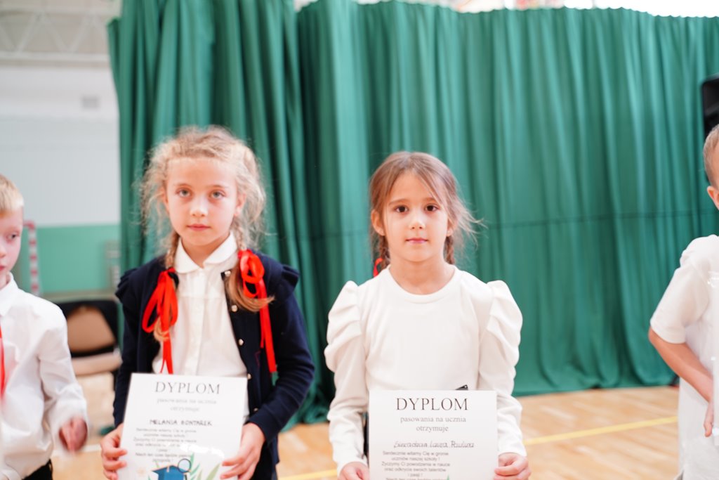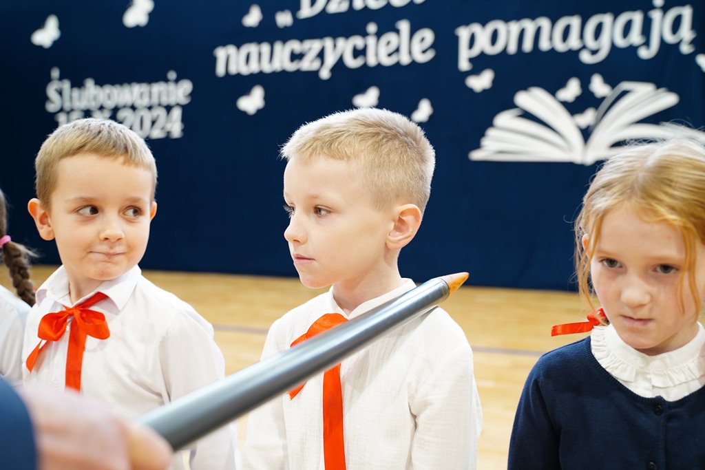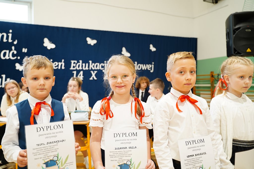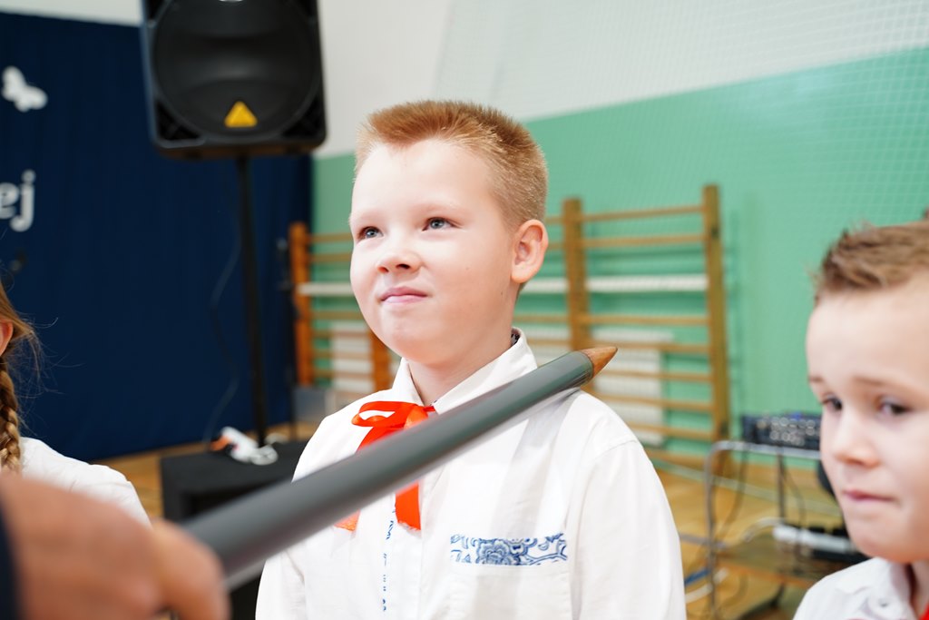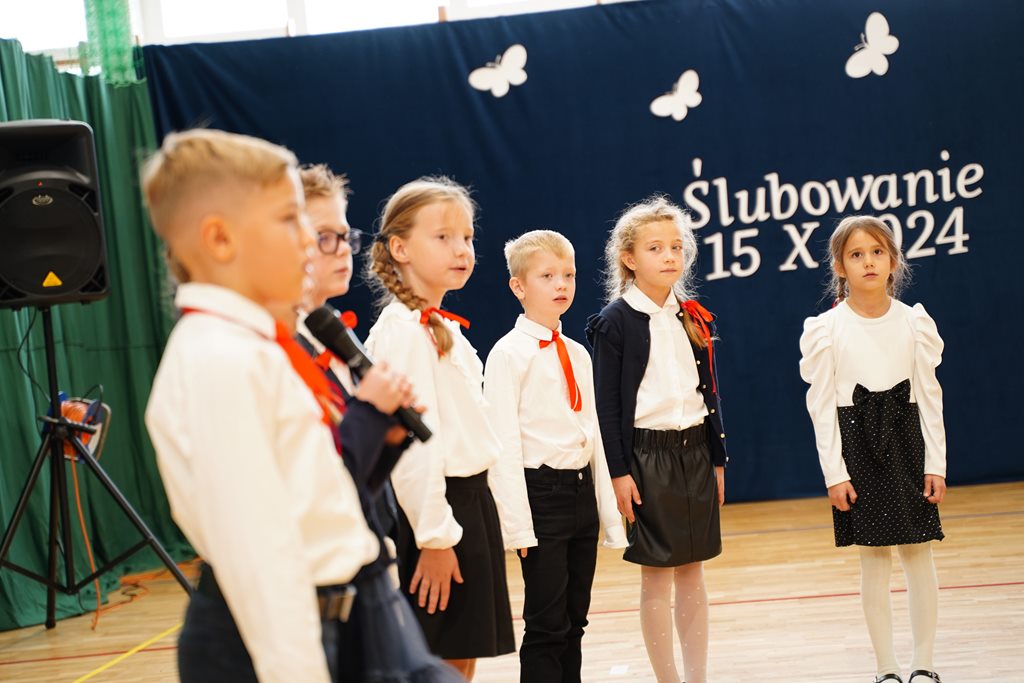 W dniu 15 października 2024 r. w naszej szkole odbyła się uroczystość ślubowania uczniów klas pierwszych połączona z uroczystym apelem z okazji Dnia Edukacji Narodowej. W wydarzeniu uczestniczyli uczniowie, nauczyciele oraz rodzice. Uroczystość rozpoczęła się od wprowadzenia sztandaru szkoły i odśpiewania hymnu państwowego. Nowi uczniowie złożyli uroczyste ślubowanie, w którym zobowiązali się być pilnymi i sumiennymi uczniami, szanować swoich nauczycieli oraz godnie reprezentować szkołę. Po ślubowaniu nastąpił moment pasowania na uczniów, które przeprowadził pan dyrektor, dotykając symbolicznie każde dziecko dużym ołówkiem. Część artystyczna była niezwykle barwna i radosna. Dzieci śpiewały piosenki, recytowały wiersze oraz zaprezentowały taniec, który wzbudził entuzjazm wśród zgromadzonej publiczności. Wychowawcy wręczyli uczniom pamiątkowe dyplomy.