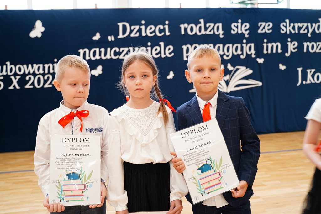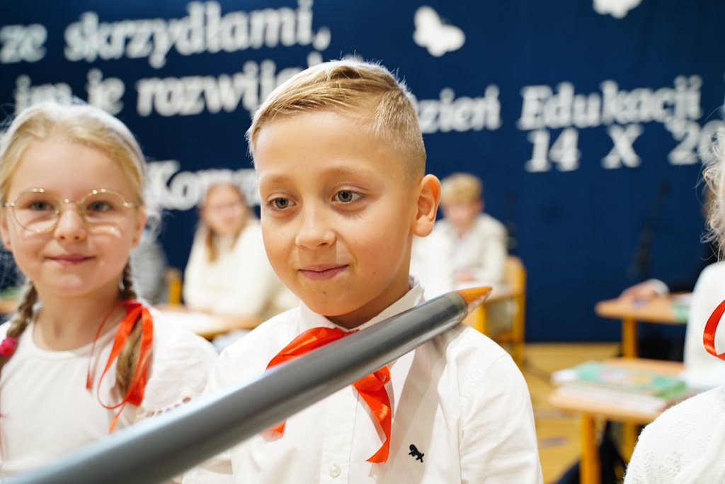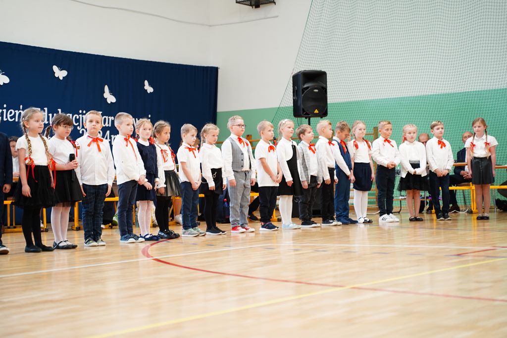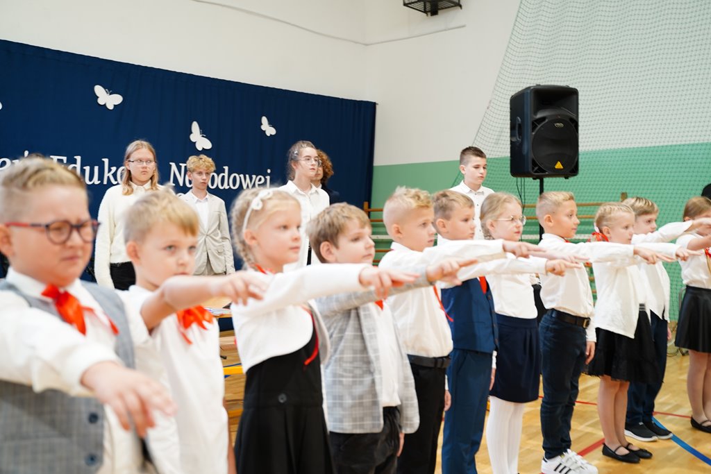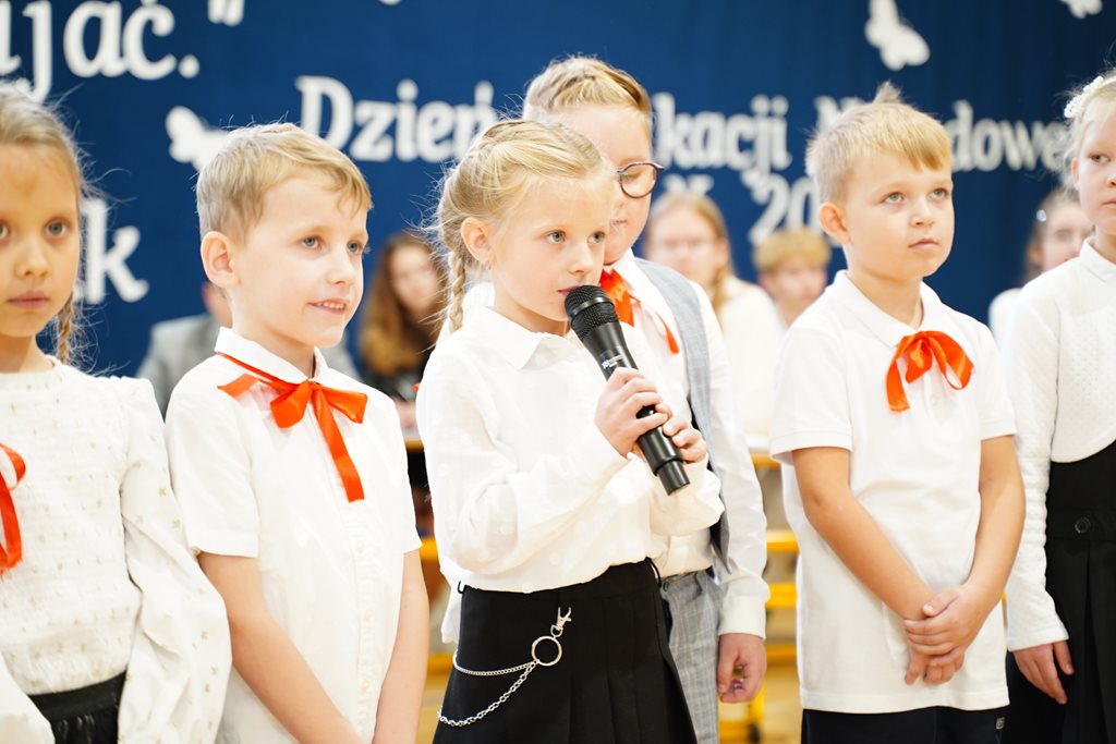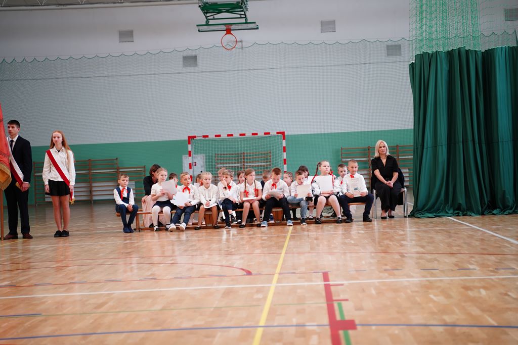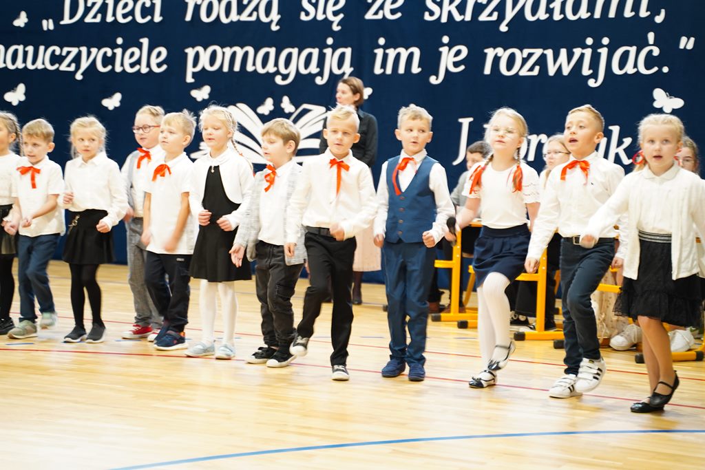 W dniu 15 października 2024 r. w naszej szkole odbyła się uroczystość ślubowania uczniów klas pierwszych połączona z uroczystym apelem z okazji Dnia Edukacji Narodowej. W wydarzeniu uczestniczyli uczniowie, nauczyciele oraz rodzice. Uroczystość rozpoczęła się od wprowadzenia sztandaru szkoły i odśpiewania hymnu państwowego. Nowi uczniowie złożyli uroczyste ślubowanie, w którym zobowiązali się być pilnymi i sumiennymi uczniami, szanować swoich nauczycieli oraz godnie reprezentować szkołę. Po ślubowaniu nastąpił moment pasowania na uczniów, które przeprowadził pan dyrektor, dotykając symbolicznie każde dziecko dużym ołówkiem. Część artystyczna była niezwykle barwna i radosna. Dzieci śpiewały piosenki, recytowały wiersze oraz zaprezentowały taniec, który wzbudził entuzjazm wśród zgromadzonej publiczności. Wychowawcy wręczyli uczniom pamiątkowe dyplomy.