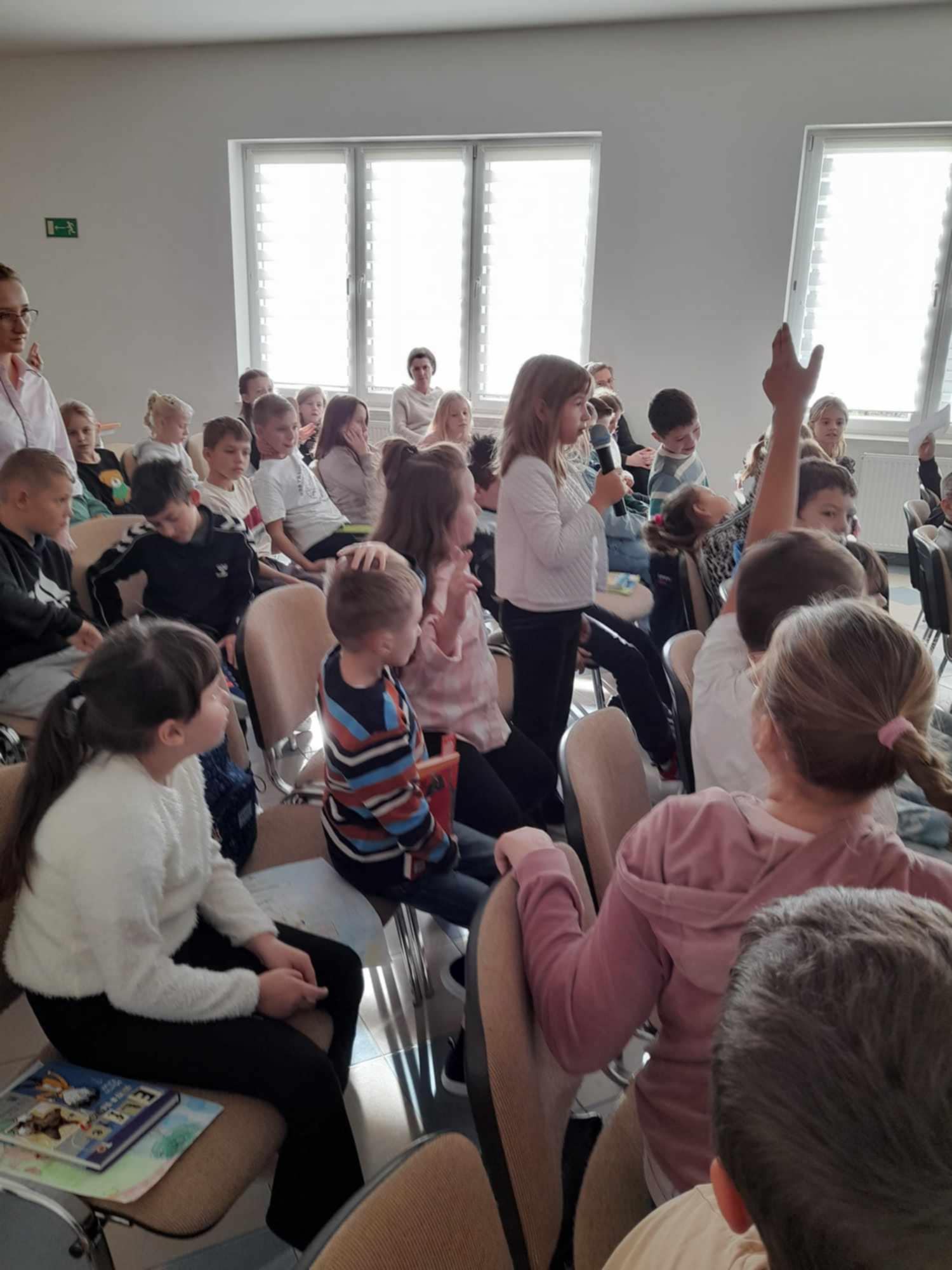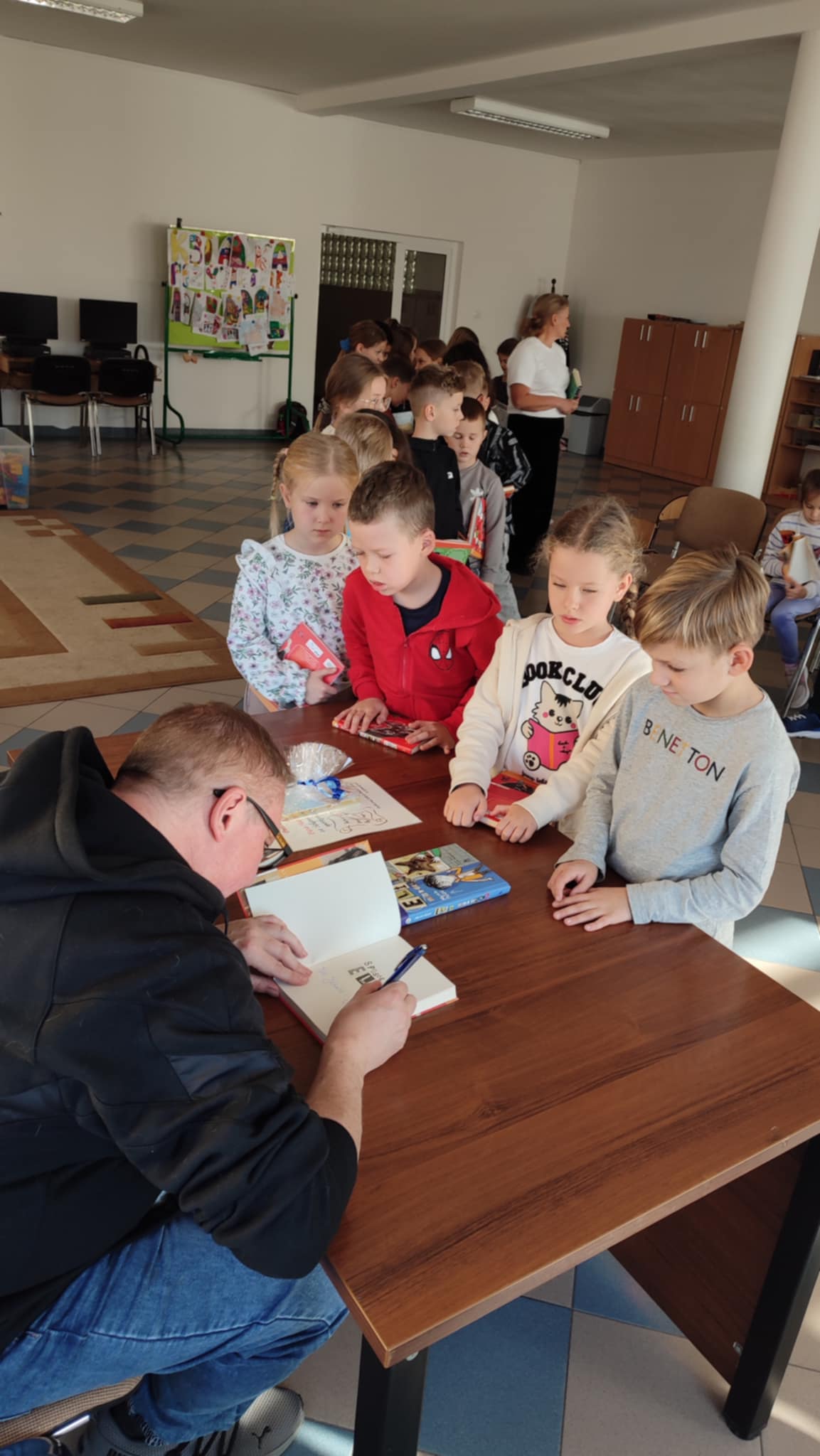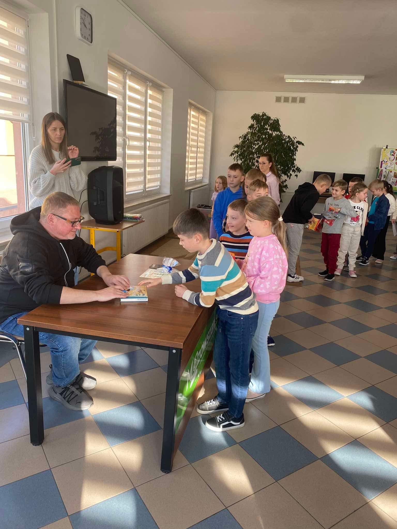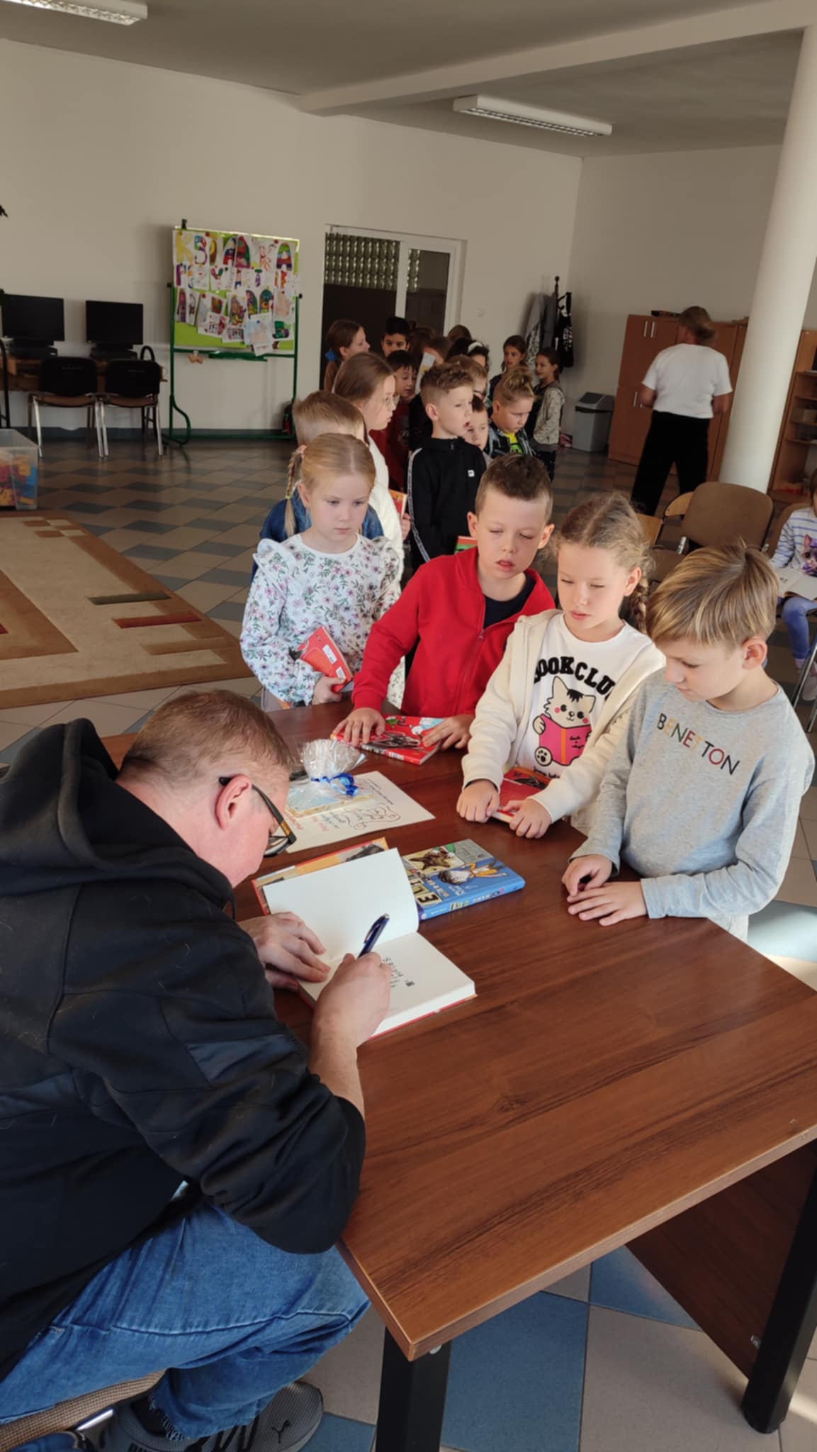 17 października 2024 roku w naszej szkole odbyło się spotkanie autorskie z pisarzem książek dla dzieci i młodzieży – panem Marcinem Pałaszem. W sali konferencyjnej zebrali się wszyscy uczniowie klas 0-3. Zarówno młodsi, jak i starsi brali czynny udział w spotkaniu – w skupieniu słuchali historii opowiadanych przez pana Marcina, zadawali nurtujące ich pytania, lecz przede wszystkim śmiali się w głos, bowiem nasz gość okazał się świetnym gawędziarzem.