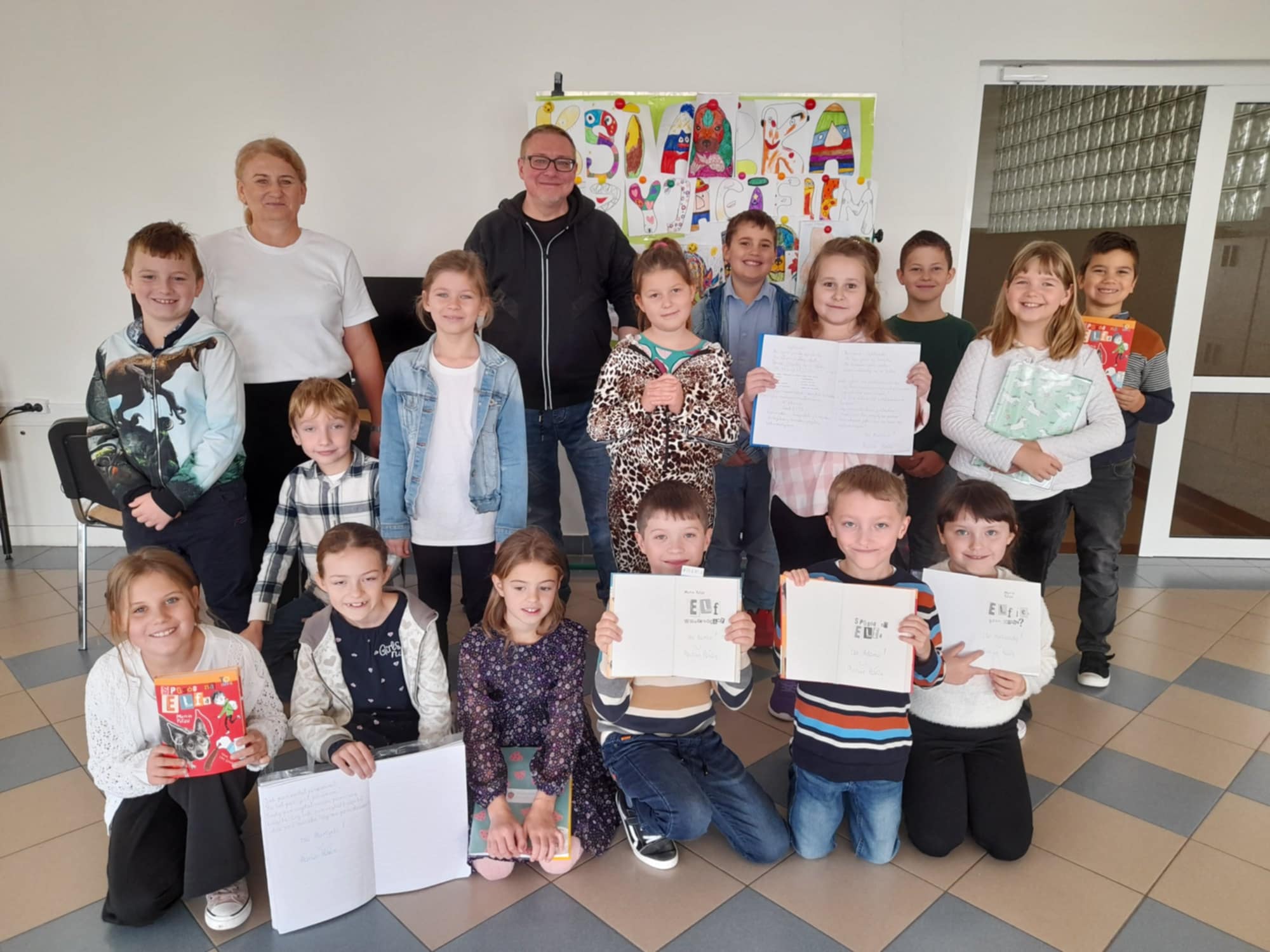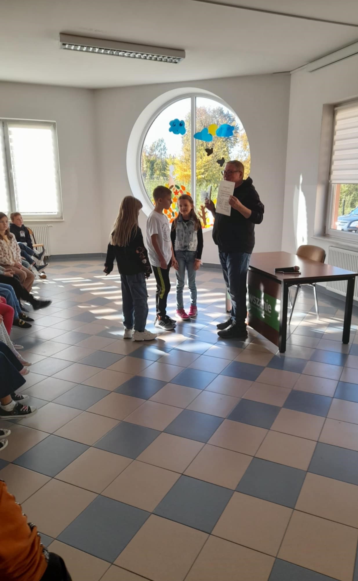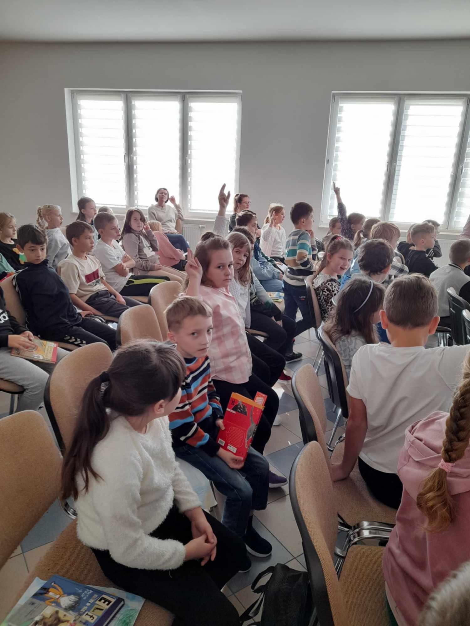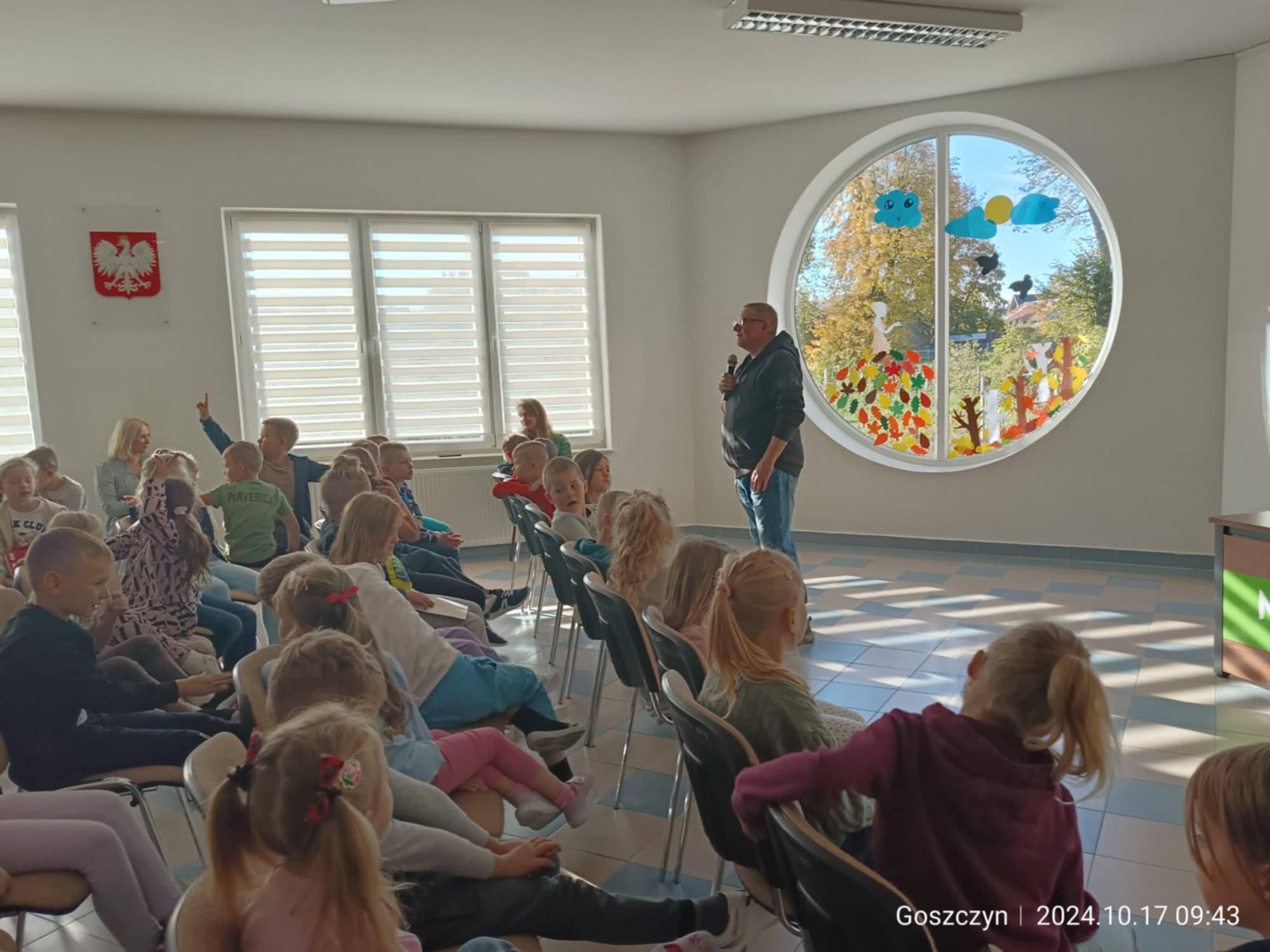 17 października 2024 roku w naszej szkole odbyło się spotkanie autorskie z pisarzem książek dla dzieci i młodzieży – panem Marcinem Pałaszem. W sali konferencyjnej zebrali się wszyscy uczniowie klas 0-3. Zarówno młodsi, jak i starsi brali czynny udział w spotkaniu – w skupieniu słuchali historii opowiadanych przez pana Marcina, zadawali nurtujące ich pytania, lecz przede wszystkim śmiali się w głos, bowiem nasz gość okazał się świetnym gawędziarzem.