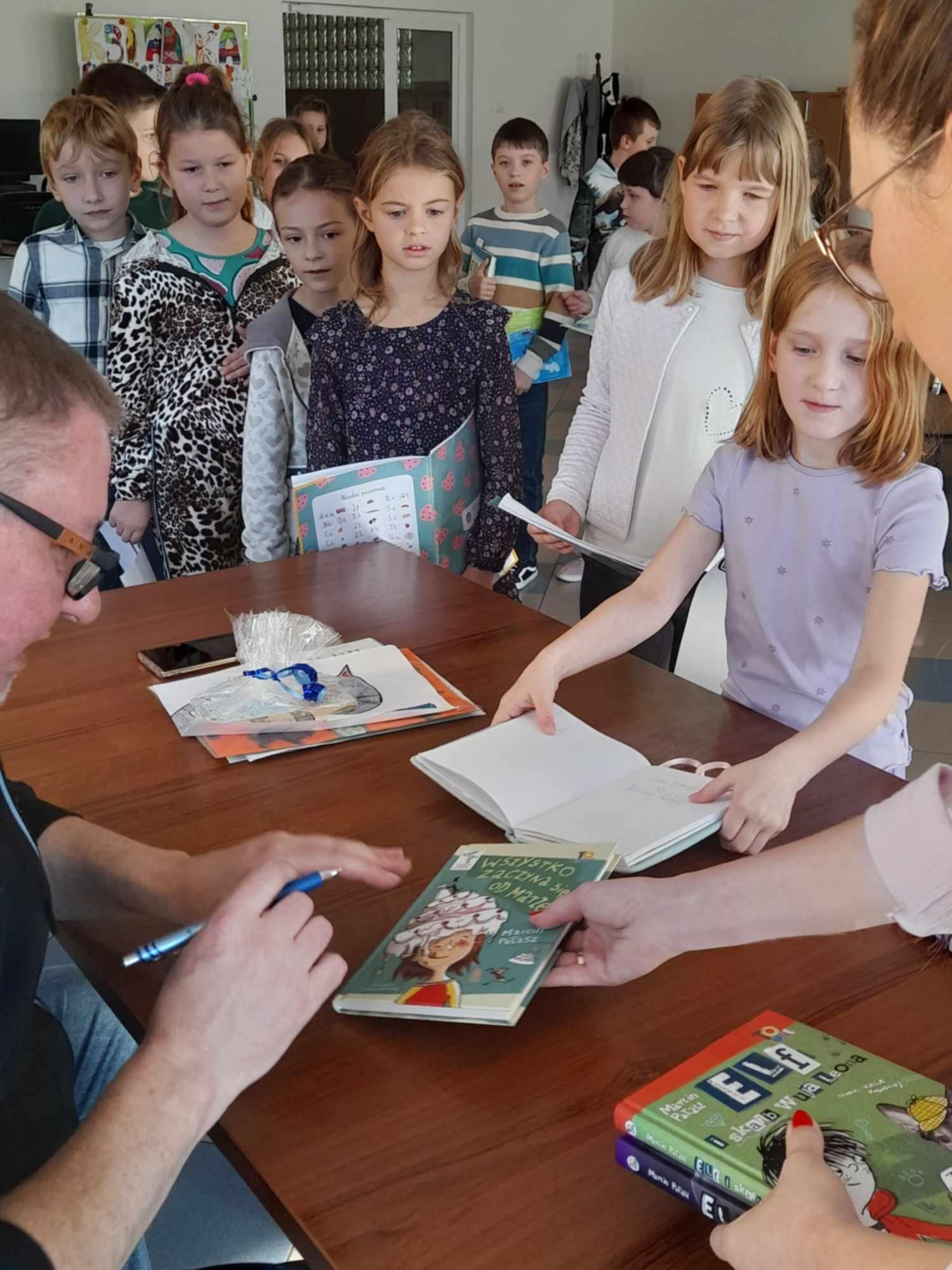 Pan Marcin opowiadał o wydanych książkach, o swoich pasjach, o tym, jak wygląda praca pisarza na co dzień i oczywiście o przyjacielu Elfie – głównym bohaterze jego utworów; podpisał także książki zakupione przez uczniów.
