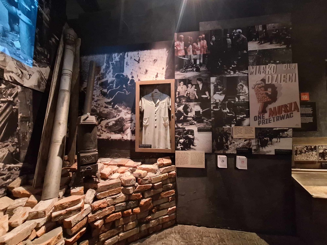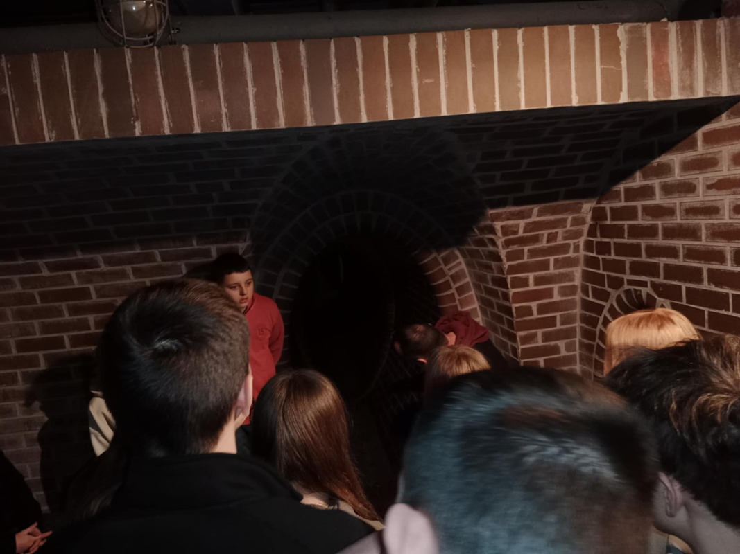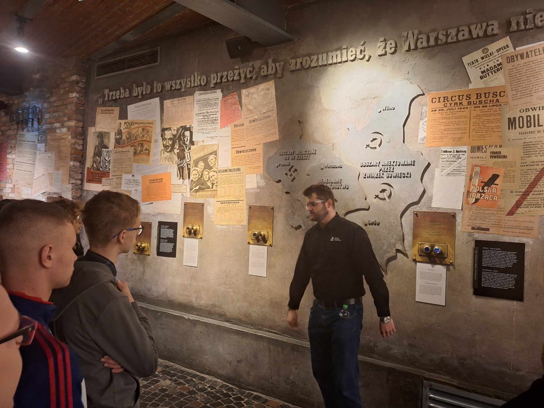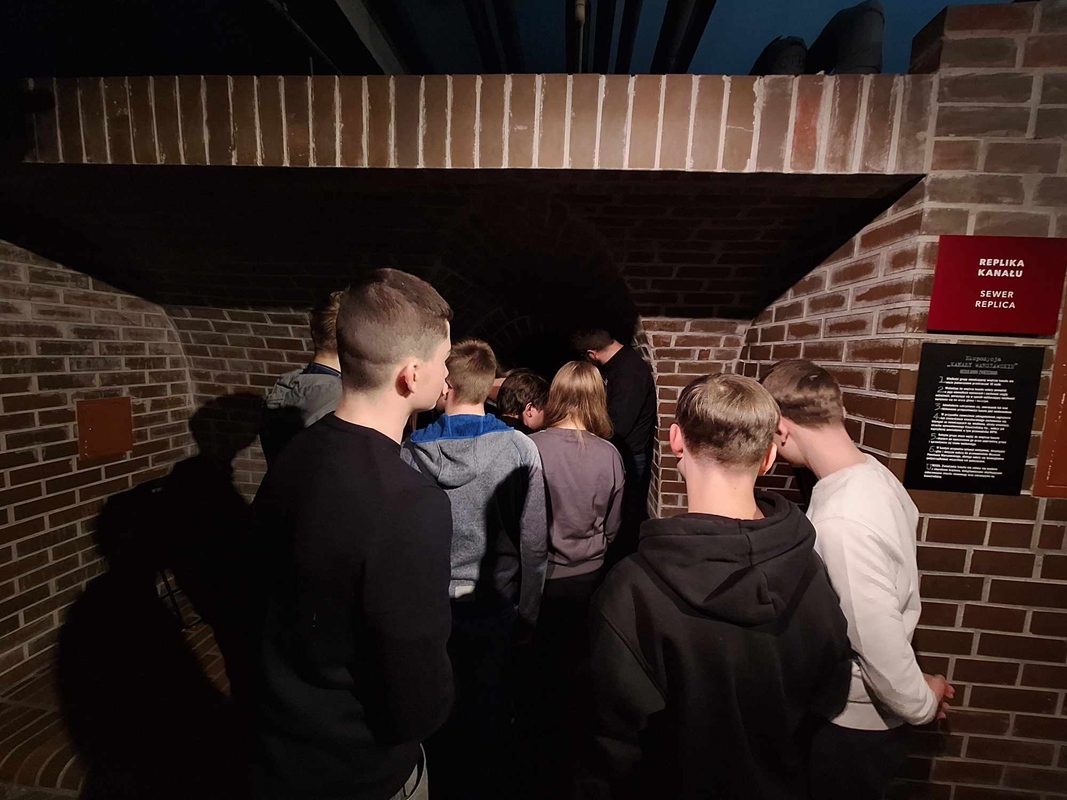 Ostatnim punktem wycieczki była wizyta w Muzeum Powstania Warszawskiego. Uczniowie zwiedzali wystawy muzealne pod opieką przewodników, którzy w bardzo szczegółowy sposób opowiedzieli nam o genezie powstania, jego przebiegu oraz straszliwych skutkach. Widzieliśmy rodzaje broni, jakich używali powstańcy, mundury, które nosili, ale także przedmioty codziennego użytku. Nowoczesne elementy, takie jak: monitory, komputery, filmy czy zasoby audio, których mogliśmy wysłuchać, robiły ogromne wrażenie na odbiorcach. W muzeum przez cały czas wybrzmiewa głośno odgłos bijącego serca (symbolizującego życie mieszkańców Warszawy), ale także odgłosy walk, strzałów, wybuchów. Centralnym punktem muzeum jest replika samolotu „Liberator B-24J” (w skali 1:1). Mogliśmy przejść się kanałem, co miało nam uzmysłowić, w jakich warunkach uciekali warszawiacy w czasie walk. Na koniec obejrzeliśmy krótki film 3D pt. „Miasto Ruin”, na którym ukazana była zniszczona Warszawa z 1945 roku. Na zewnątrz widzieliśmy Mur Pamięci, z wyrytymi nazwiskami blisko jedenastu tysięcy poległych Powstańców, a także samochód pancerny „Kubuś”, którego zadaniem była m.in. osłona wycofujących się żołnierzy, dziś ważny symbol Powstania Warszawskiego.