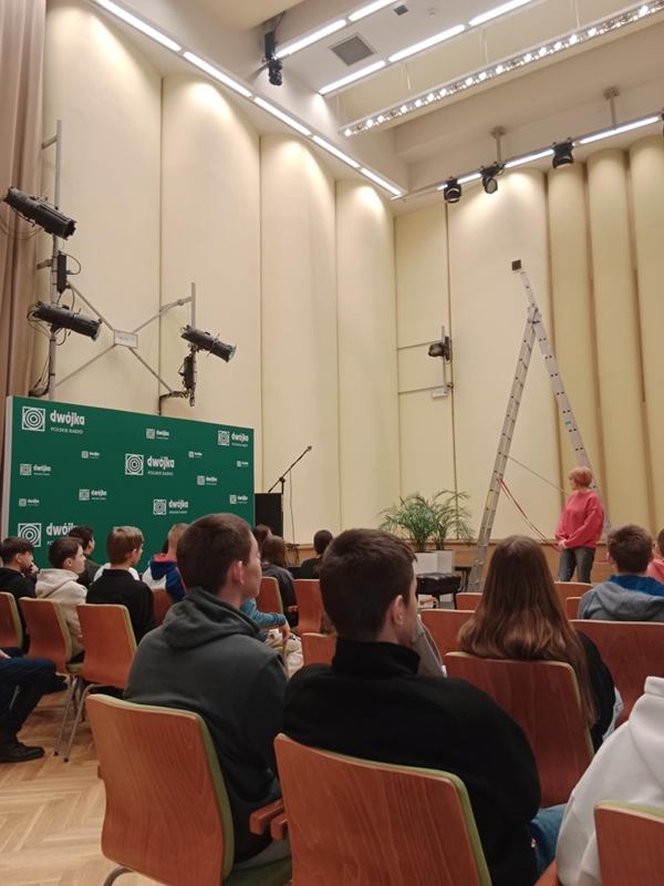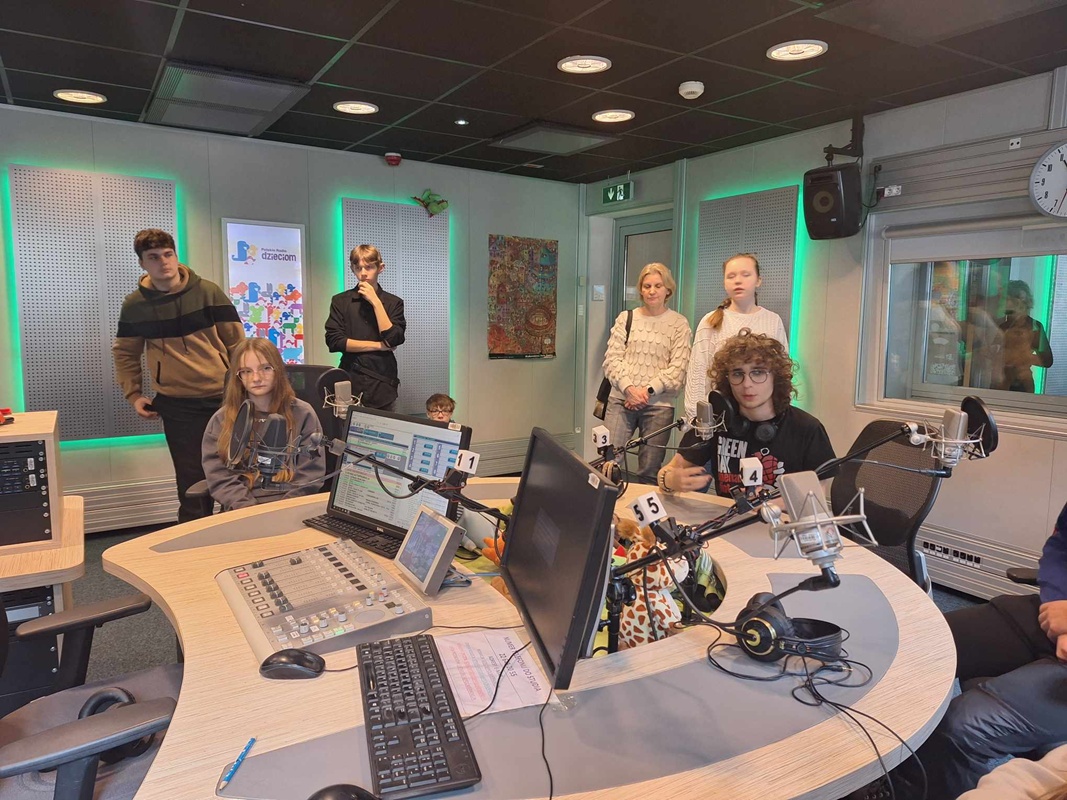 Kolejnym miejscem, do którego się udaliśmy, było Polskie Radio. O 100-letniej już rozgłośni opowiadała nam dziennikarka i aktorka dubbingowa – Agnieszka Kunikowska, której głos możemy znać m.in. z bajek: „Marta mówi” czy Shrek (królewna Fiona). Pani Agnieszka opowiedziała nam na temat: historii Polskiego Radia, działalności, a także o jego różnych rozgłośniach. Później mogliśmy zwiedzić sam budynek (przy al. Niepodległości) – obejrzeliśmy studio „Polskiego Radia Dzieciom” i studio „Czwórki Polskiego Radia”. Dowiedzieliśmy się, jak trudna jest praca dziennikarza radiowego oraz jakie cechy charakterologiczne są niezbędne do wykonywania tego zawodu. To była bardzo ciekawa i inspirująca wizyta.