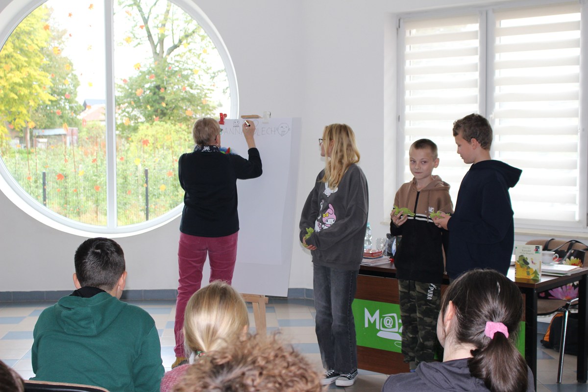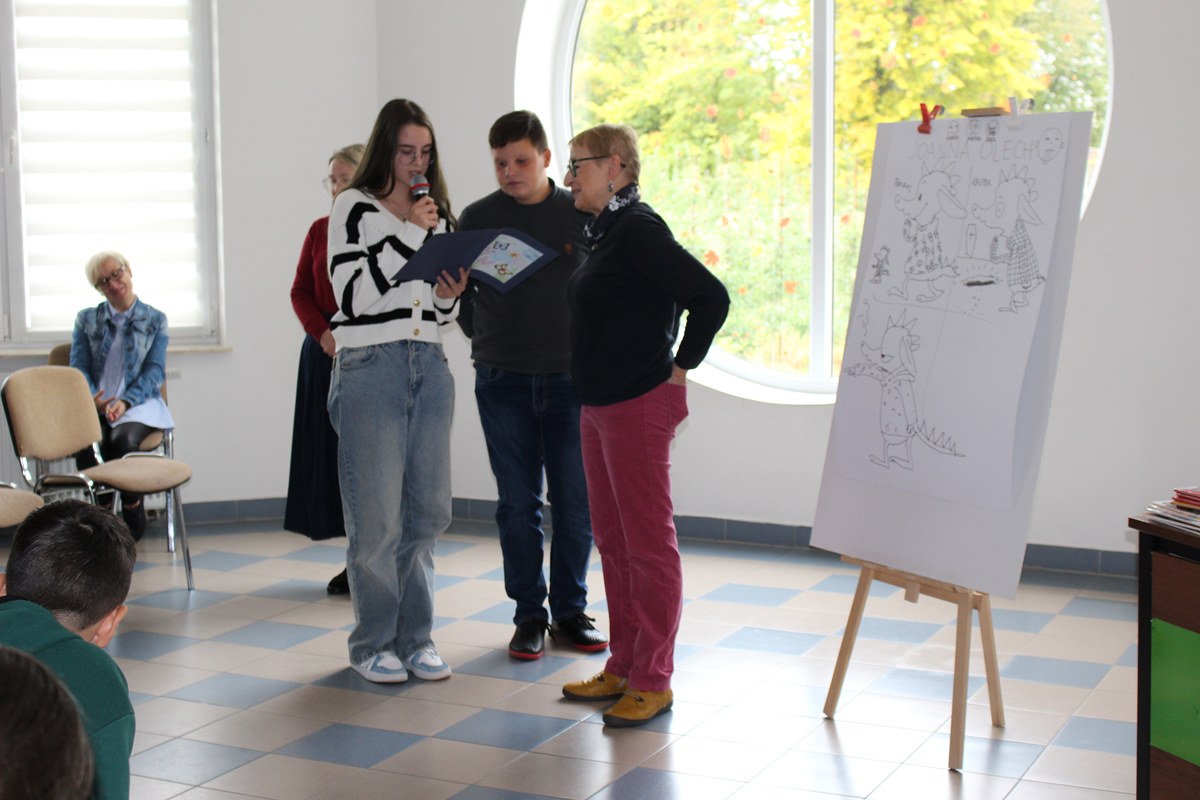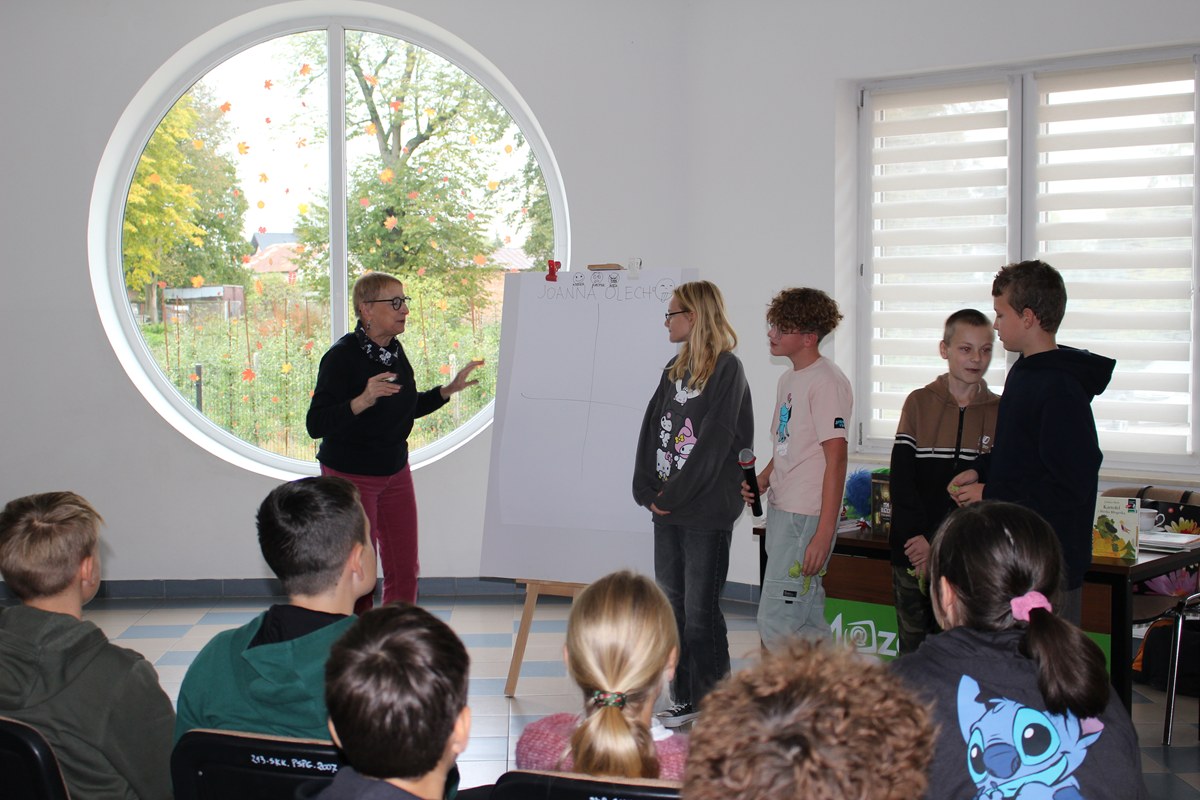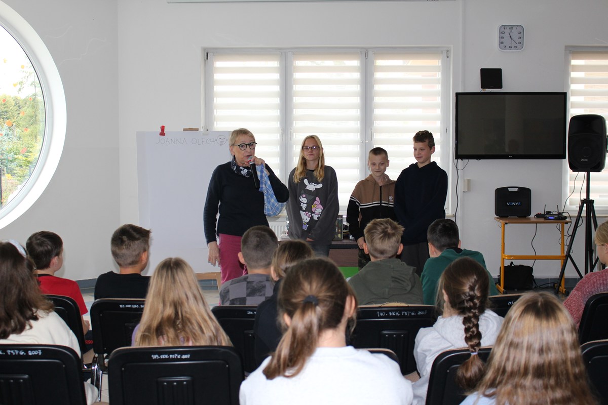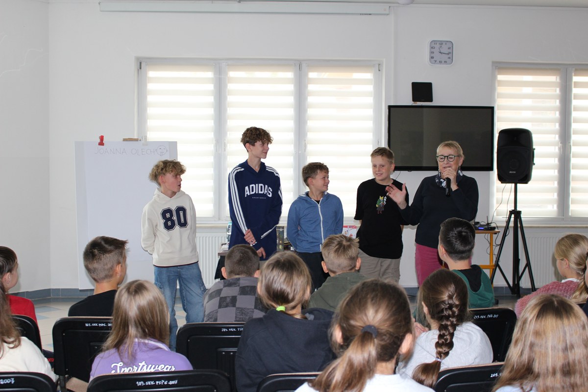 Pisarka, niczym Święty Mikołaj, nagradzała uczestników spotkania angażujących się w zaproponowane aktywności. Uczniowie odwzajemniali się dużą ilością śmiechów i uśmiechów.