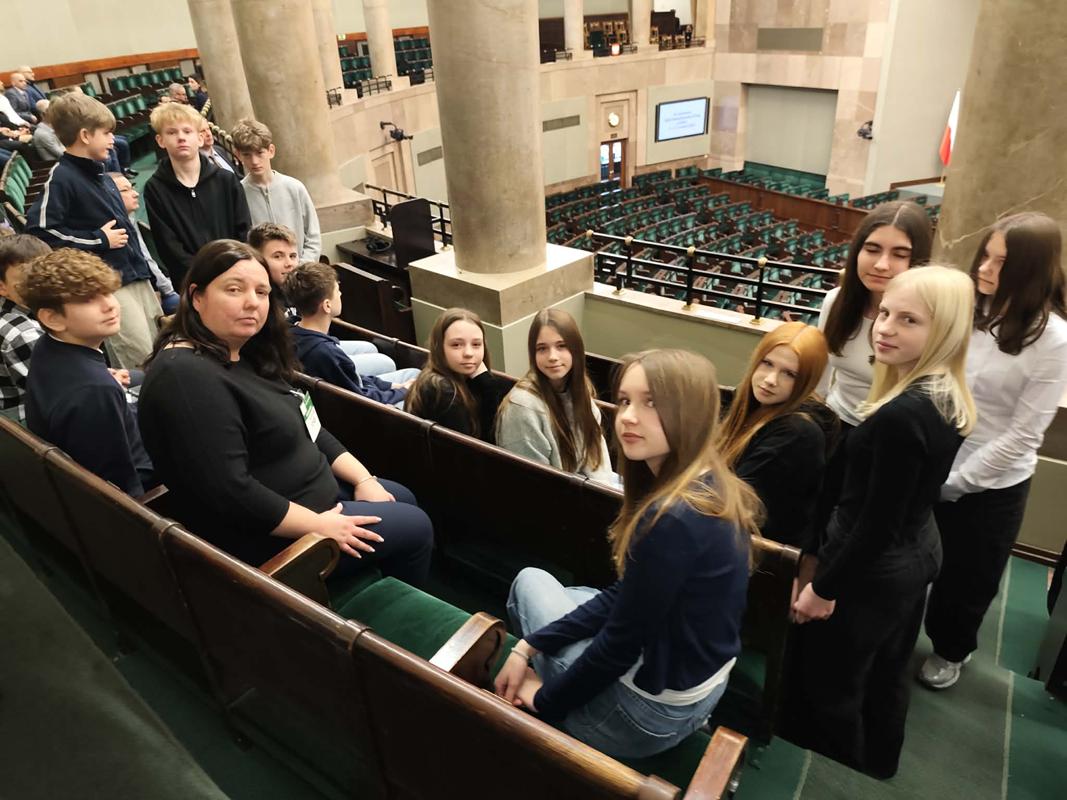 Pierwszym punktem naszej wycieczki było zwiedzanie Sejmu Rzeczypospolitej Polskiej. Podczas wizyty uczniowie mieli okazję zobaczyć jedno z najważniejszych miejsc w Polsce, w którym podejmowane są decyzje dotyczące funkcjonowania państwa. Przewodnik opowiedział nam o historii polskiego parlamentaryzmu oraz o roli Sejmu w systemie władzy w Polsce. Dowiedzieliśmy się, że Sejm jest izbą niższą polskiego parlamentu i zasiada w nim 460 posłów wybieranych w wyborach powszechnych. Posłowie pracują nad projektami ustaw, uczestniczą w debatach oraz głosują nad ważnymi decyzjami dotyczącymi życia społecznego, gospodarczego i politycznego kraju. Podczas zwiedzania mogliśmy zobaczyć Salę Posiedzeń Sejmu, w której odbywają się obrady posłów. Zwróciliśmy uwagę na charakterystyczną kopułę nad salą oraz układ miejsc dla posłów. Dowiedzieliśmy się również, gdzie zasiada Marszałek Sejmu oraz jak wygląda przebieg posiedzeń i głosowań. Przewodnik wyjaśnił nam także, czym zajmują się komisje sejmowe i w jaki sposób powstają nowe ustawy. Poznaliśmy również inne ważne miejsca w budynku, takie jak korytarze sejmowe, gdzie często odbywają się rozmowy i spotkania posłów, a także miejsca przeznaczone dla dziennikarzy relacjonujących pracę parlamentu.