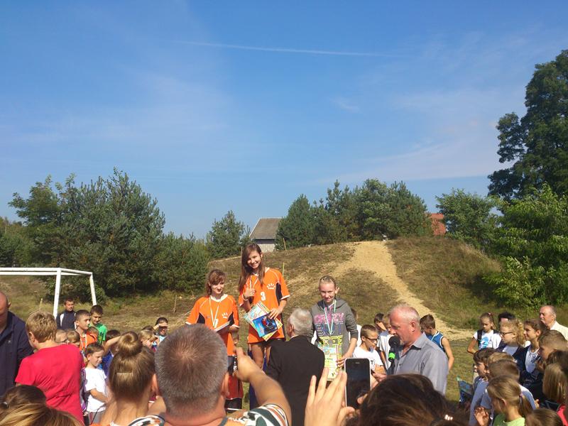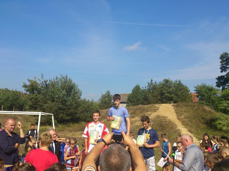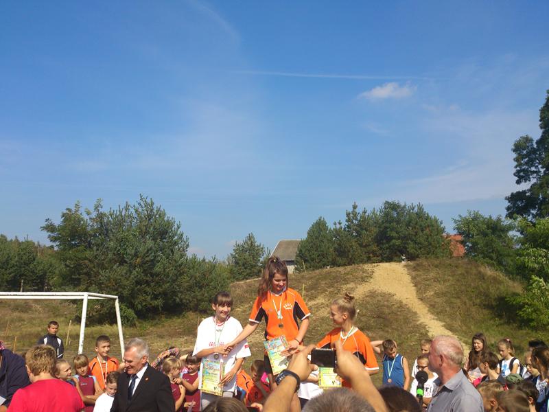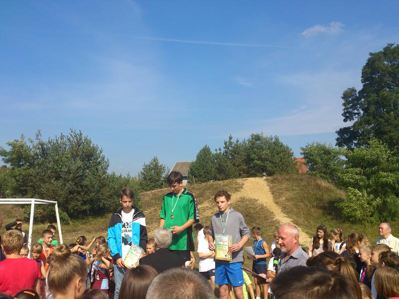 Nie mogło zabraknąć naszej reprezentacji, w której skład wchodzili uczniowie szkoły podstawowej i gimnazjum: Joanna Bińkiewicz, Sylwia Grzegorczyk, Dariusz Pietrusiński, Dominik Piotrowski, Bartłomiej Czerwiński, Julia Radecka, Rafał Marciniak, Anna Konarzewska, Aleksandra Kosińska oraz Bartosz Stępień, pod opieką p. Igora Hupało. Zawody te okazały się znakomitym rozpoczęciem nowego roku szkolnego. Powodem do dumy były zdobyte przez nas medale: złoty - wywalczony przez Rafała Marciniaka w kategorii chłopców klas I gimnazjalnych, dwa srebrne dla Joanny Bińkiewicz i Dariusza Pietrusińskiego z klasy III gimnazjum, oraz dwa brązowe dla Julii Radeckiej- klasa I gimnazjum i Dominika Piotrowskiego- klasa II gimnazjum. Trasa, z którą zmagali się uczestnicy biegu liczyła łącznie 800m. Nie była jednak prosta -zawodnicy musieli pokonać górkę, której nie darzą sympatią, gdyż pokonanie jej wymaga wiele wytrwałości. Mimo tego, nasza reprezentacja bardzo dobrze sobie poradziła. Po męczącym biegu wysiłek uczestników docenili organizatorzy- każdy mógł liczyć na ciepły posiłek i wspaniałe nagrody.