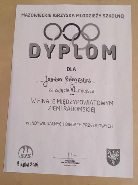 Młodzi Sportowcy naszego gimnazjum kolejny rok z rzędu mogą pochwalić się wspaniałymi wynikami, a mianowicie Joanna Bińkiewicz, która będzie reprezentować naszą szkołę, gminę i powiat w finale XVII MIMS, w biegach przełajowych w Piastowie koło Radomia. Na zawodach międzypowiatowych Asia zajęła VI miejsce, co jest bardzo dobrym wynikiem. Nie dużo zabrakło do zakwalifikowania się na finał XVII MIMS pozostałym reprezentantom naszej szkoły: Sylwii Grzegorczyk, Darkowi Pietrusińskiemu, Julii Radeckiej, Bartkowi Czerwińskiemu, Dominikowi Piotrowskiemu i Oli Kosińskiej. Codzienna praca w szkole, na lekcjach wychowania fizycznego i dodatkowe zajęcia przynoszą wymierne efekty. Serdeczne gratulacje.