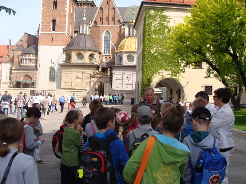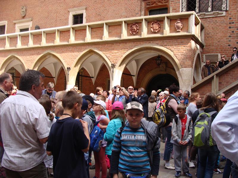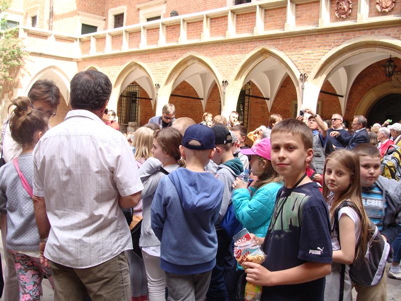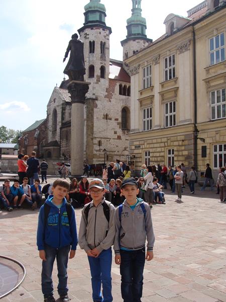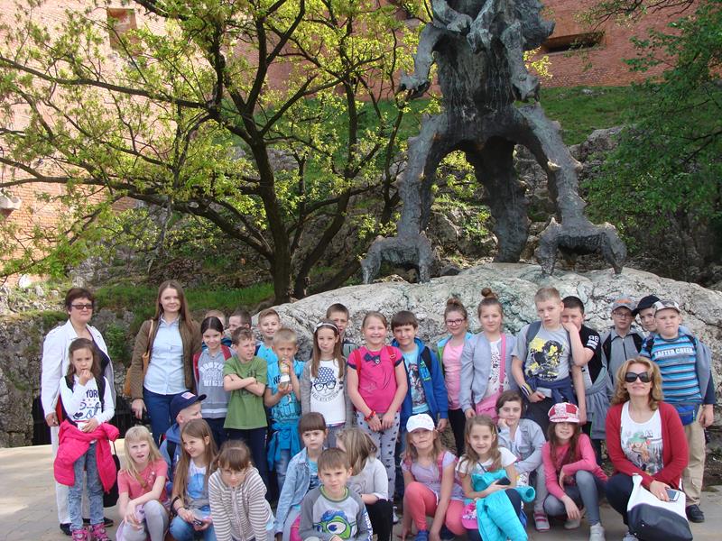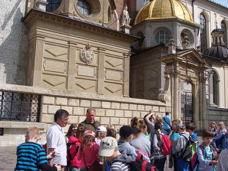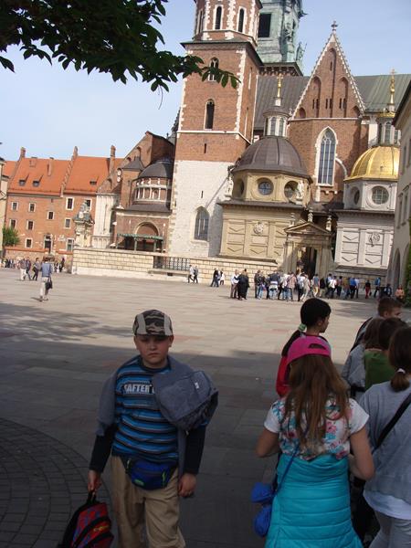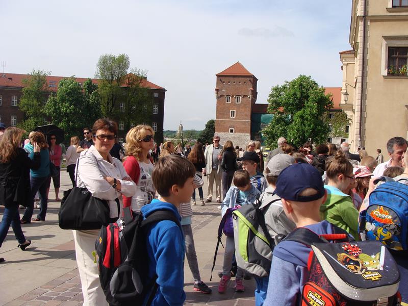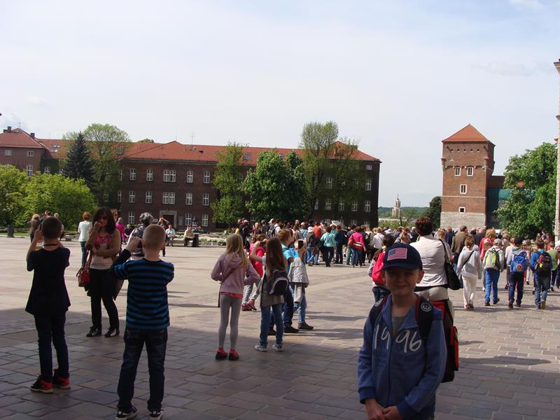 Drugi dzień wycieczki rozpoczęliśmy od zwiedzania Krakowa. Pan przewodnik opowiadał o historii i zabytkach dawnej stolicy Polski. Zwiedzanie Krakowa rozpoczęliśmy od obejrzenia ziejącego ogniem Smoka Wawelskiego. Podziwialiśmy Katedrę na Wawelu, oglądaliśmy położone w jej podziemiach groby władców i wielkich Polaków. Również piękny i bogaty w zabytki był Rynek Starego Miasta, gdzie widzieliśmy Sukiennice, Bazylikę Mariacką z niezwykłym ołtarzem Wita Stwosza. Spacerując doszliśmy do Pałacu Biskupiego z oknem papieskim. Po zakupie kolejnych pamiątek pojechaliśmy do ostatniego punktu naszej wycieczki - Muzeum Orła Białego. W muzeum posiadającym największą w kraju kolekcję ciężkiego sprzętu bojowego oglądaliśmy działa artyleryjskie, armaty przeciwpancerne i przeciwlotnicze, wyrzutnie rakietowe, czołgi, wozy pancerne i samoloty wojskowe różnego przeznaczenia. Poza plenerową ekspozycją zwiedzaliśmy również sale muzealne z dokumentami i materiałami dotyczącymi działalności partyzanckiej na Kielecczyźnie, Polskiego Państwa Podziemnego i walki o wolność.